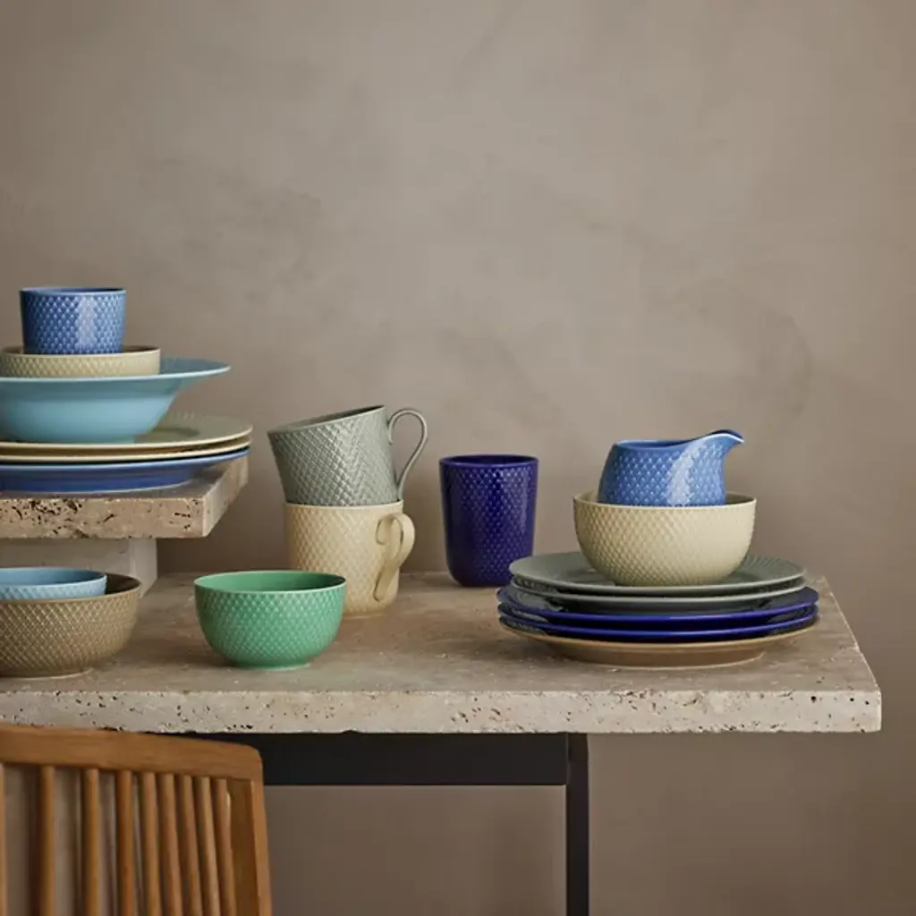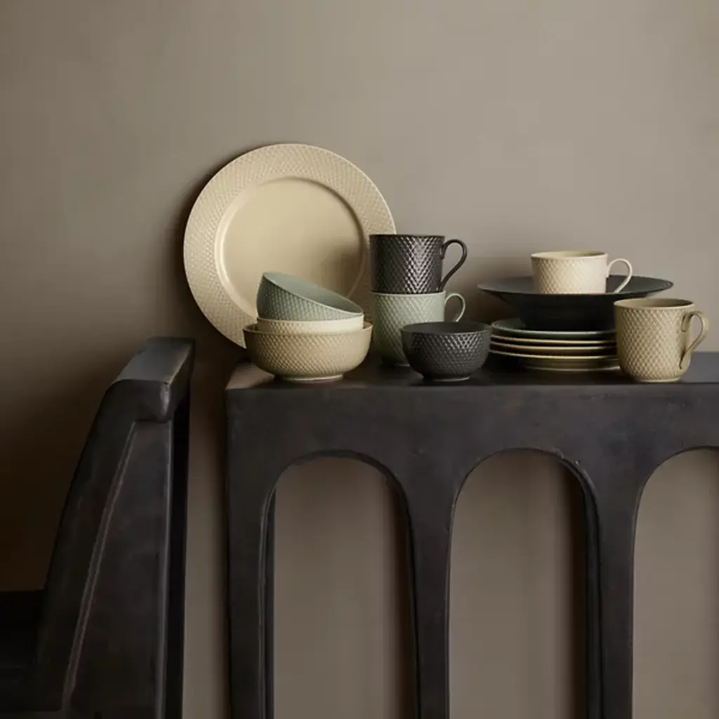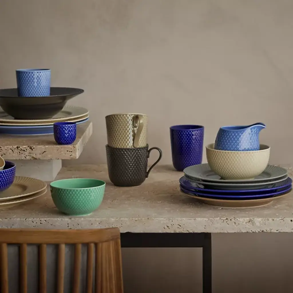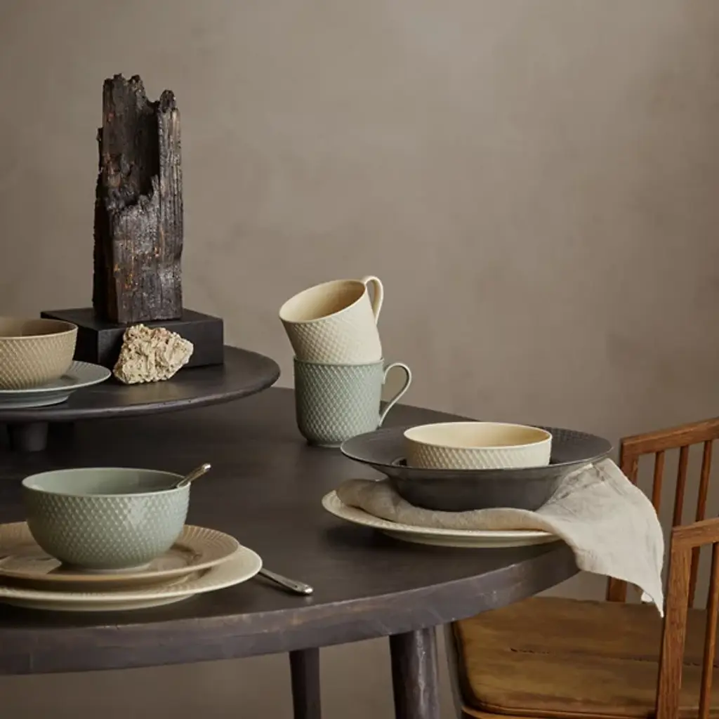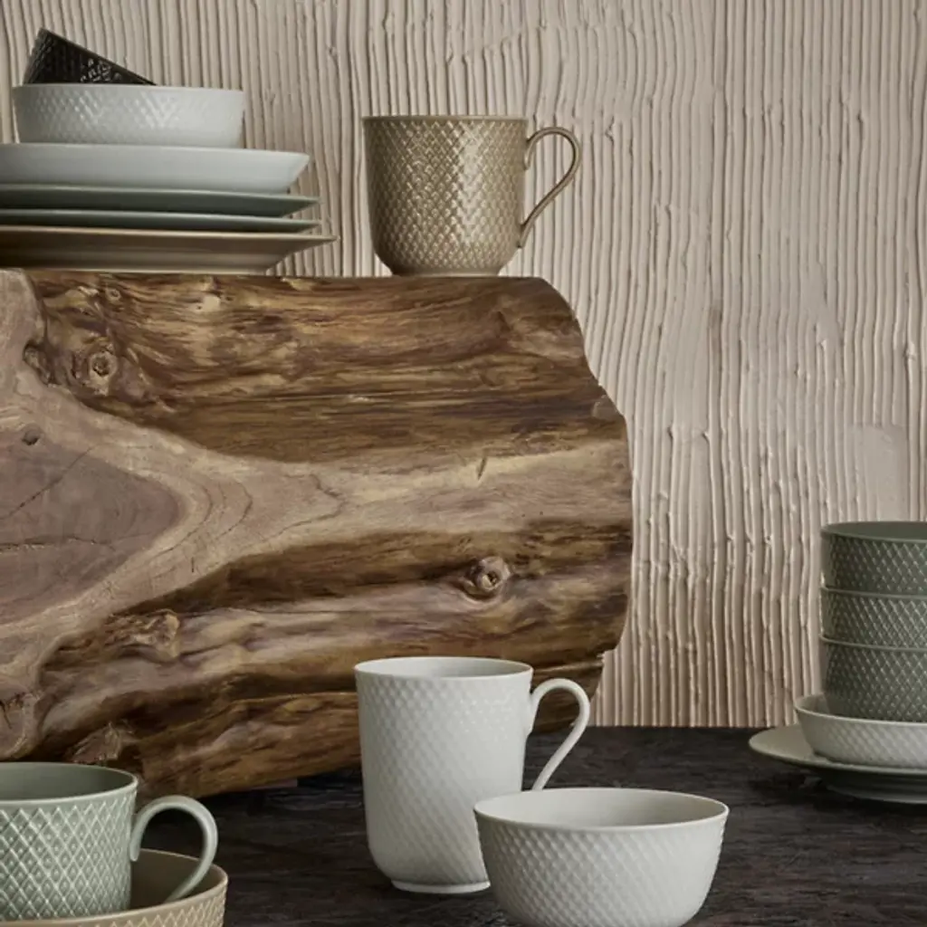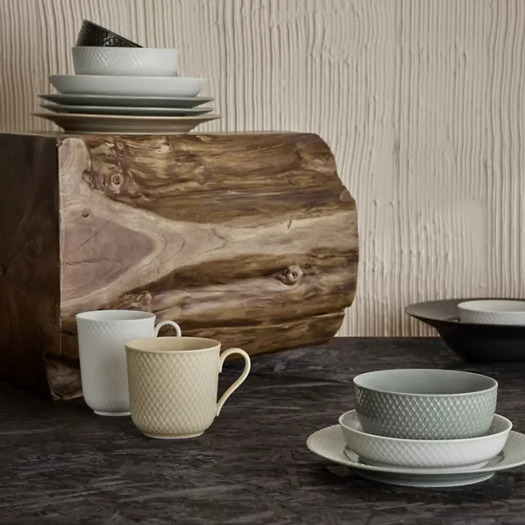 The Rhombe Earth Mug with Handle, Set of 4 from Lyngby Porcelaen presents a sleek, enduring example of Danish minimalism, defined by thoughtful exterior patterns. Ditte Reckweg and Jelena Schou Nordentoft of Stilleben designed each porcelain mug, featuring a slightly flaring rim and a slender handle that rests comfortably in the hand. Offered in natural hues that complement the classic white Rhombe collection, the mugs are dishwasher- and microwave-safe, uniting everyday function with refined design.