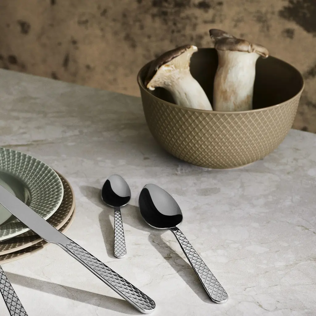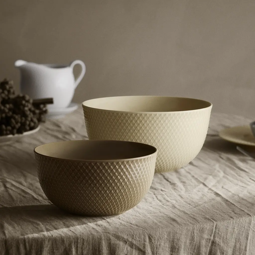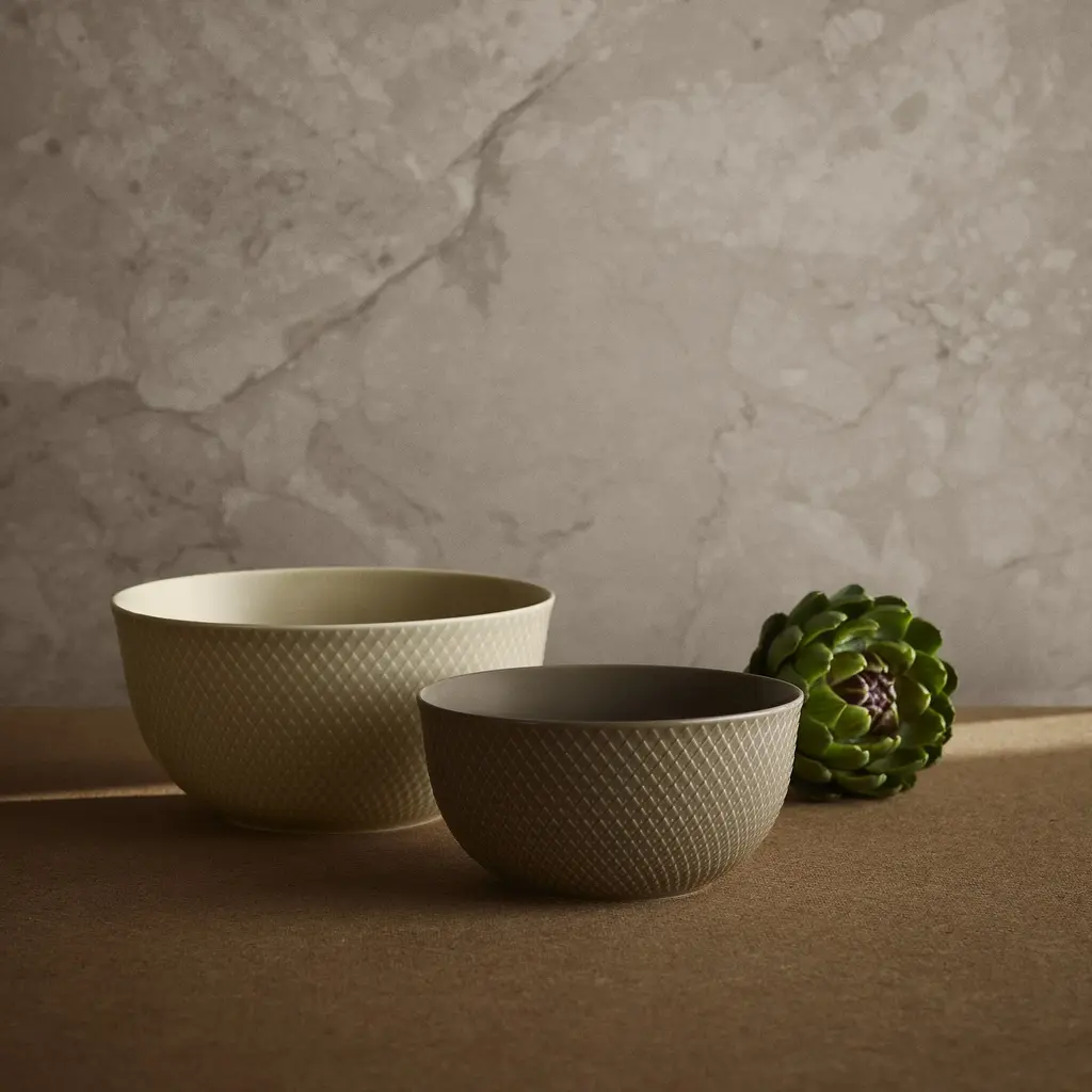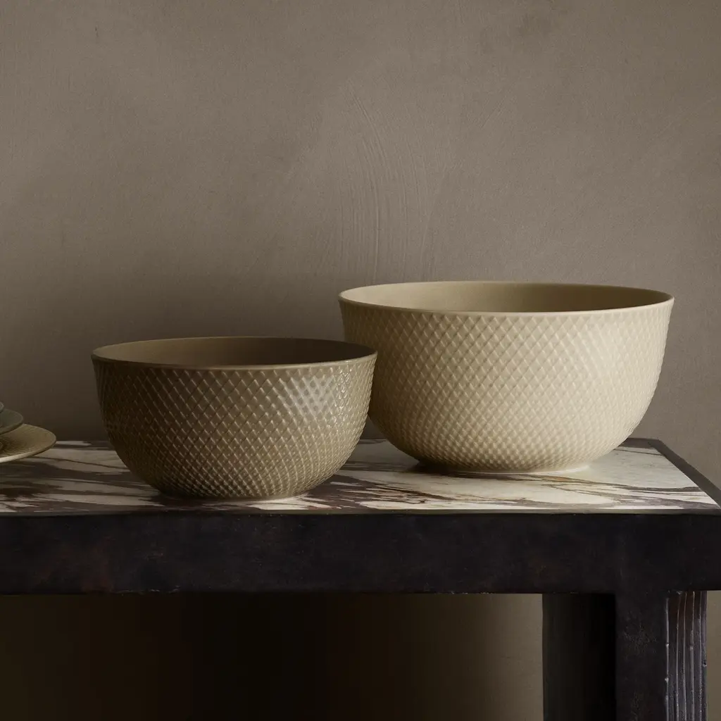 With a sophisticated, earthy color palette, the Rhombe Earth Serving Bowl from Lyngby Porcelaen brings mindful elegance to the table. This porcelain bowl features the collection's signature Rhombe pattern, a subtle geometric relief pulled from the brand's archives. The warm, natural colors were carefully curated by the design duo Stilleben to create an inviting atmosphere. This set of four is perfect for serving salads or side dishes, designed to be mixed and matched for a modern, relaxed aesthetic. Highlights: