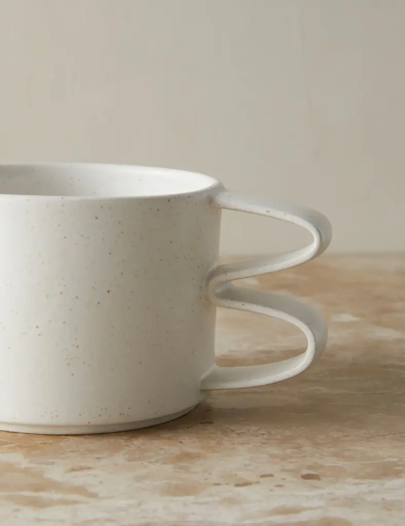 Enrich your daily pour with an artful set of mugs. The ribbon-like handle fashions an eye-catching silhouette you'll love picking up and holding in hand. This mug set is from our exclusive Sarah Sherman Samuel collaboration and features all the trademarks of her warm, edited style.