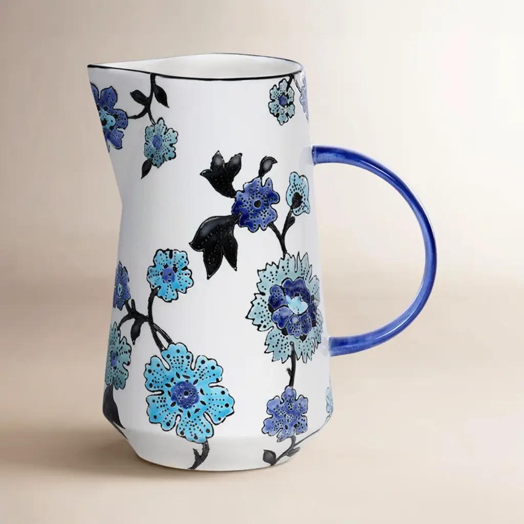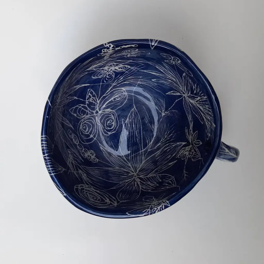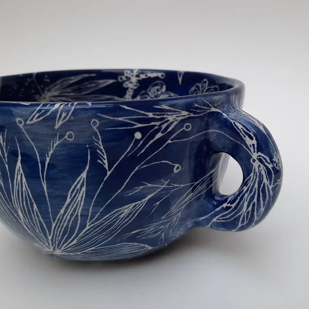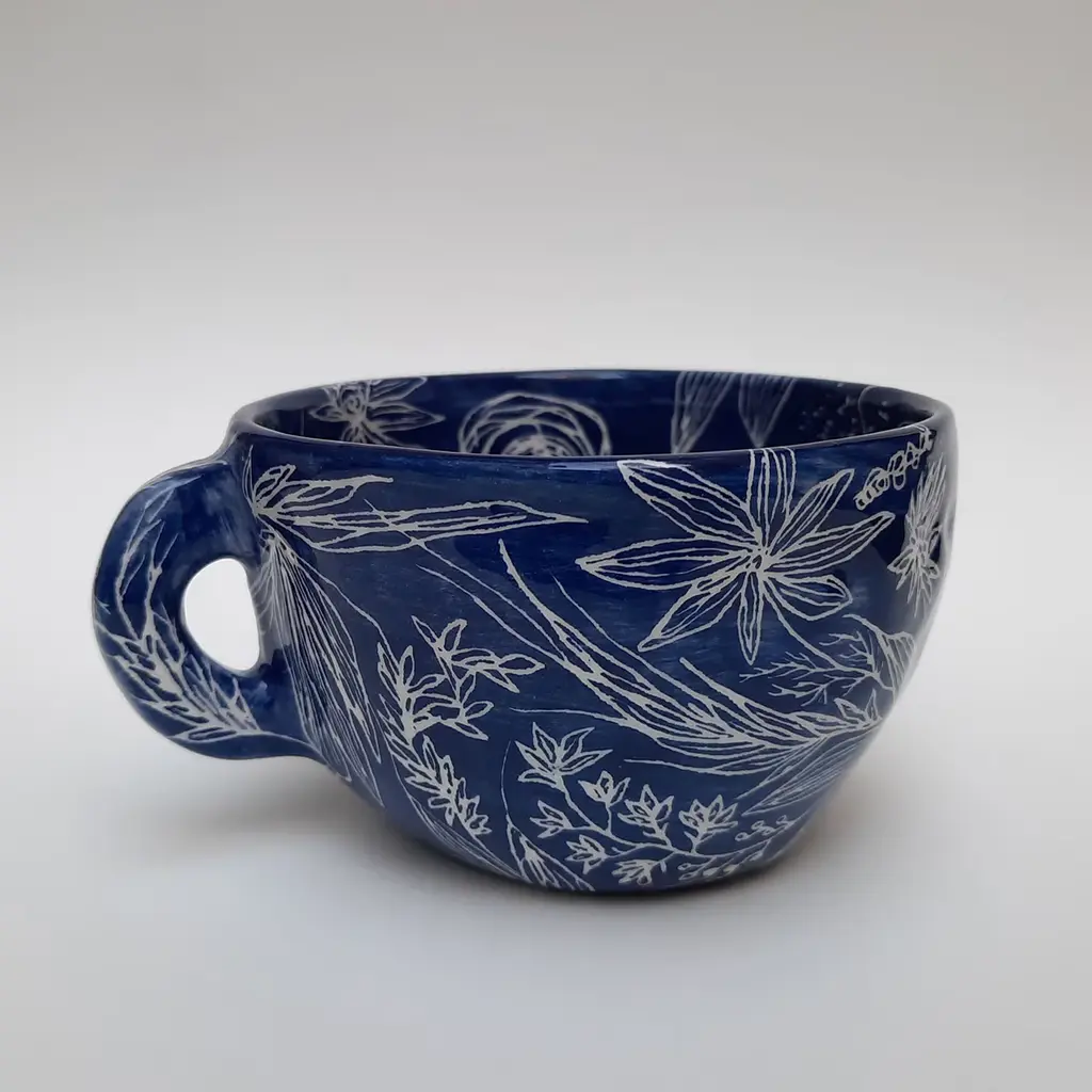 This elegant teacup is perfect for sipping tea in a piece that celebrates the poetry of nature and the preciousness of artisan pottery. Handcrafted in a minimalist shape and painted by hand in an intense blue shade, it boasts minute etchings of flowers and leaves extending seamlessly on the inside and outside, recalling fine manual embroidery.