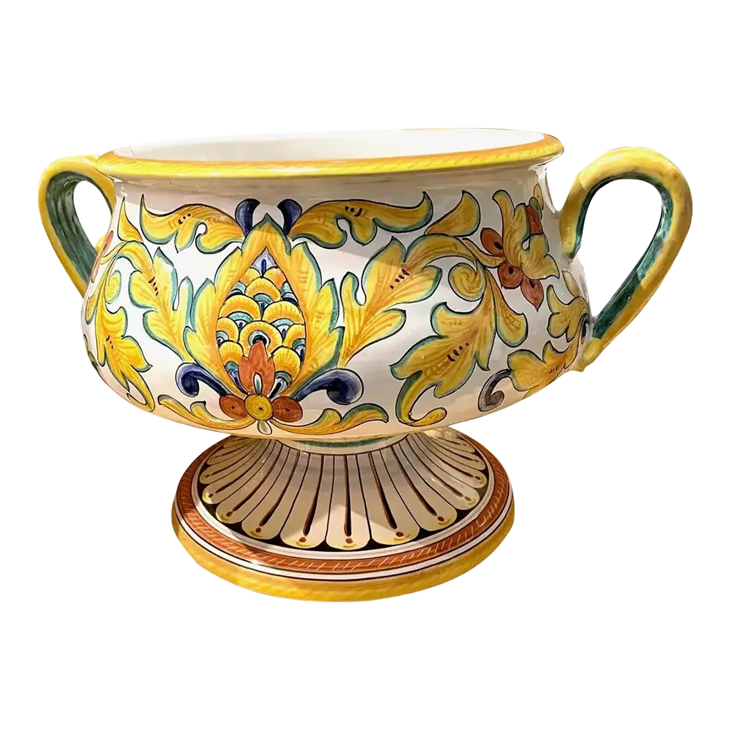 RICCO DERUTA Collection: This is the true original version of the most celebrated Deruta's design, which traces its origins to the sixteenth century. Masterfully hand painted with the original royal blue, yellow gold, and emerald green, subtle color creating a brilliant elegance to bring royal elegance to your table. Hand made in Deruta-Italy. All Deruta of Italy products are lead and cadmium Free. Dishwasher Safe Not recommended for microwave use. Size (inches): 10 Oz. (3.25 DIAM. x 3.75 HIGH)
