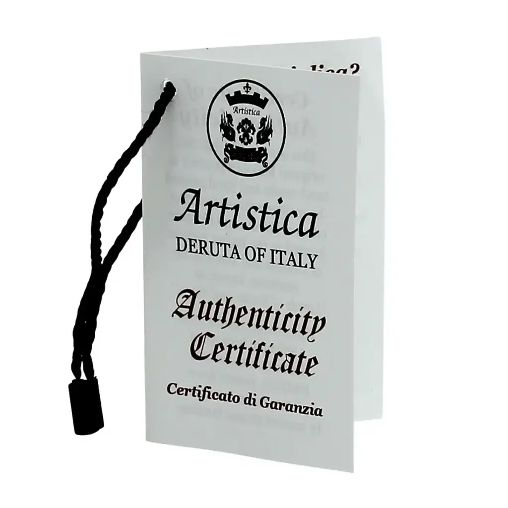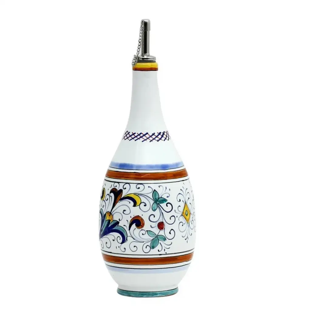 RICCO DERUTA Collection: This is the true original version of the most celebrated Deruta's design, which traces its origins to the sixteenth century. Masterfully hand painted with the original royal blue, yellow gold, and emerald green, subtle color creating a brilliant elegance to bring royal elegance to your table. Hand made in Deruta-Italy. All Deruta of Italy products are lead and cadmium Free. Dishwasher Safe Not recommended for microwave use. Comes with silicone or cork stainless steel pourer with cap. - 100% Food Safe - Earthenware Ceramic - Hand Made & Hand Painted in Deruta-Italy. Size: Bottle 4 DIAM. X 10 HIGH Bottle holds 24 Oz.