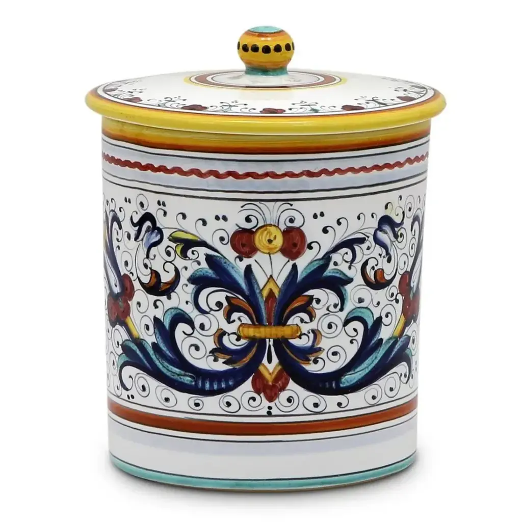 RICCO DERUTA Collection: This is the true original version of the most celebrated Deruta's design, which traces its origins to the sixteenth century. Masterfully hand painted with the original royal blue, yellow gold, and emerald green, subtle color creating a brilliant elegance to bring royal elegance to your table. Hand made in Deruta-Italy. All Deruta of Italy products are lead and cadmium Free. Dishwasher Safe Not recommended for microwave use. Size (inches): 6 WIDE X 10 High (2 Liters)
