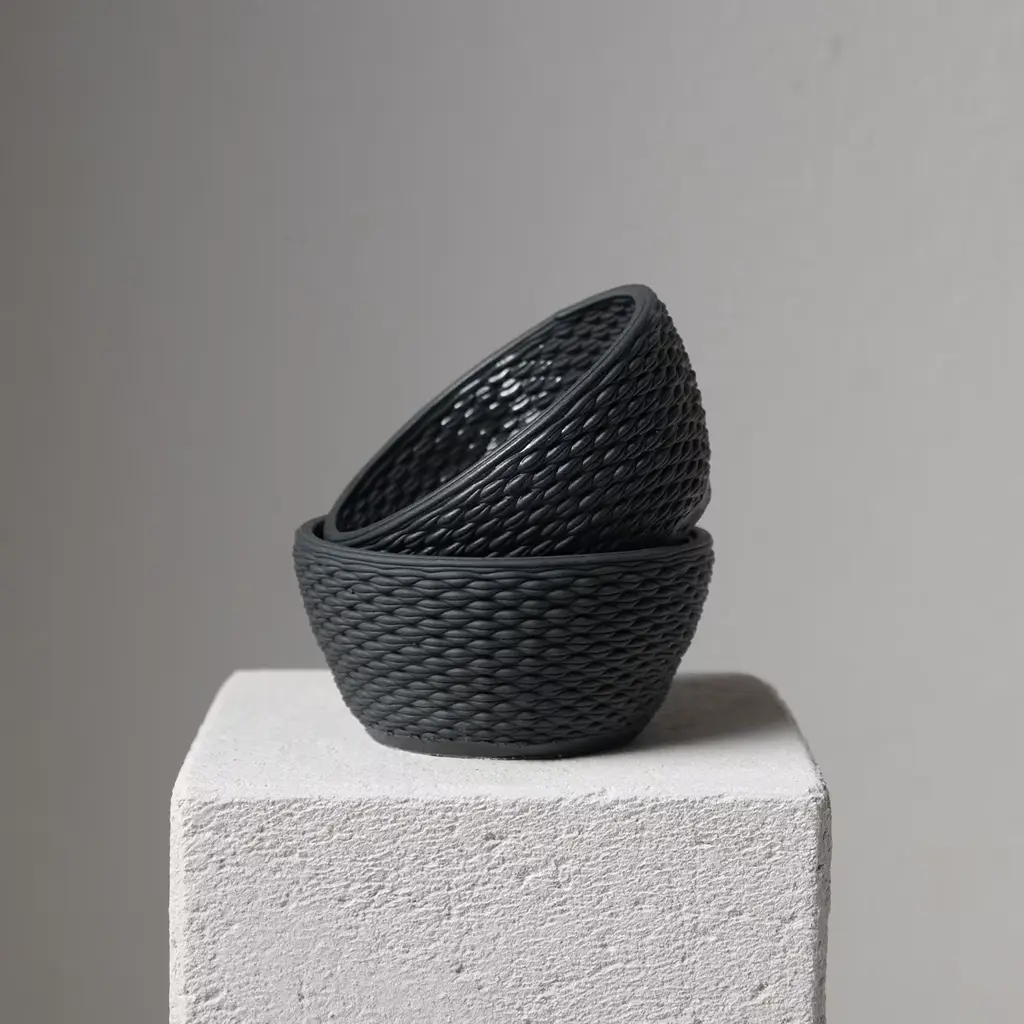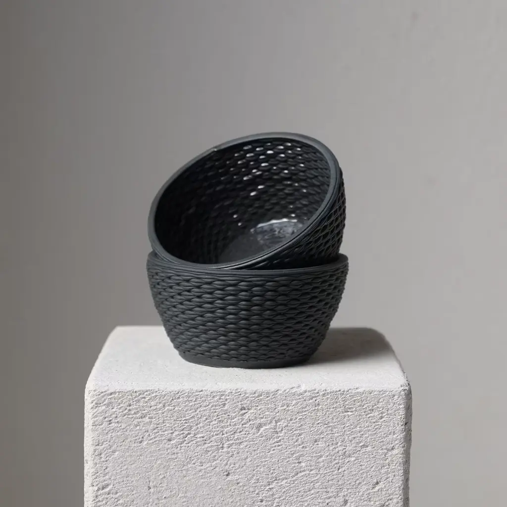 The baskets used to retain ricotta curd inspired the superb design of the four black cups making up this set fashioned of fine porcelain, their unrepeatable aesthetic achieved by combining manual steps with 3D printing technology. The interior gets glazed to safely host liquids, while the exterior is deliberately left raw for a more authentic feel. The cups can be safely washed in the dishwasher.