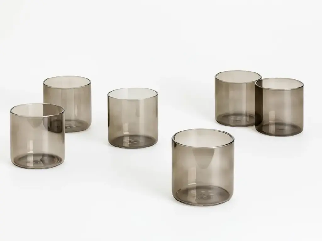 Riflessi is a set of 6 glasses in borosilicate glass available in transparent, smoked and petrol green colors.Each glass on the bottom has a different graphic element that recalls the faces of a dice: who will be the luckiest to have the highest number?The set consists of 6 glasses of the same color with the possibility of matching the transparent glass straw.
