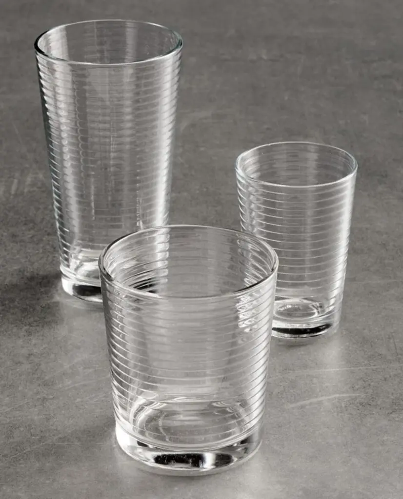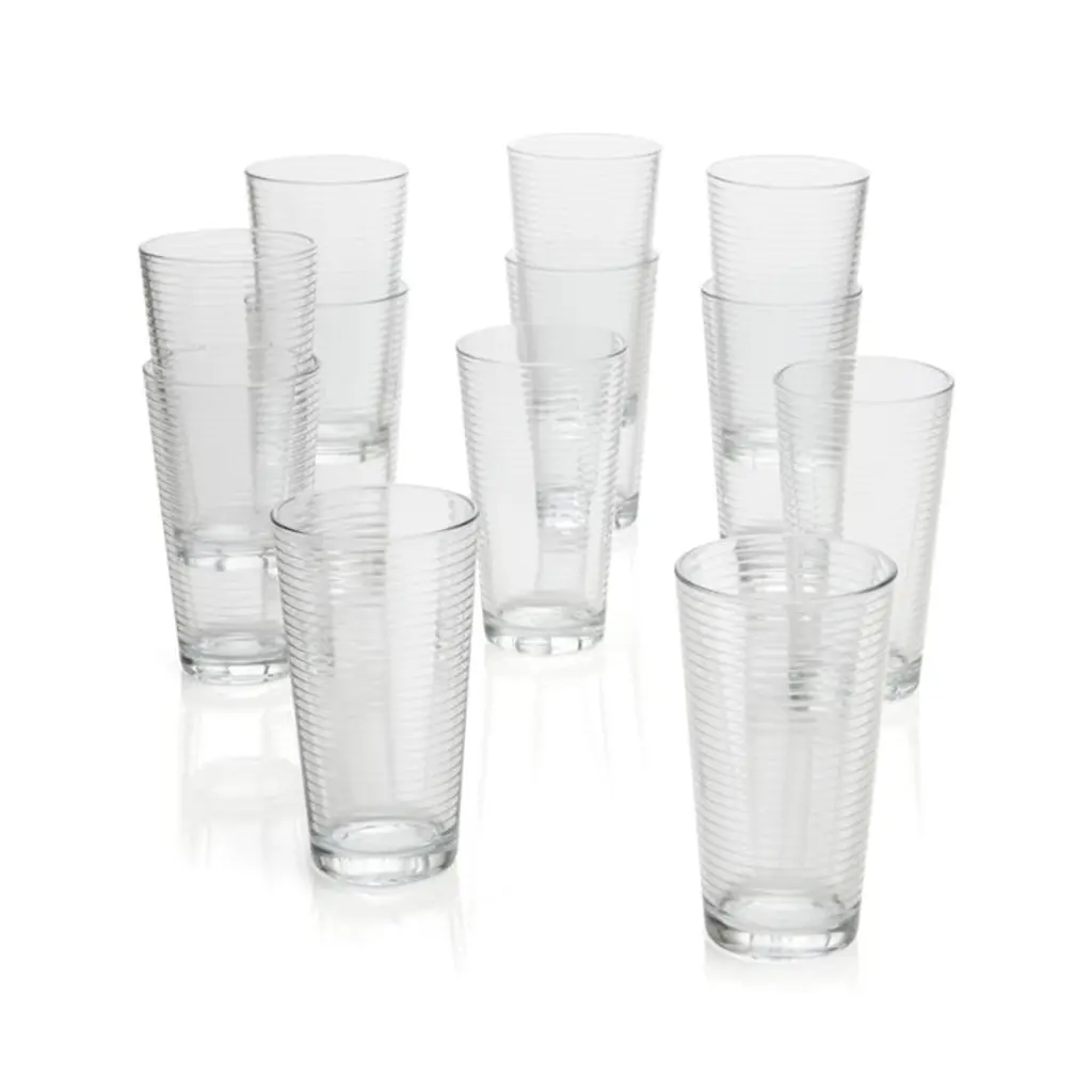 These ringed pint glasses have vintage charm and modern simplicity. Embossed with parallel rings from top to bottom, our cooler glasses are just the right size for an Arnold Palmer, a Bloody Mary, a beer or a refreshing drink of water. With their clean lines and classic shape, these twelve Rings cooler glasses look fantastic stacked on open shelving, on a bar cart, or in a glass-fronted cabinet. To complete your glassware collection, add our Rings double old-fashioned glasses and the pint-capacity cooler glasses.Check out our guide to selecting cocktail glasses.