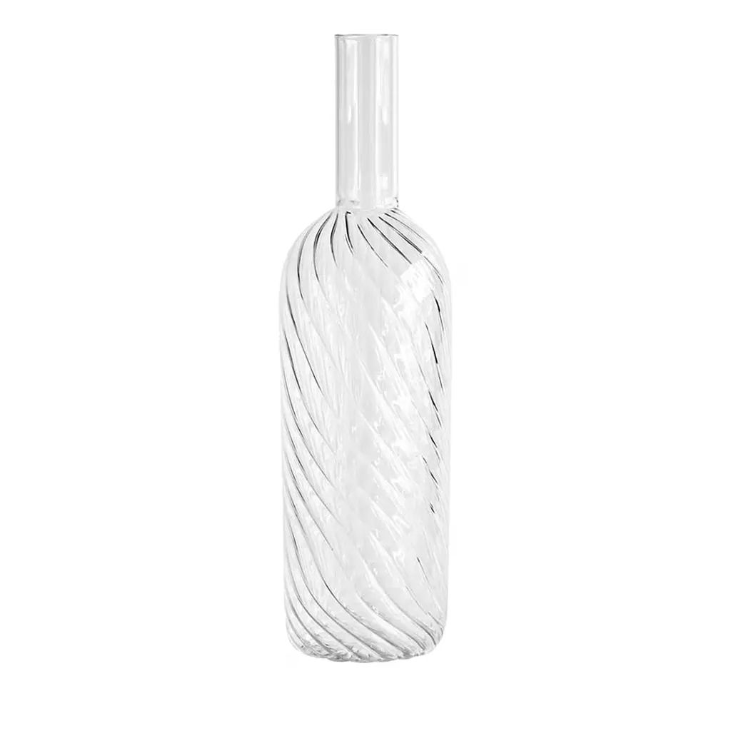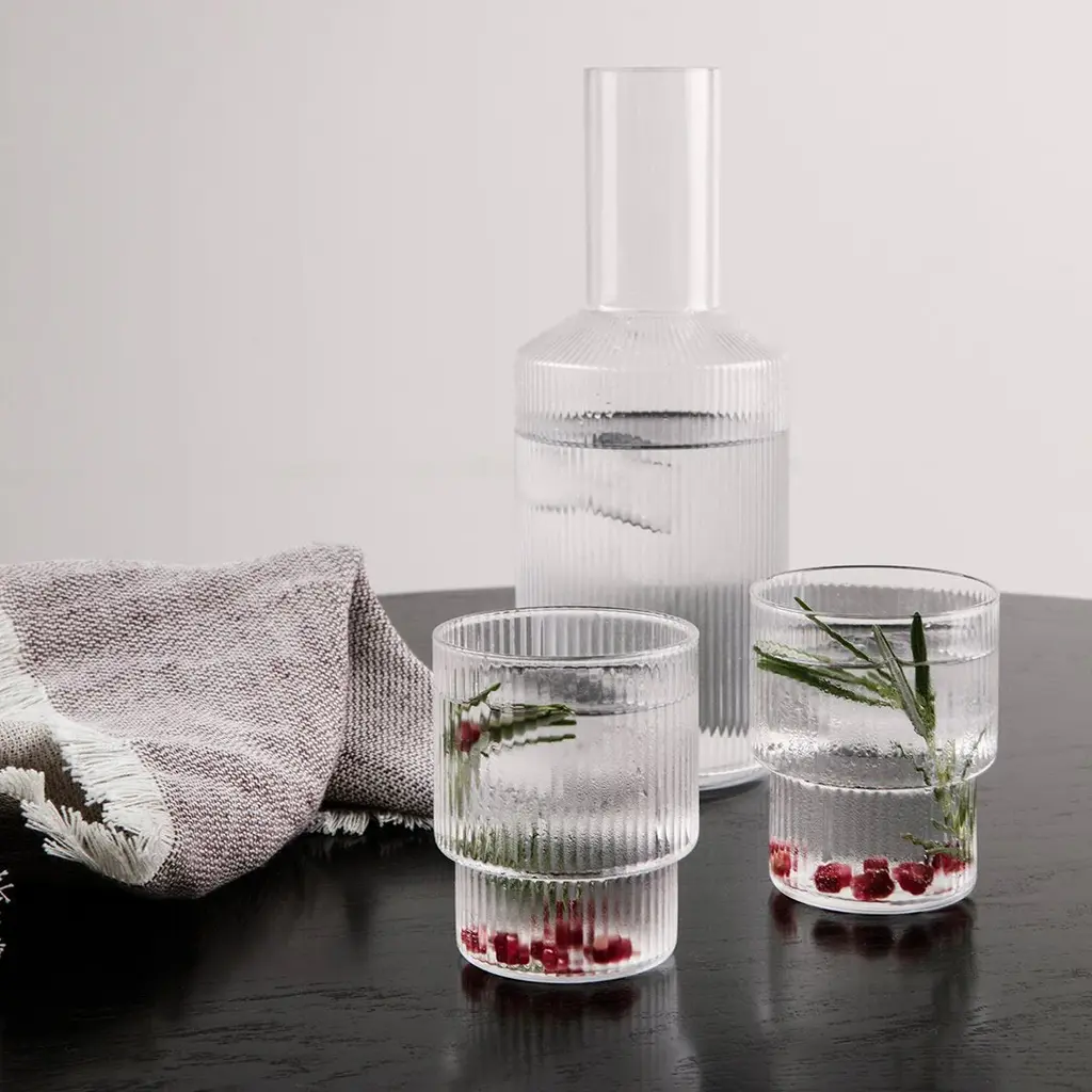 Mouth-blown into the mould, this practical and beautiful carafe features a rippled design for a contemporary look. Fill with water, juice or your favorite drink and pour into the matching set of glasses for a stylish way to serve.