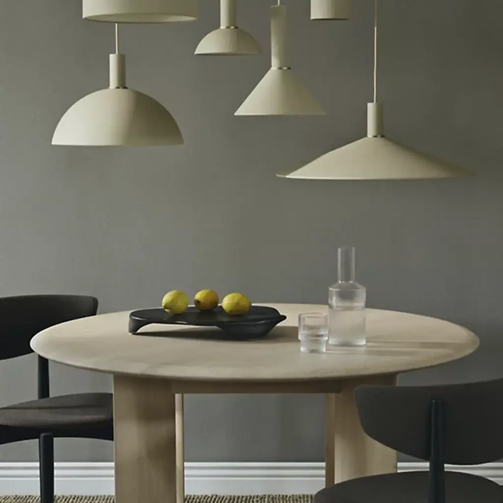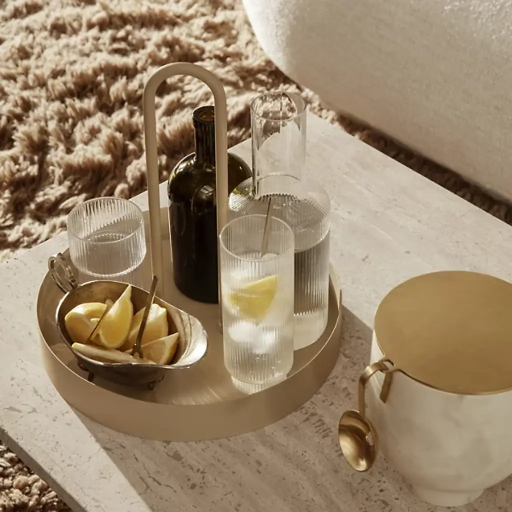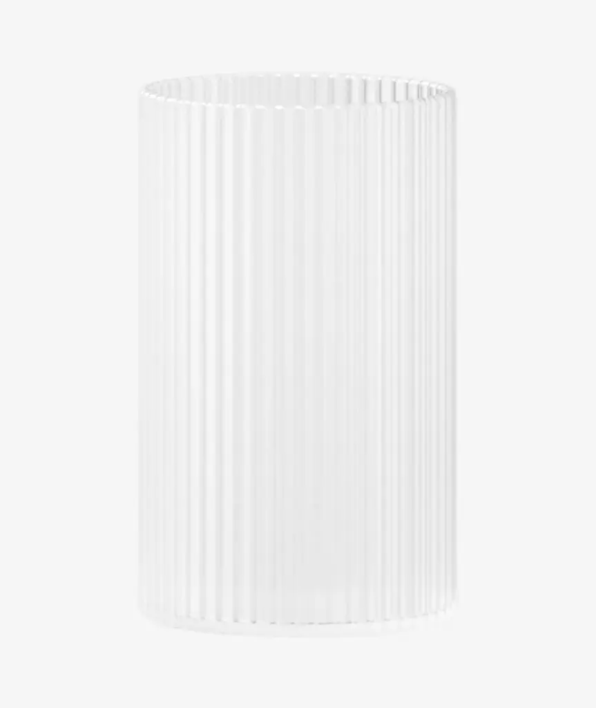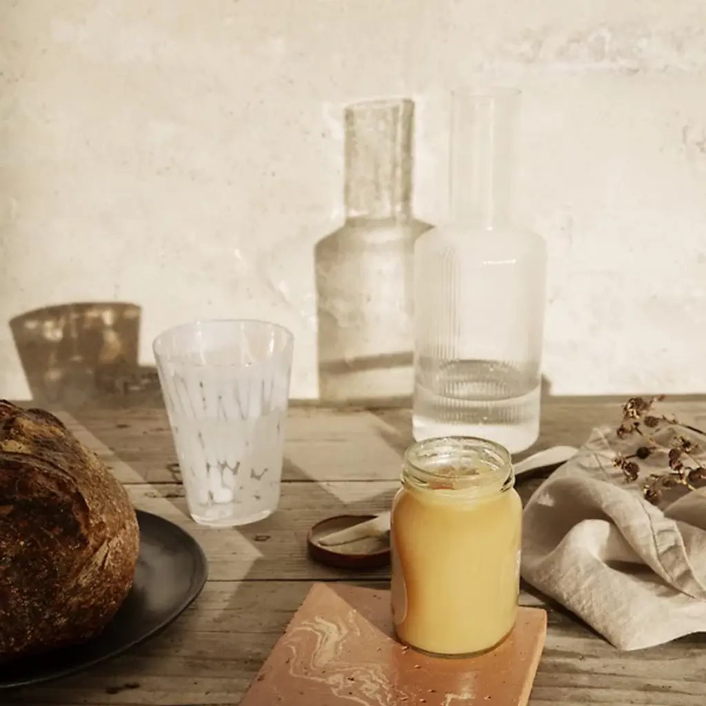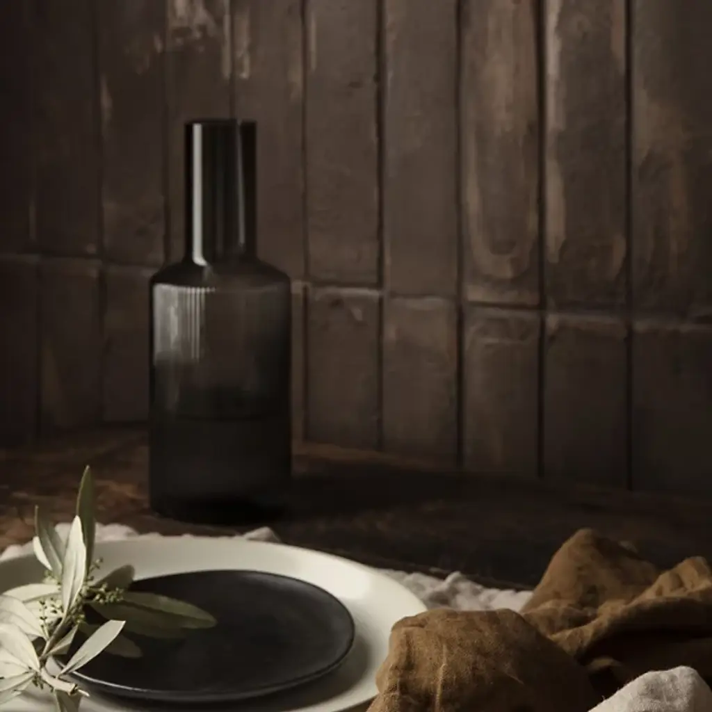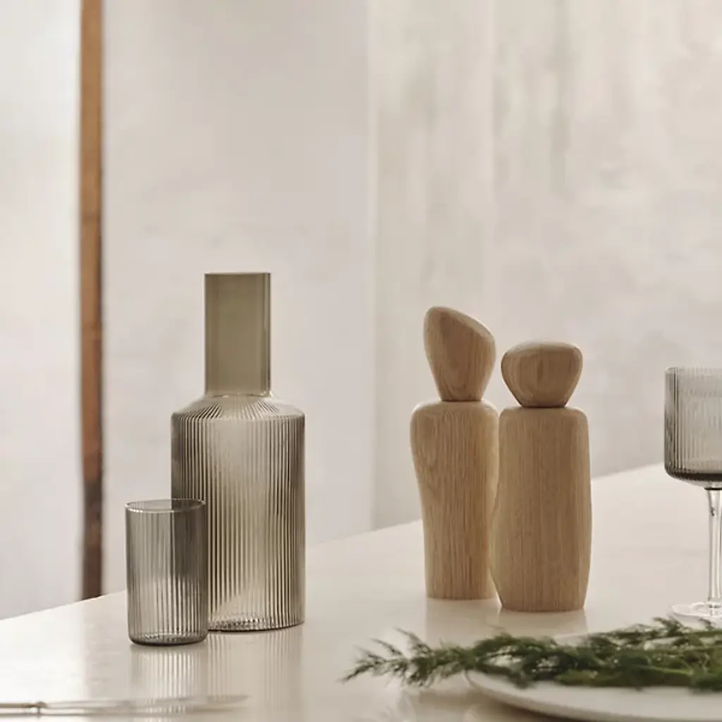 The Ripple Carafe from Ferm Living features vertical lines pressed into mouth-blown glass. The pattern provides grip while creating visual depth. This carafe pairs with matching glasses from the collection to create a unified table service. Its proportions balance serving capability with comfortable handling. The mouth-blown construction gives each piece subtle variations within the established form. This carafe functions as both a serving vessel and a table accent.