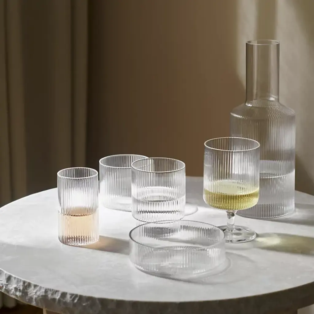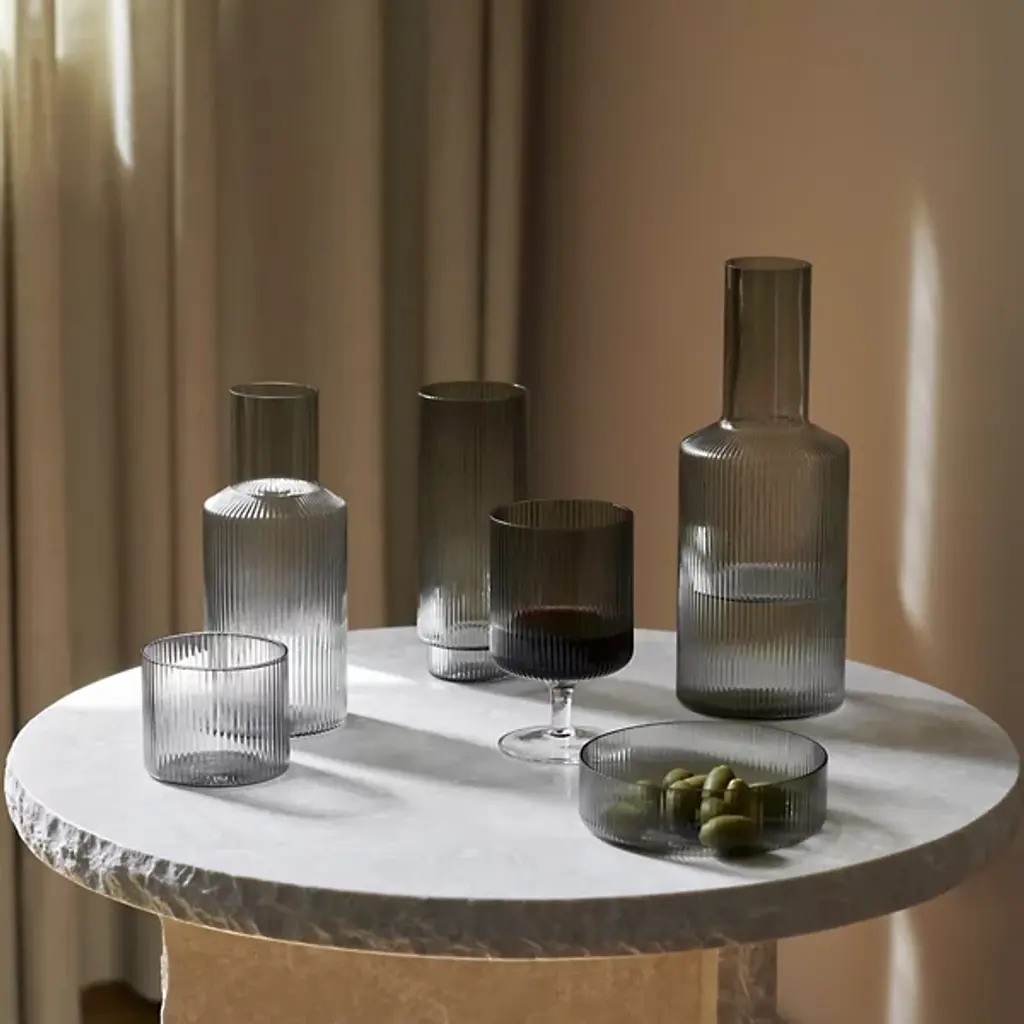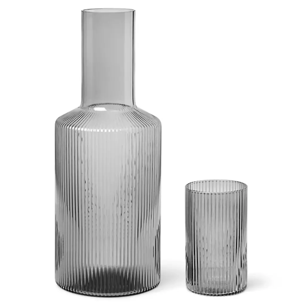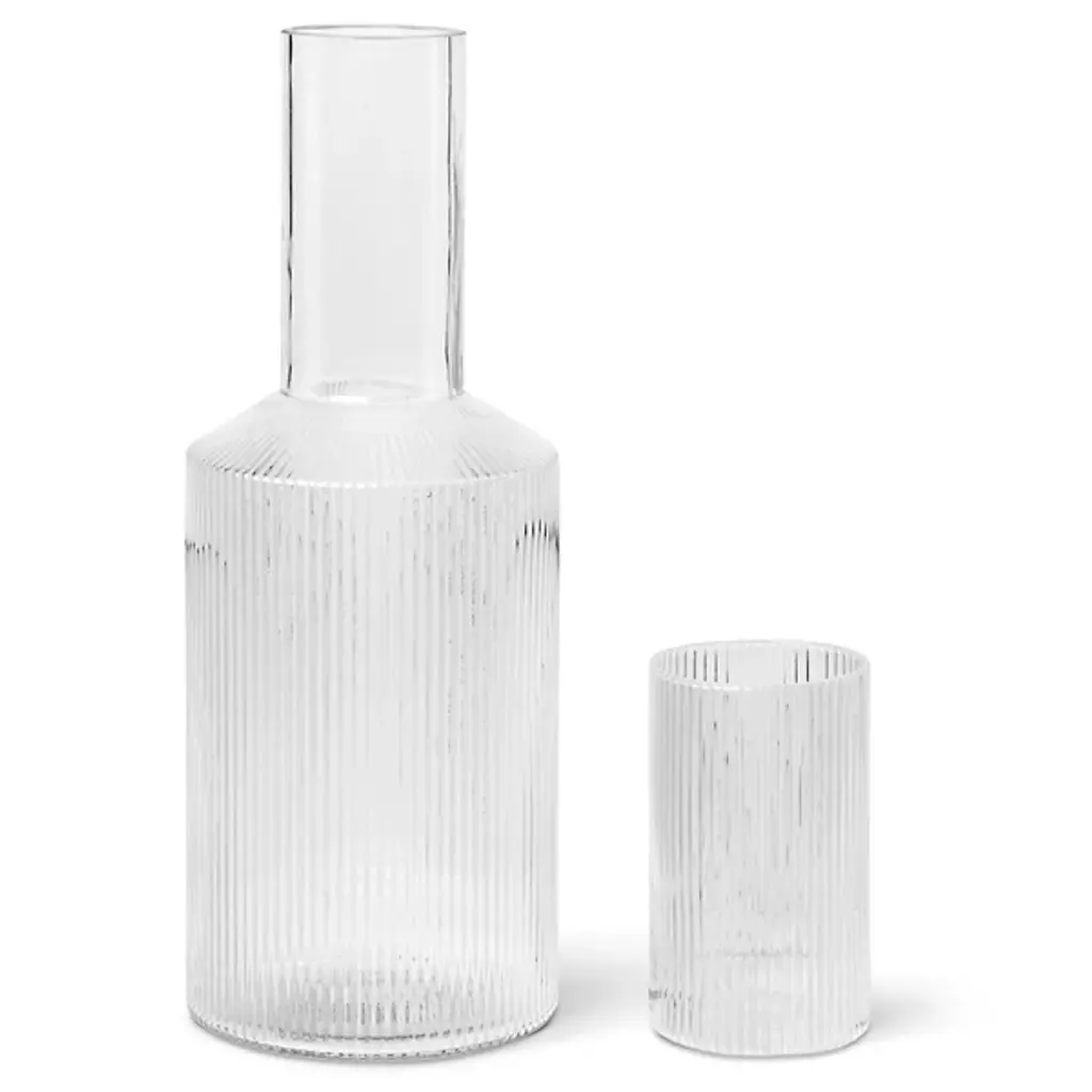 The Ripple Carafe from Ferm Living features vertical lines pressed into mouth-blown glass. The pattern provides grip while creating visual depth. This carafe pairs with matching glasses from the collection to create a unified table service. Its proportions balance serving capability with comfortable handling. The mouth-blown construction gives each piece subtle variations within the established form. This carafe functions as both a serving vessel and a table accent.