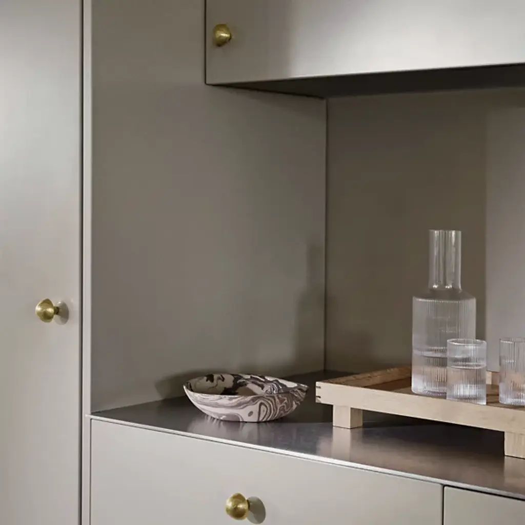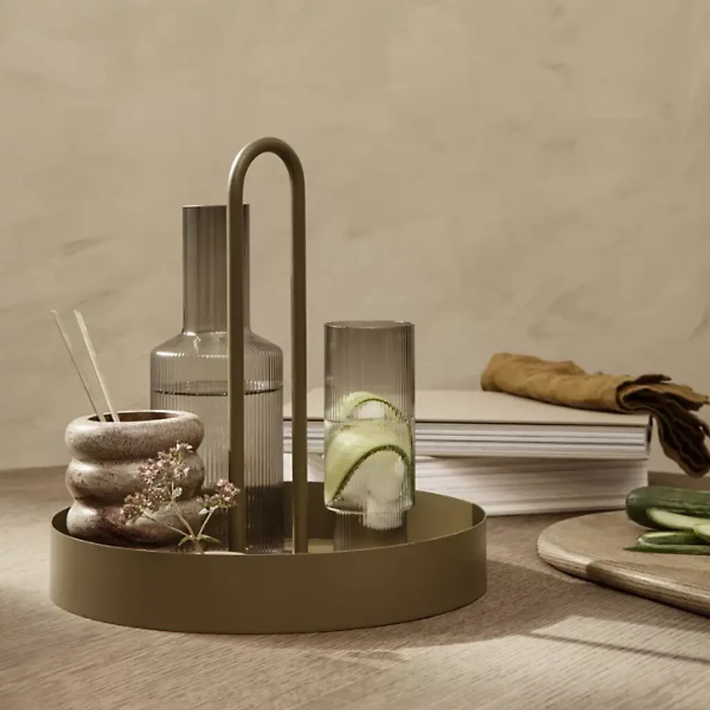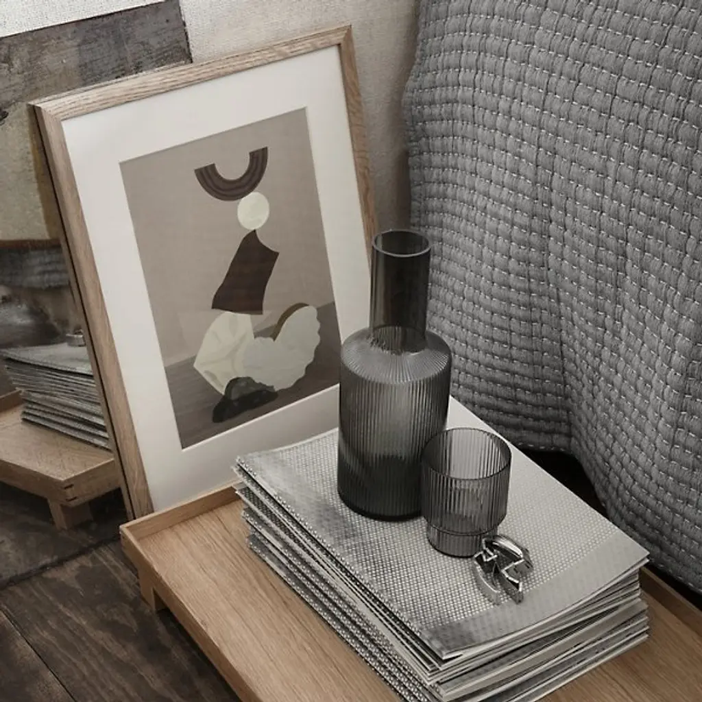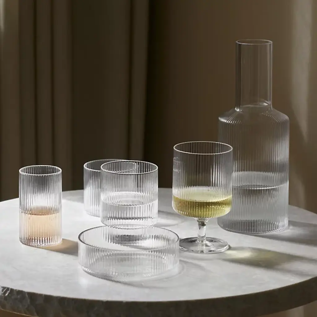 The Ripple Carafe from Ferm Living features vertical lines pressed into mouth-blown glass. The pattern provides grip while creating visual depth. This carafe pairs with matching glasses from the collection to create a unified table service. Its proportions balance serving capability with comfortable handling. The mouth-blown construction gives each piece subtle variations within the established form. This carafe functions as both a serving vessel and a table accent.