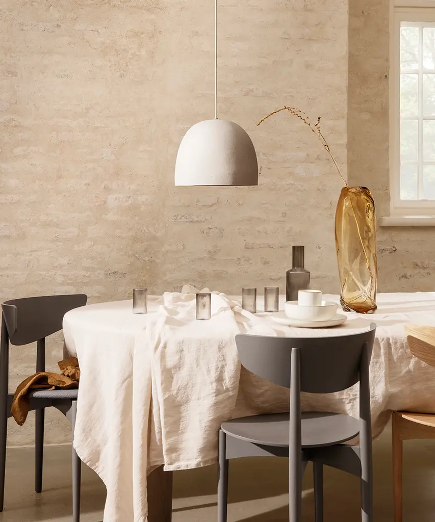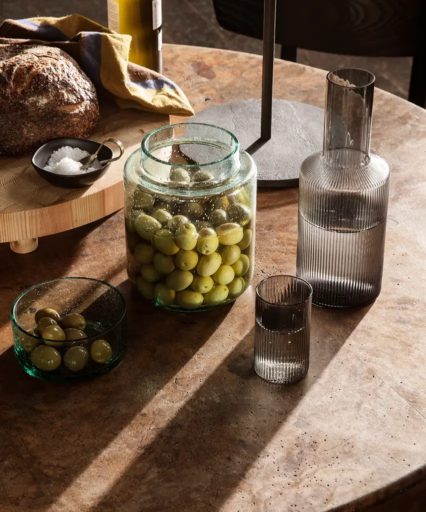 Mouth-blown into the mold, this practical and beautiful carafe features a rippled design for a contemporary look. Fill with water, juice, or your favorite drink and pour into the matching set of glasses for a stylish way to serve. Designed and produced by the Copenhagen-based studio Ferm Living.