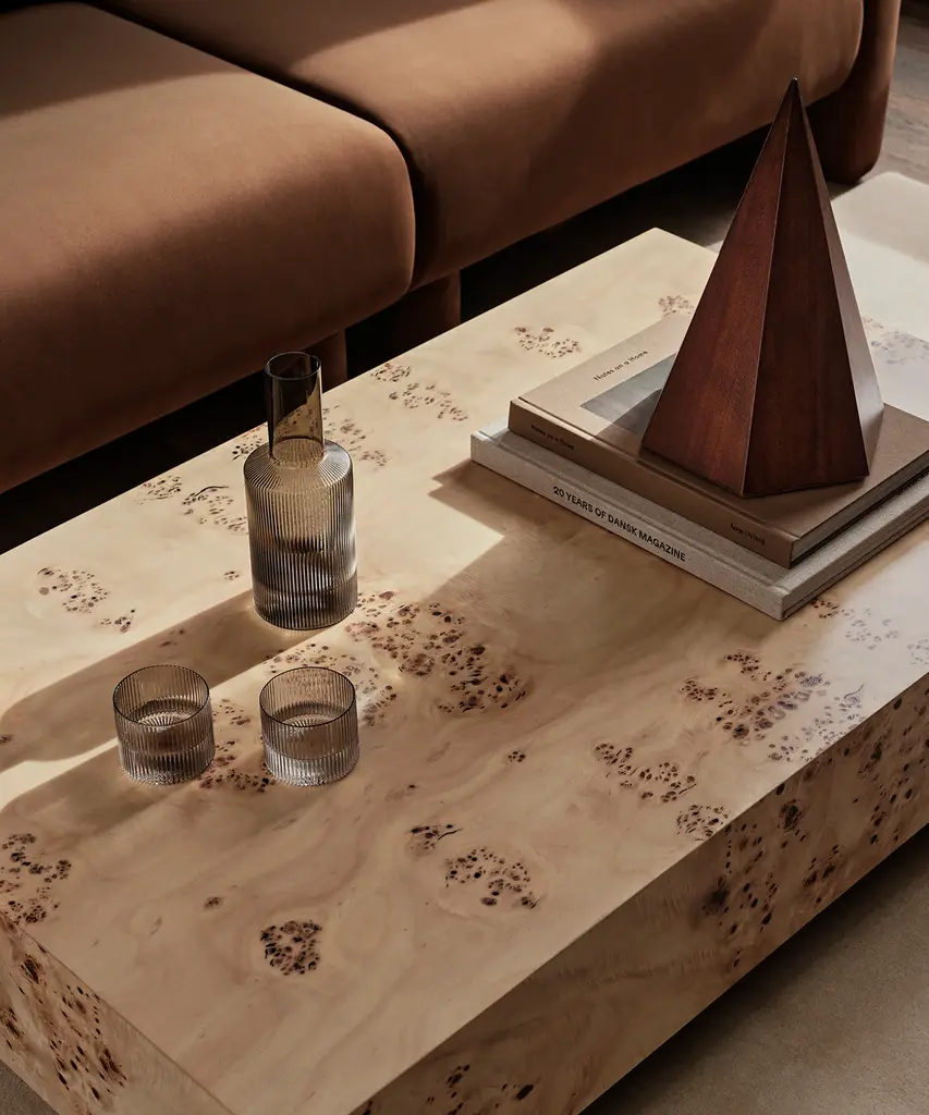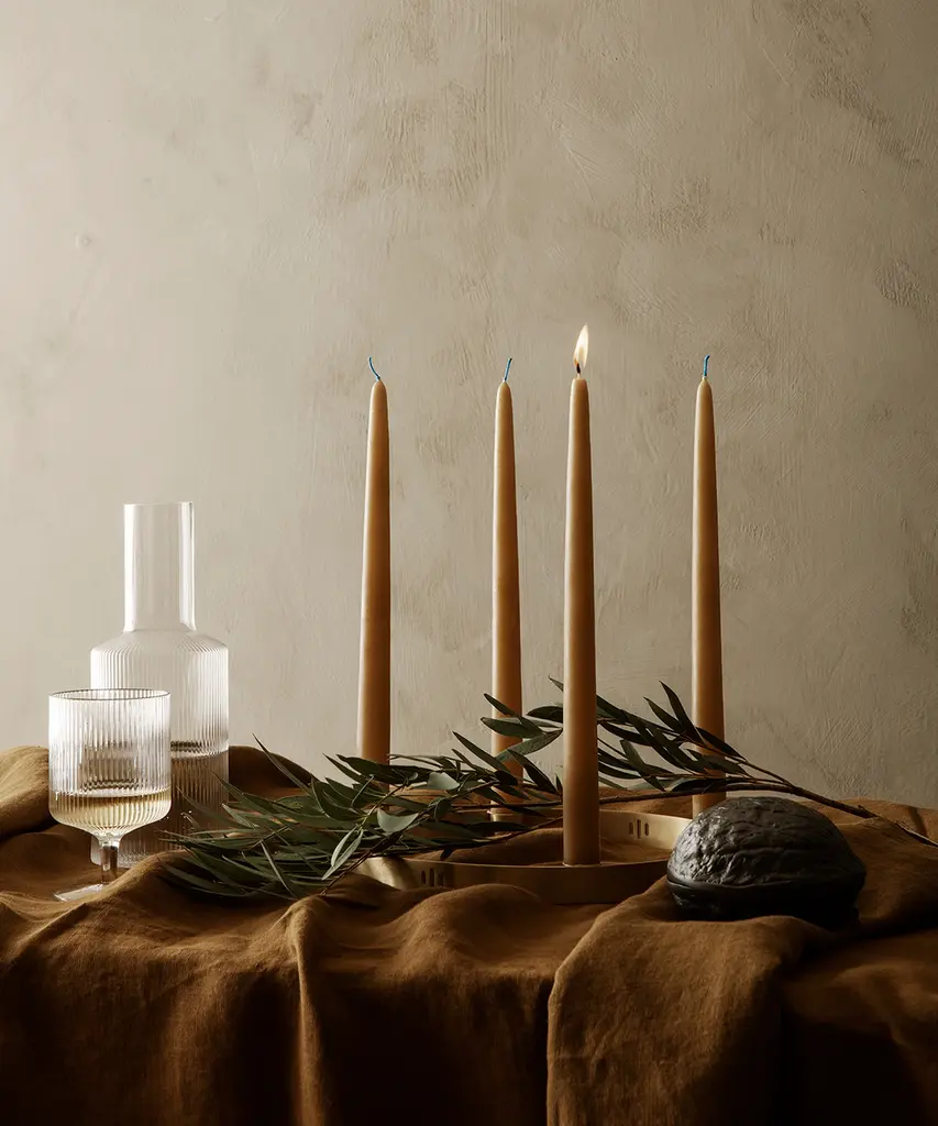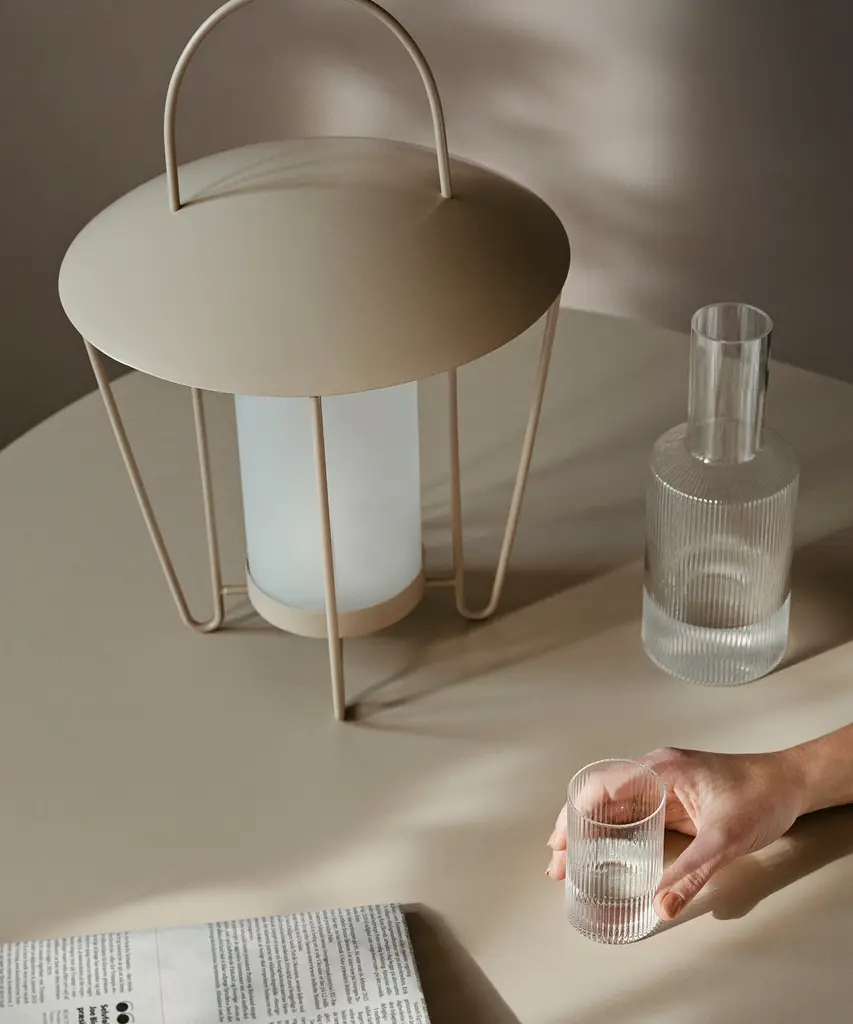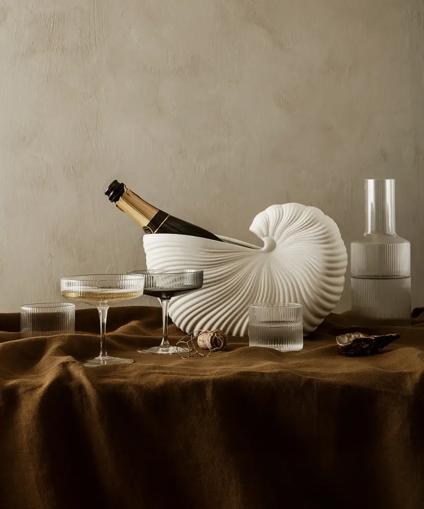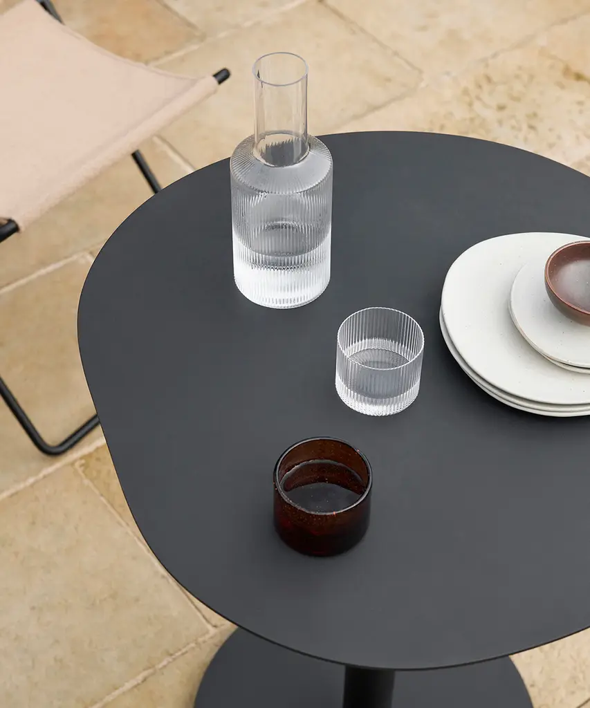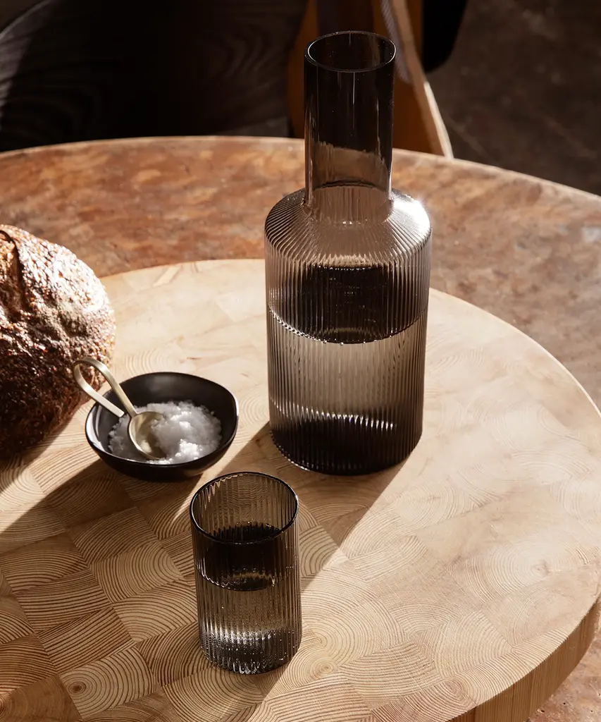 Mouth-blown into the mold, this practical and beautiful carafe features a rippled design for a contemporary look. Fill with water, juice, or your favorite drink and pour into the matching set of glasses for a stylish way to serve. Designed and produced by the Copenhagen-based studio Ferm Living.