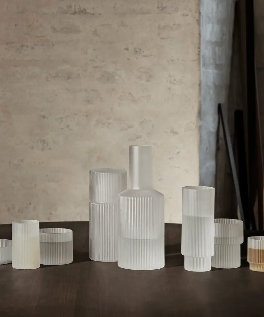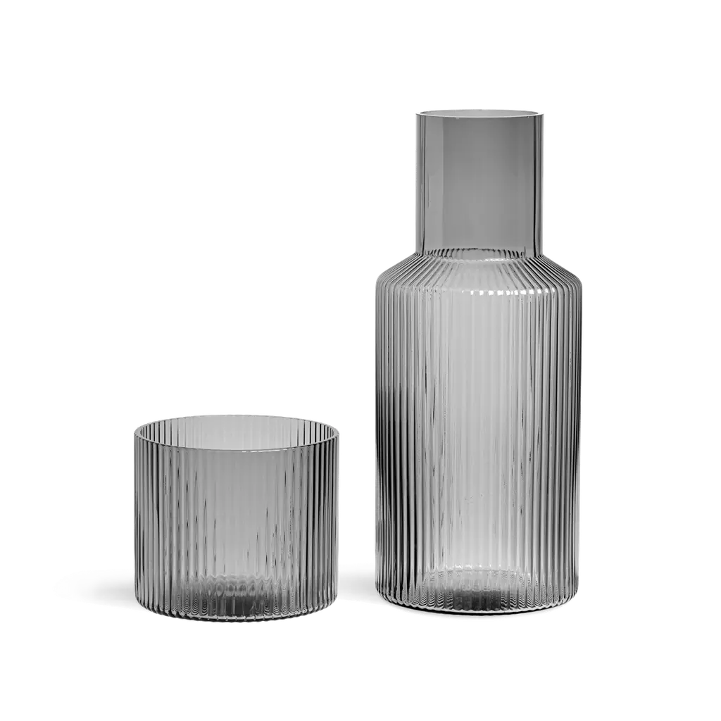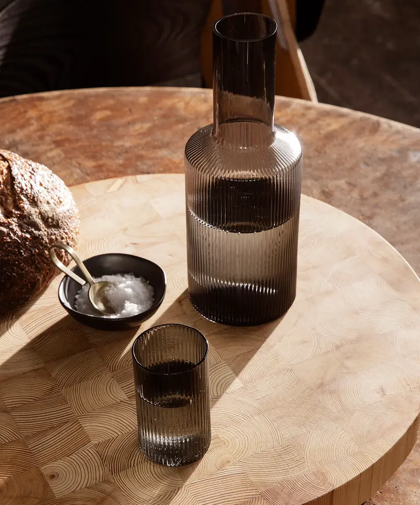 A vintage-inspired, textured glass that beautifully reflects light. The Ripple Carafe Set has a rare combination of delicate design, artisanal craftsmanship, and durability. The cup serves double duty as the carafe's lid, creating a beautiful crystalline cylinder when placed atop the carafe. Equally at home on your desk or nightstand, this set is a wonderful addition to the Ripple Glassware series. Dishwasher safe. Designed and produced by the Copenhagen-based studio Ferm Living.