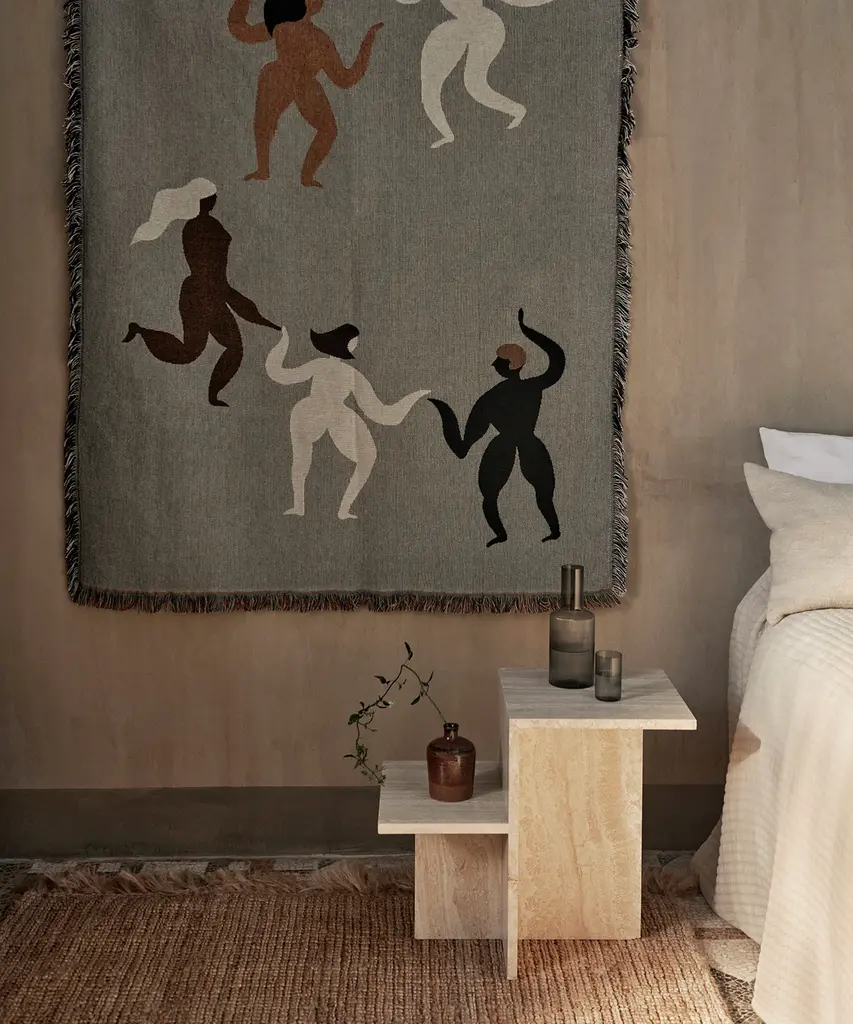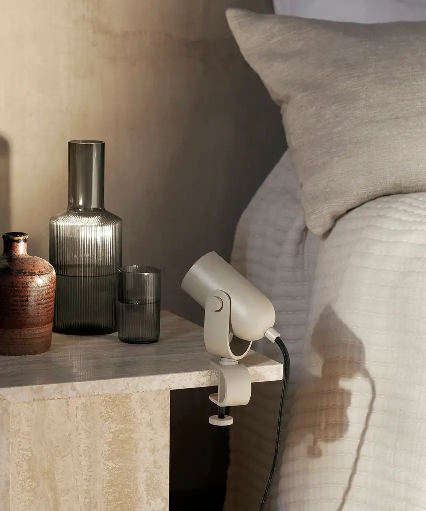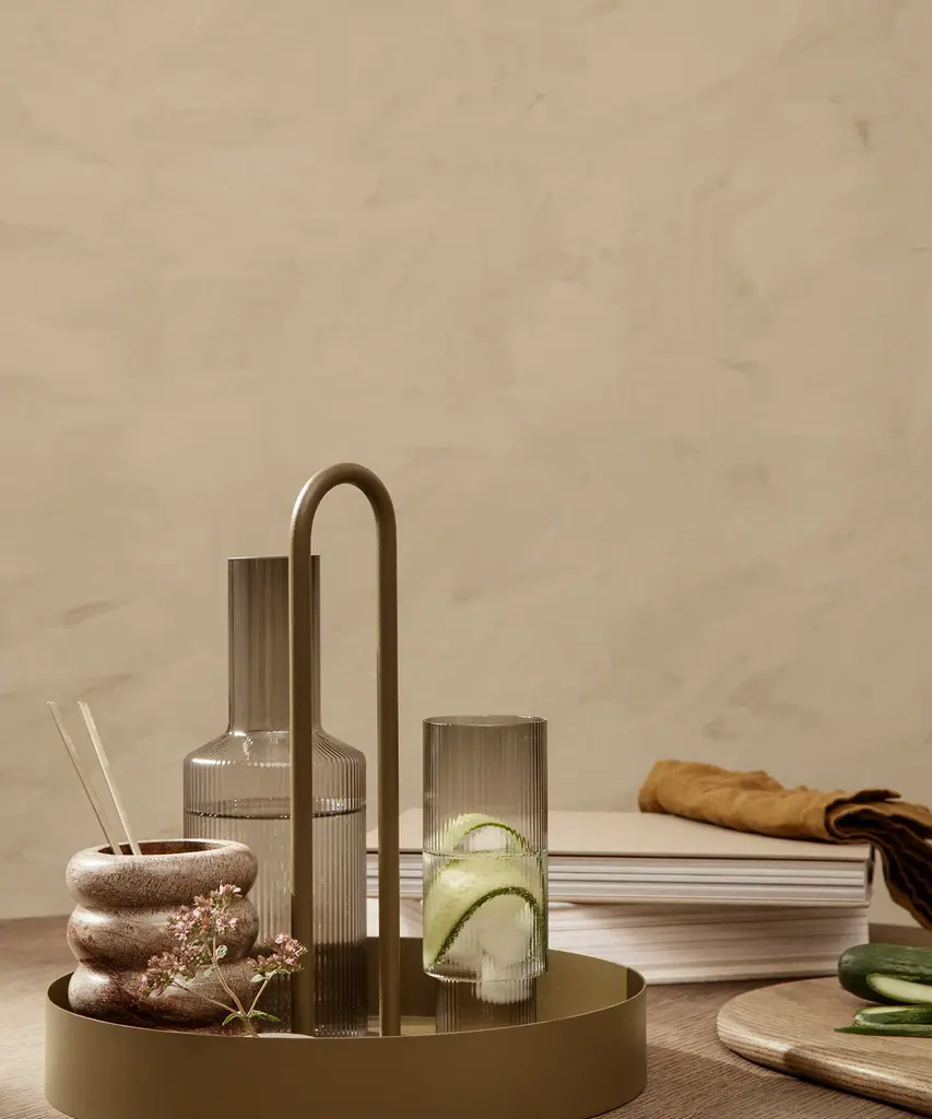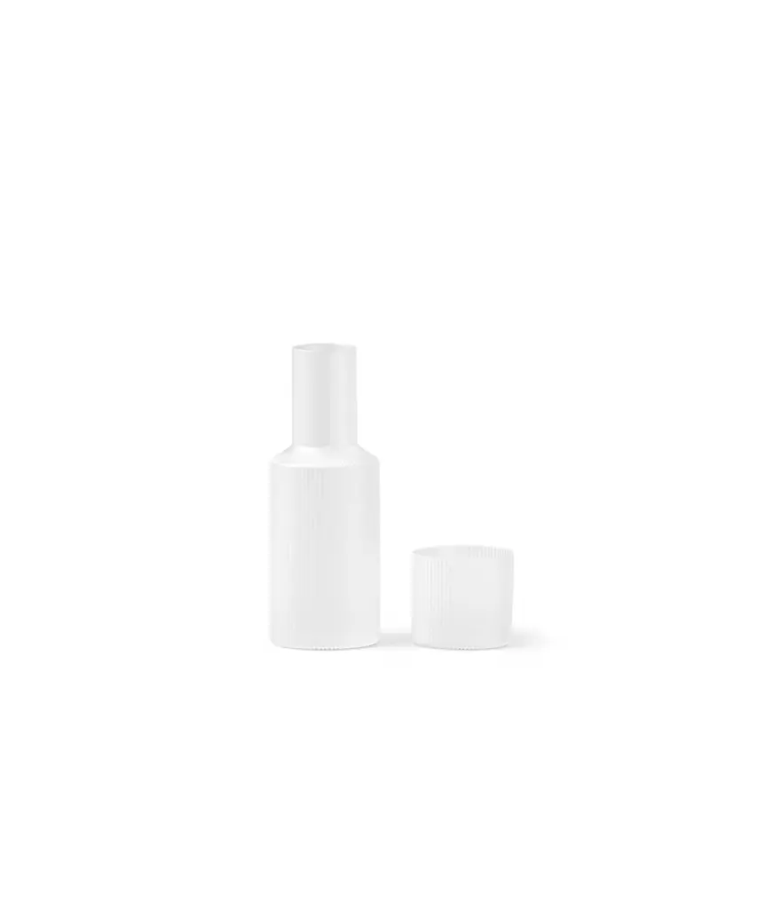 A vintage-inspired, textured glass that beautifully reflects light. The Ripple Carafe Set has a rare combination of delicate design, artisanal craftsmanship, and durability. The cup serves double duty as the carafe's lid, creating a beautiful crystalline cylinder when placed atop the carafe. Equally at home on your desk or nightstand, this set is a wonderful addition to the Ripple Glassware series. Dishwasher safe. Designed and produced by the Copenhagen-based studio Ferm Living.