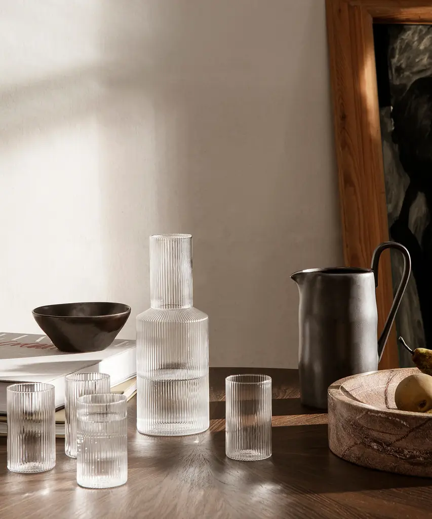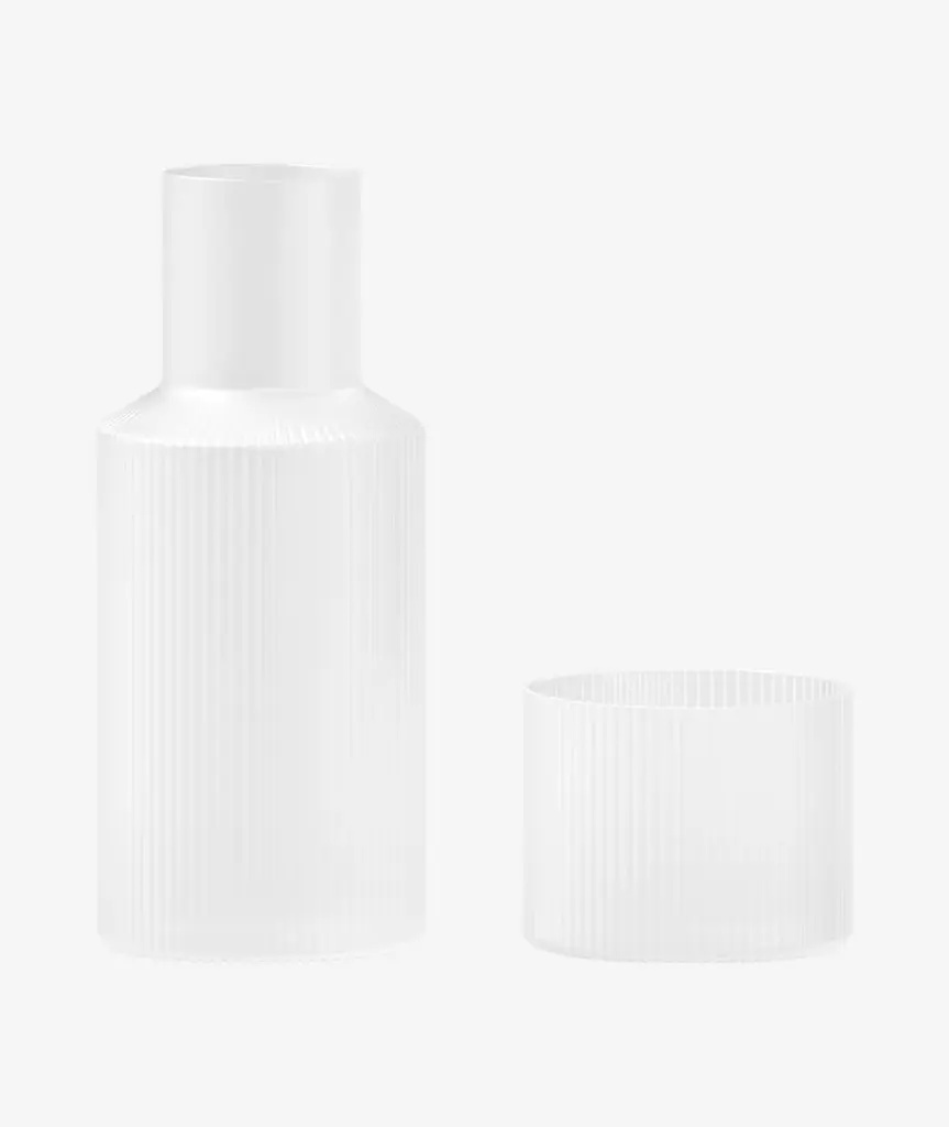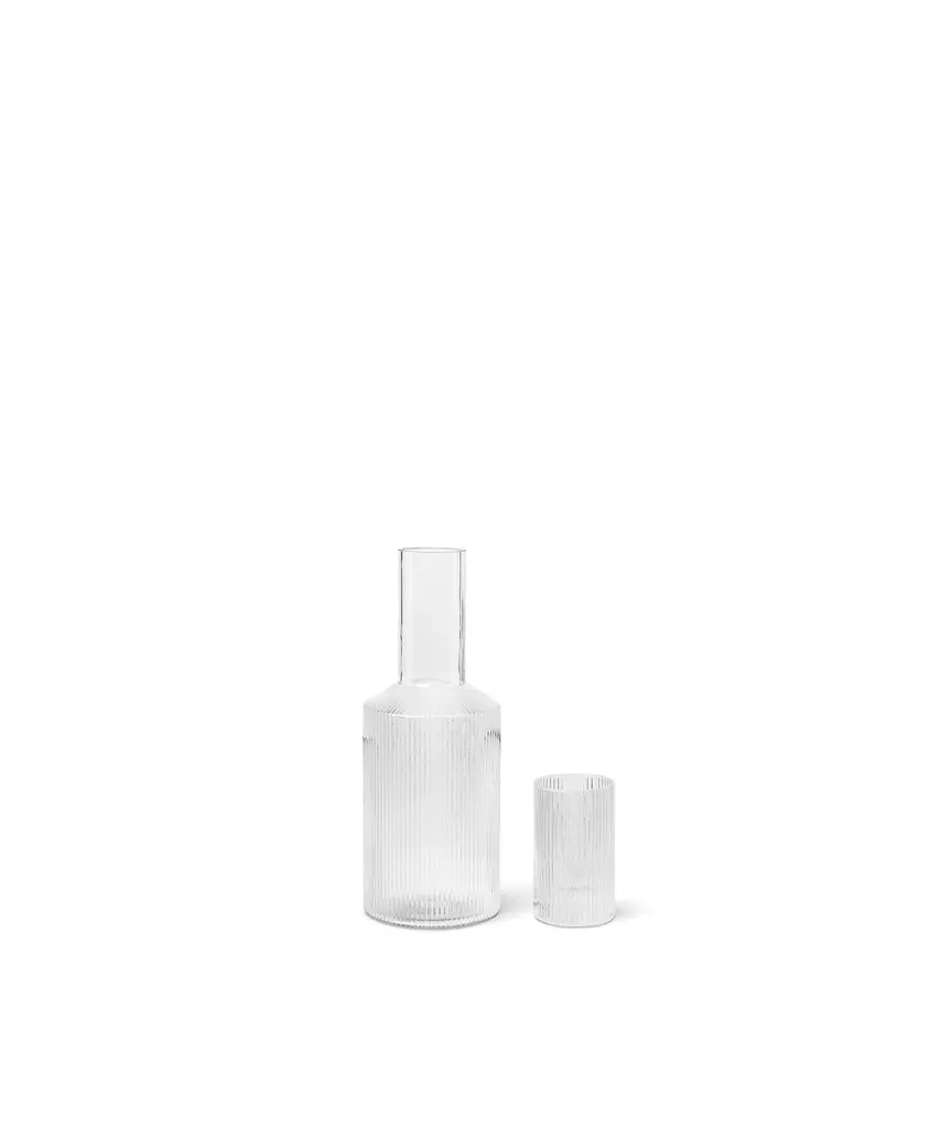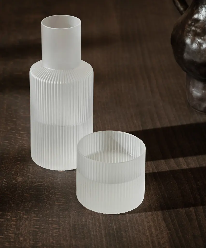 A vintage-inspired, textured glass that beautifully reflects light. The Ripple Carafe Set has a rare combination of delicate design, artisanal craftsmanship, and durability. The cup serves double duty as the carafe's lid, creating a beautiful crystalline cylinder when placed atop the carafe. Equally at home on your desk or nightstand, this set is a wonderful addition to the Ripple Glassware series. Dishwasher safe. Designed and produced by the Copenhagen-based studio Ferm Living.