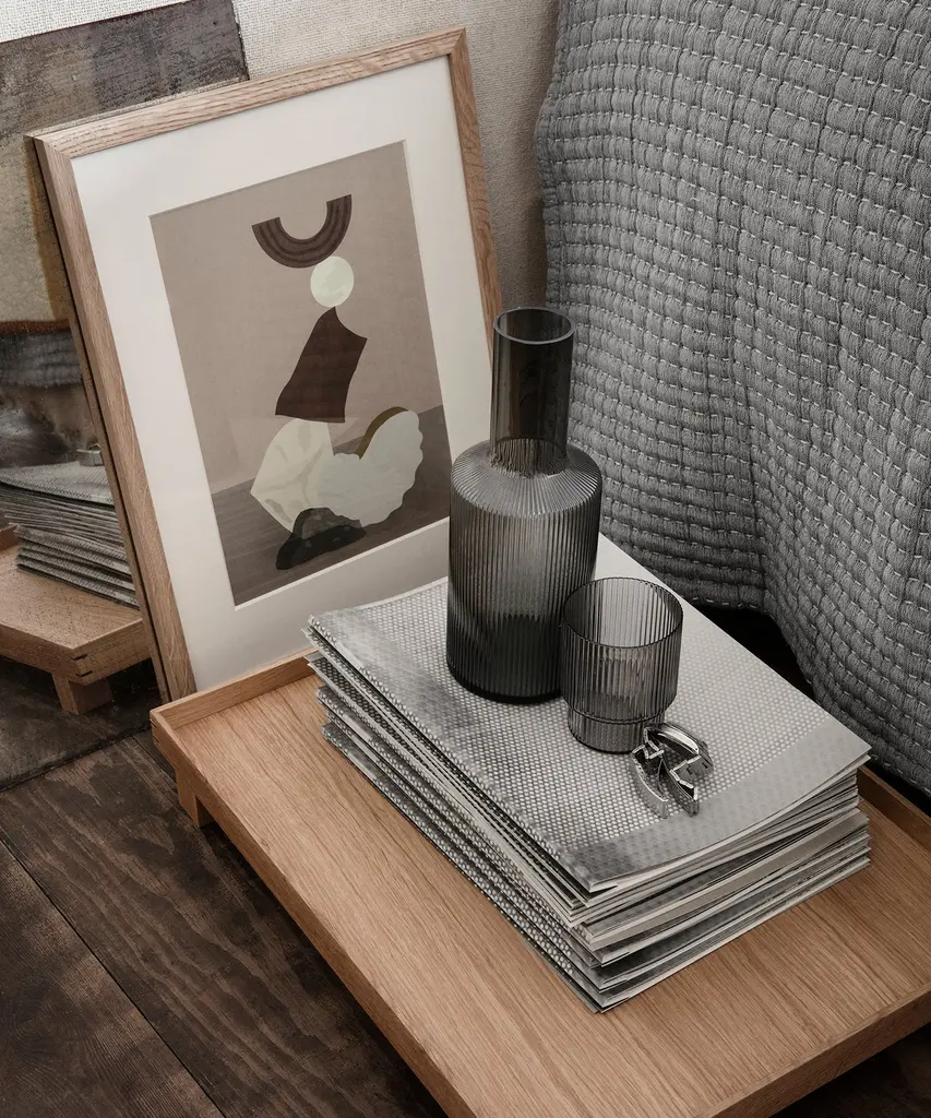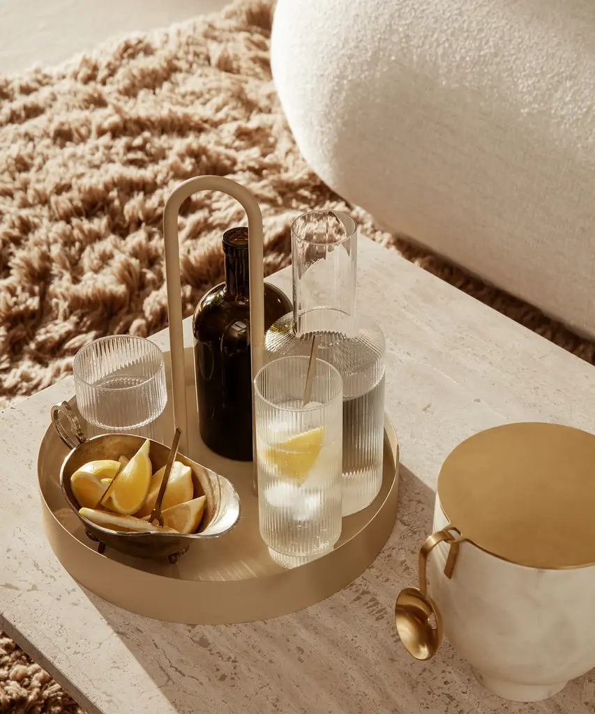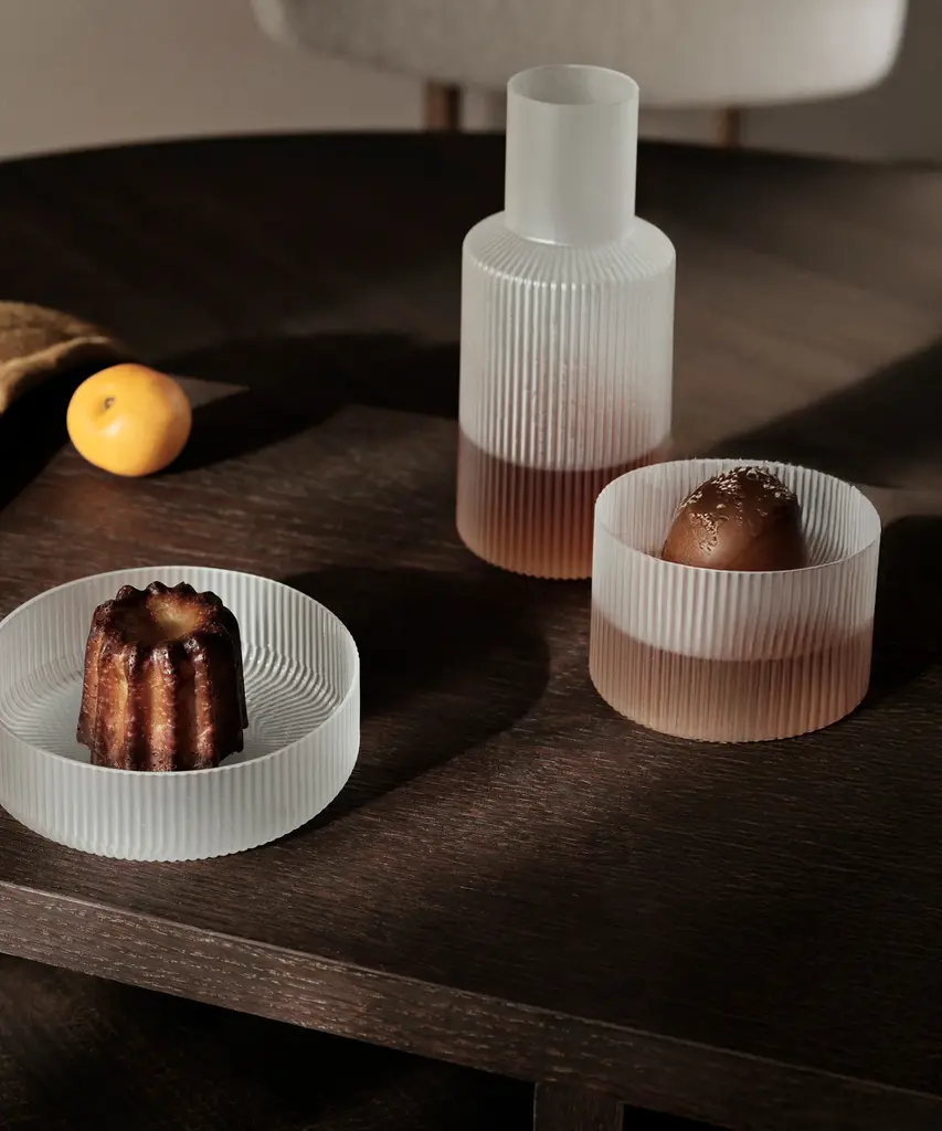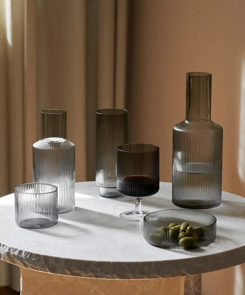 A vintage-inspired, textured glass that beautifully reflects light. The Ripple Carafe Set has a rare combination of delicate design, artisanal craftsmanship, and durability. The cup serves double duty as the carafe's lid, creating a beautiful crystalline cylinder when placed atop the carafe. Equally at home on your desk or nightstand, this set is a wonderful addition to the Ripple Glassware series. Dishwasher safe. Designed and produced by the Copenhagen-based studio Ferm Living.