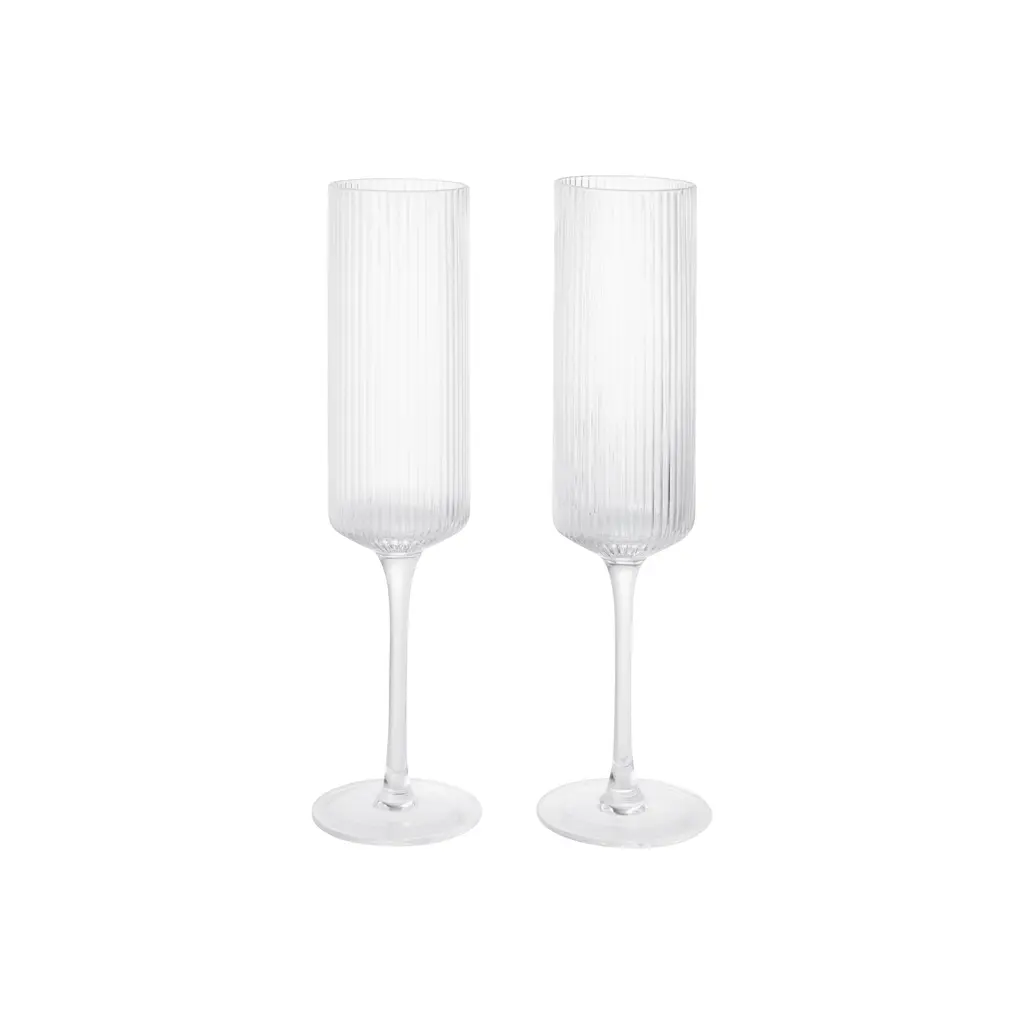 A refined and elegant addition to the beloved Ripple series, this set of two Champagne Flutes from Ferm Living is perfect for any celebration. Each glass is individually mouth-blown into a mould, creating the collection's signature rippled surface that is beautiful to see and to hold. The tall, slender silhouette is designed to enhance the bubbles and aroma of your favorite sparkling wine, bringing a sense of contemporary sophistication to every toast. A fusion of modern design and artisanal craftsmanship, it’s a stunning and timeless choice for your home bar. Highlights: