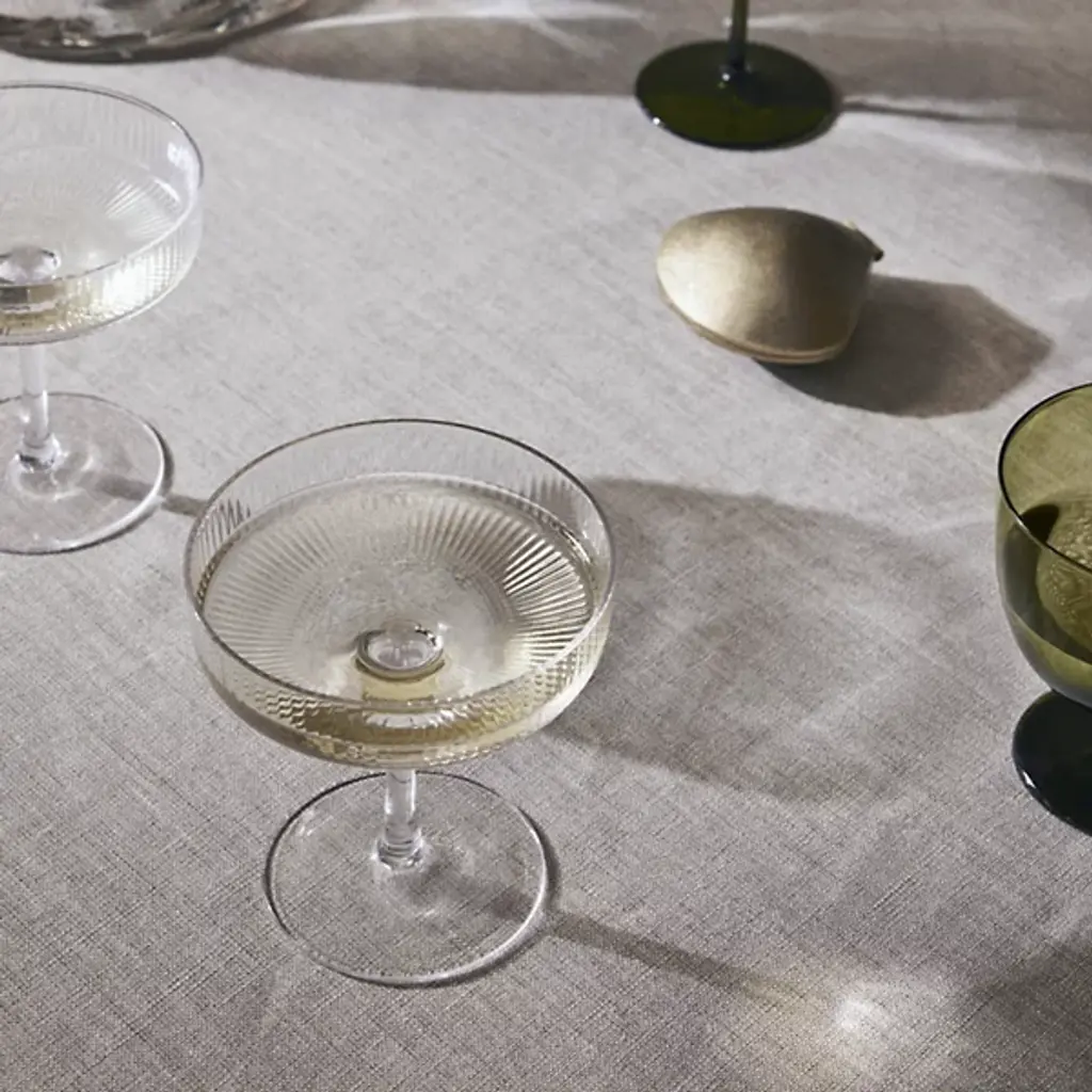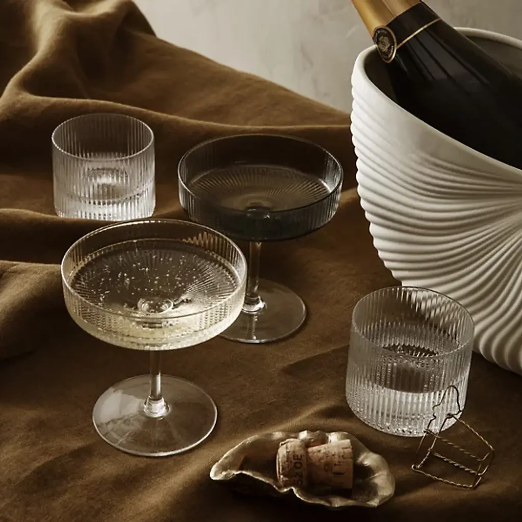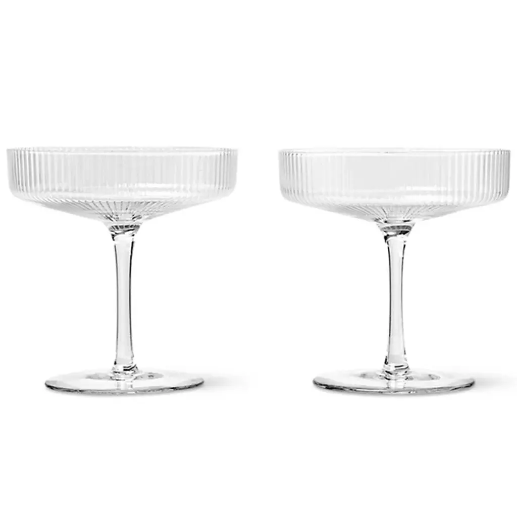 The Ripple Champagne Saucers - Set of 2 from Ferm Living features a beautifully rippled surface, offering a classic and elegant glass for sparkling wines. Each delicate glass is mouth-blown into a mold, creating a dynamic and energetic design. Every piece is crafted carefully, so slight variations may occur, adding to their unique charm. Perfect for elevating any celebration.