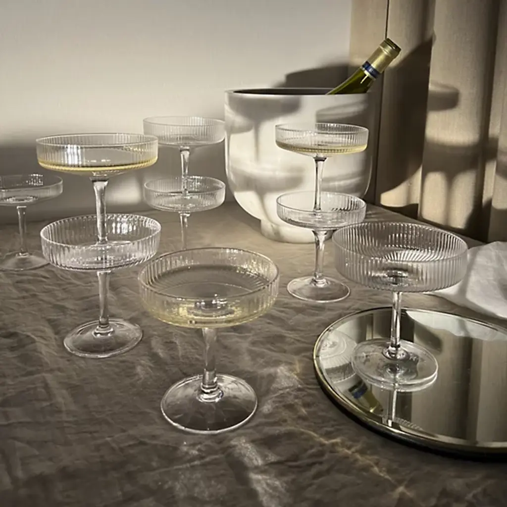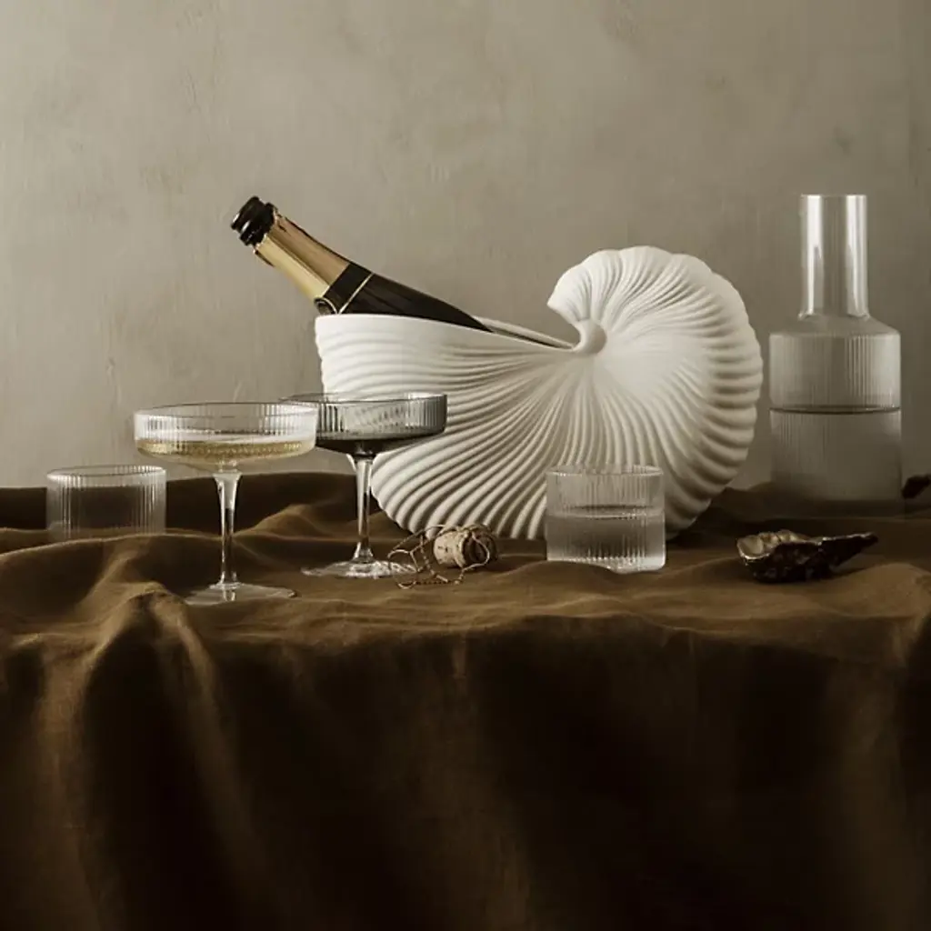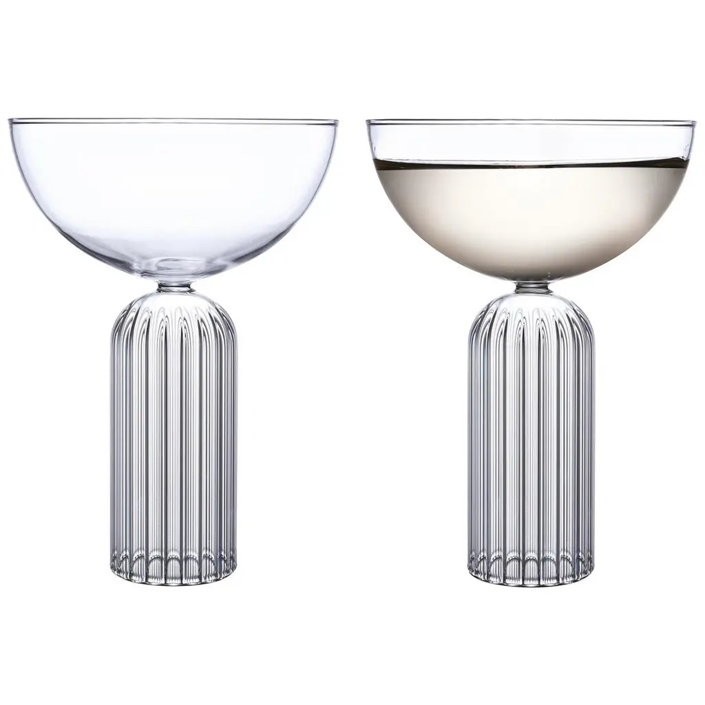 The Ripple Champagne Saucers - Set of 2 from Ferm Living features a beautifully rippled surface, offering a classic and elegant glass for sparkling wines. Each delicate glass is mouth-blown into a mold, creating a dynamic and energetic design. Every piece is crafted carefully, so slight variations may occur, adding to their unique charm. Perfect for elevating any celebration.