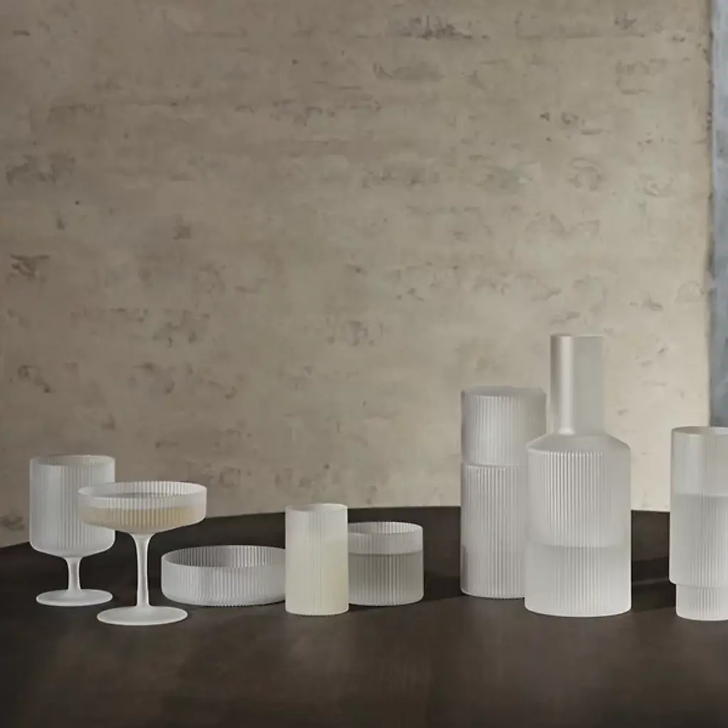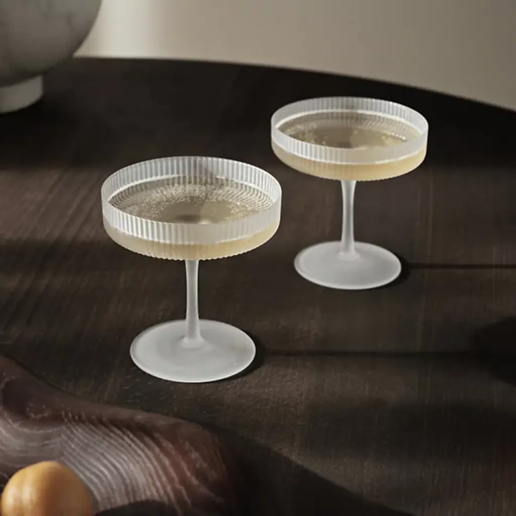 The Ripple Champagne Saucers - Set of 2 from Ferm Living features a beautifully rippled surface, offering a classic and elegant glass for sparkling wines. Each delicate glass is mouth-blown into a mold, creating a dynamic and energetic design. Every piece is crafted carefully, so slight variations may occur, adding to their unique charm. Perfect for elevating any celebration.