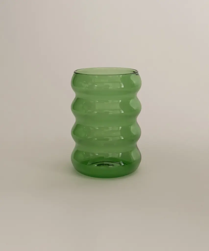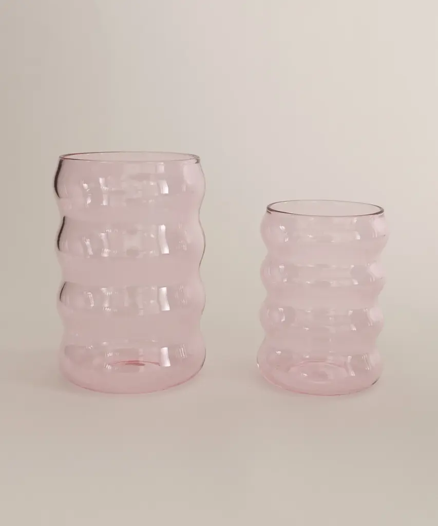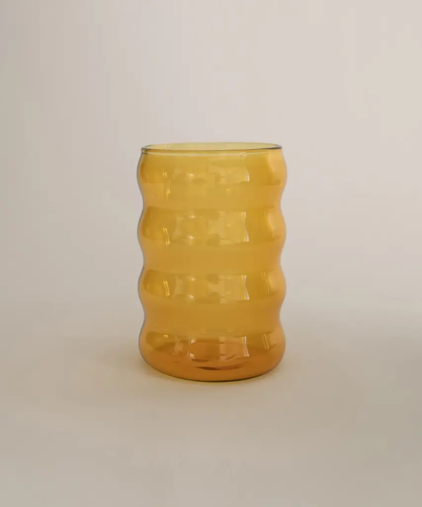 A wavy borosilicate glass drinking cup, perfect for a glass of wine, spirits, cocktails, table water, or any other drink of your preference. It's also cute as a little vase. Small clear, amber, and lilac glasses are only available for purchase as a set of 2. The glasses are packaged together as a set. Designed by Sophie Lou Jacobsen, a French-American designer based in New York City.