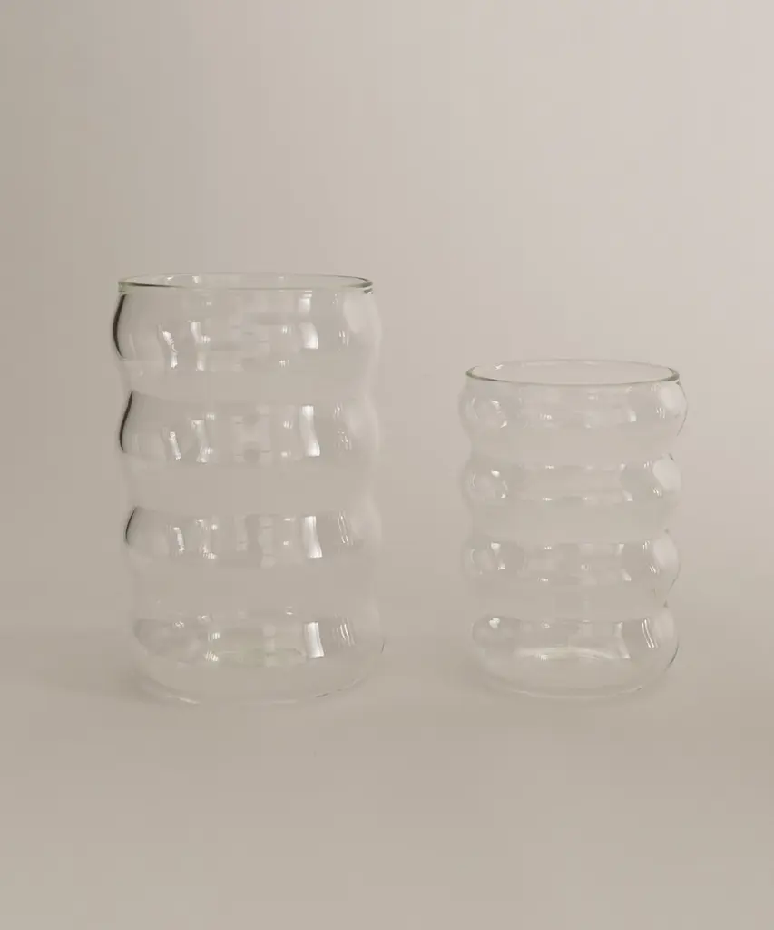 A wavy borosilicate glass drinking cup, perfect for a glass of wine, spirits, cocktails, table water, or any other drink of your preference. It's also cute as a little vase. Small clear, amber, and lilac glasses are only available for purchase as a set of 2. The glasses are packaged together as a set. Designed by Sophie Lou Jacobsen, a French-American designer based in New York City.