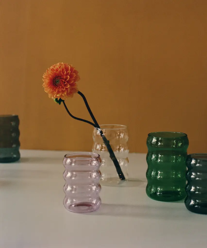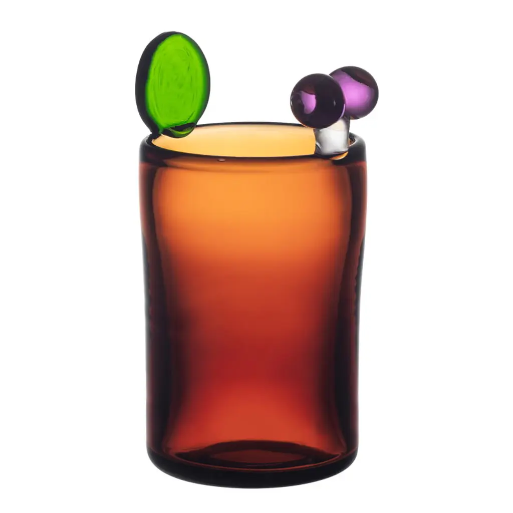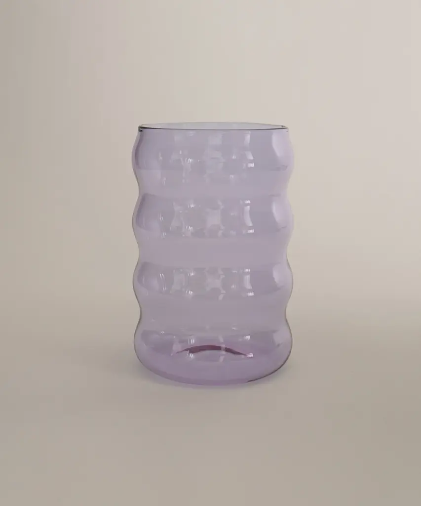 A wavy borosilicate glass drinking cup, perfect for a glass of wine, spirits, cocktails, table water, or any other drink of your preference. It's also cute as a little vase. Small clear, amber, and lilac glasses are only available for purchase as a set of 2. The glasses are packaged together as a set. Designed by Sophie Lou Jacobsen, a French-American designer based in New York City.