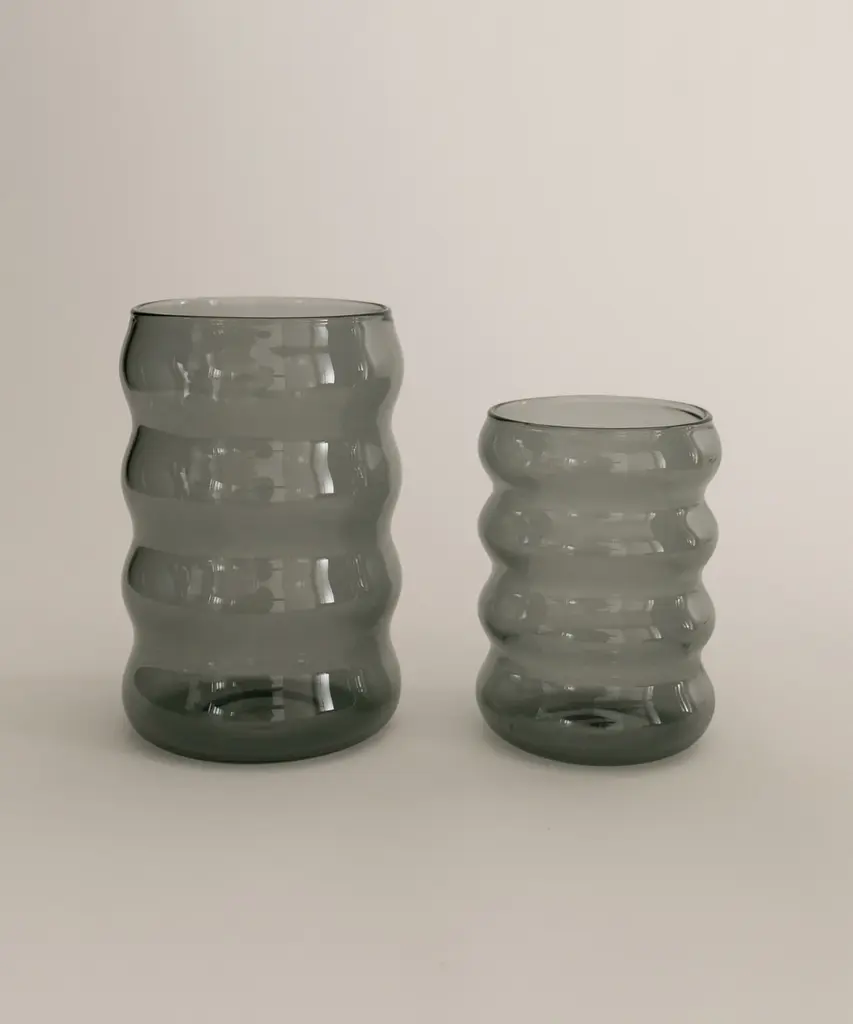 A wavy borosilicate glass drinking cup, perfect for a glass of wine, spirits, cocktails, table water, or any other drink of your preference. It's also cute as a little vase. Small clear, amber, and lilac glasses are only available for purchase as a set of 2. The glasses are packaged together as a set. Designed by Sophie Lou Jacobsen, a French-American designer based in New York City.