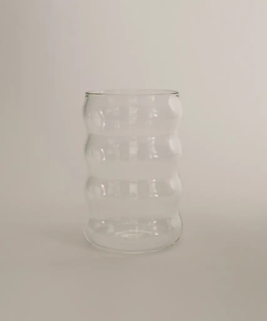 A wavy borosilicate glass drinking cup, perfect for a glass of wine, spirits, cocktails, table water, or any other drink of your preference. It's also cute as a little vase. Small clear, amber, and lilac glasses are only available for purchase as a set of 2. The glasses are packaged together as a set. Designed by Sophie Lou Jacobsen, a French-American designer based in New York City.