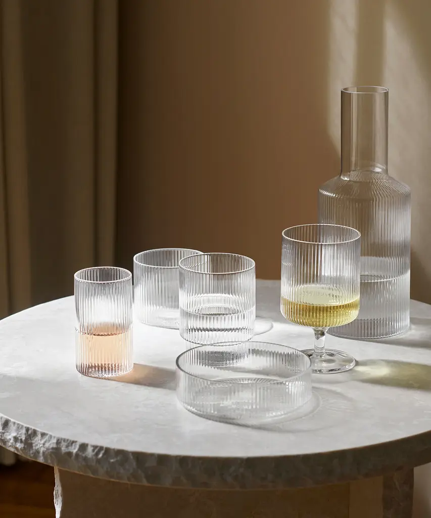 A vintage-inspired, textured glass that beautifully reflects light. These glasses are a rare combination of delicate in visual design, artisanal in craftsmanship, and durable in function. Each glass in this set of four varies slightly in shape, creating an innovative collection of stackables. Designed and produced by the Copenhagen-based studio Ferm Living.