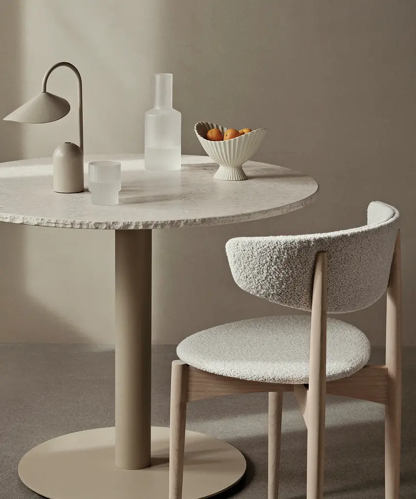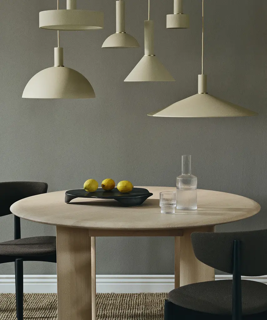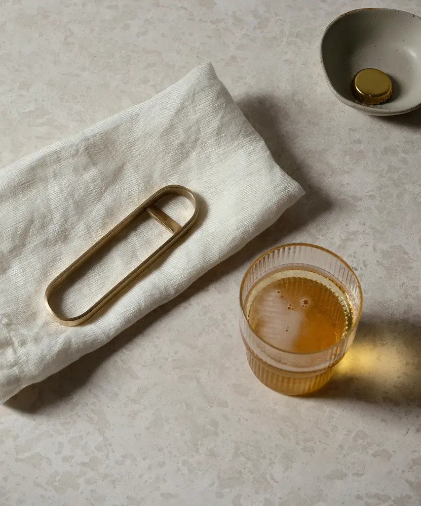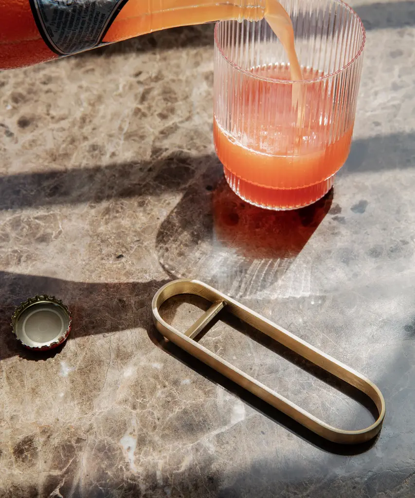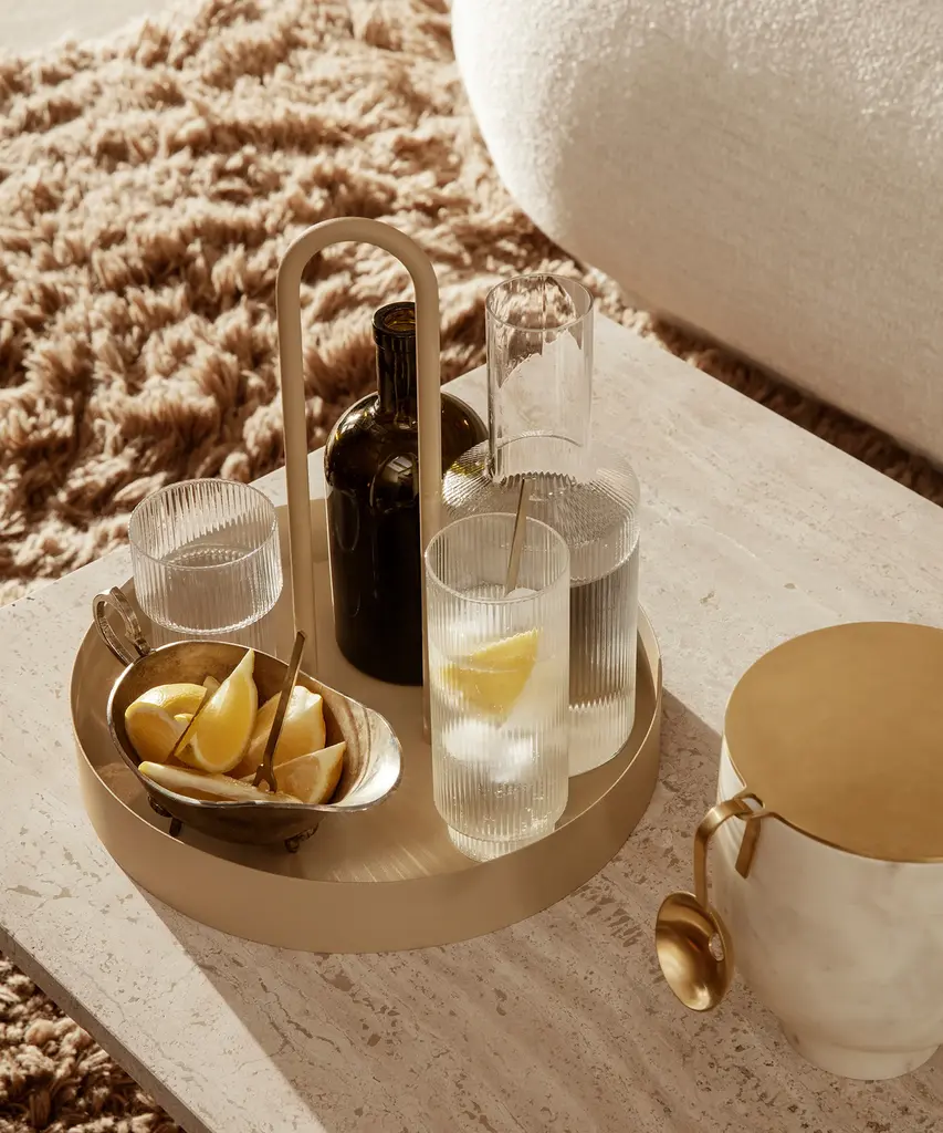A vintage-inspired, textured glass that beautifully reflects light. These glasses are a rare combination of delicate in visual design, artisanal in craftsmanship, and durable in function. Each glass in this set of four varies slightly in shape, creating an innovative collection of stackables. Designed and produced by the Copenhagen-based studio Ferm Living.