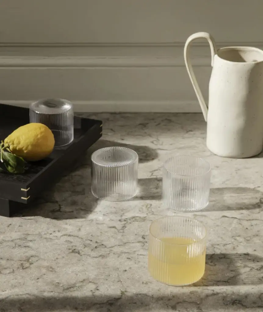 Mouth blown into the mold, this set of four low glasses features a distinctive, beautifully rippled surface. The vertical lines add a strong and sophisticated look to their understated, classic form and are perfect for casual dining. Pair them with other pieces in the Ripple glass collection for a unified dining experience.
