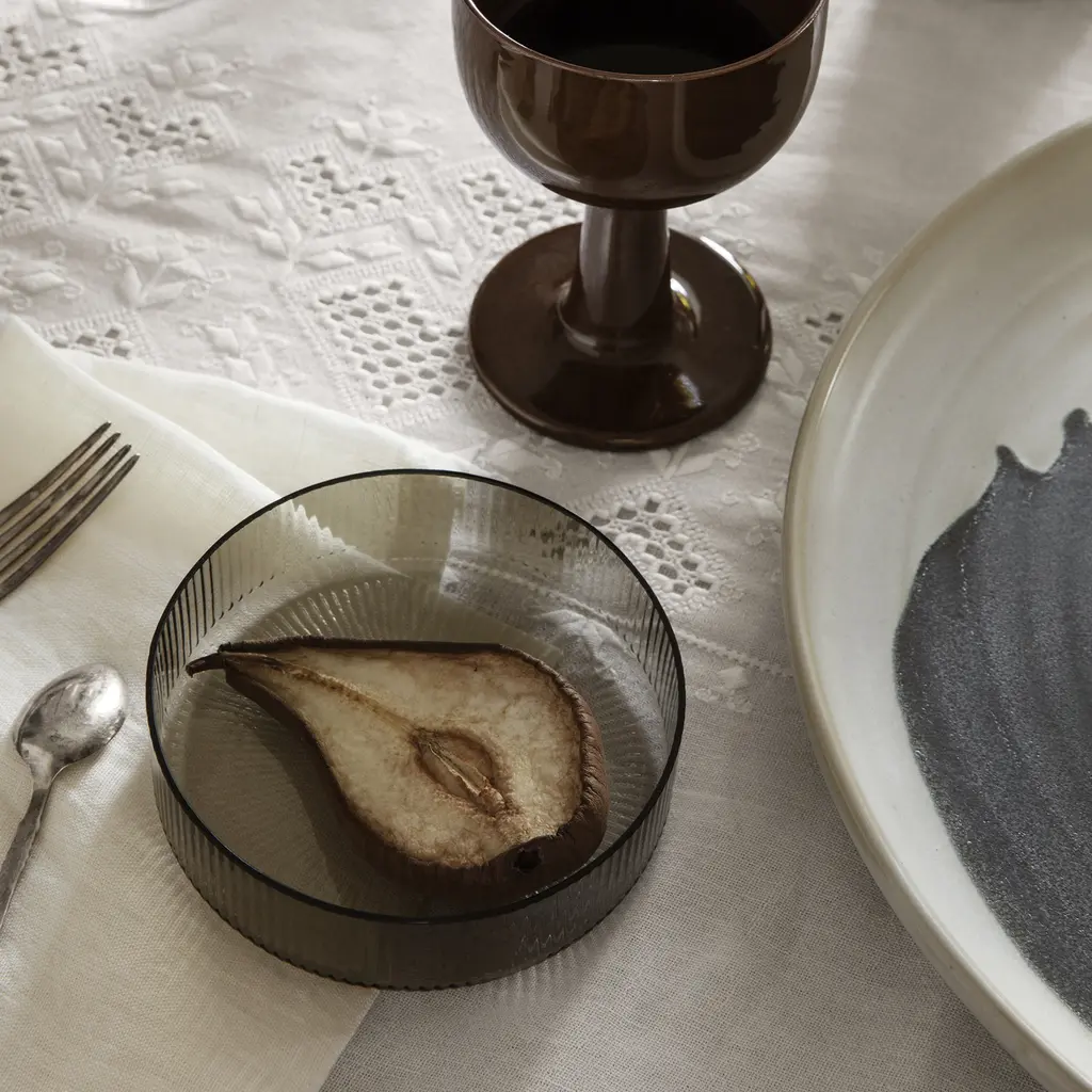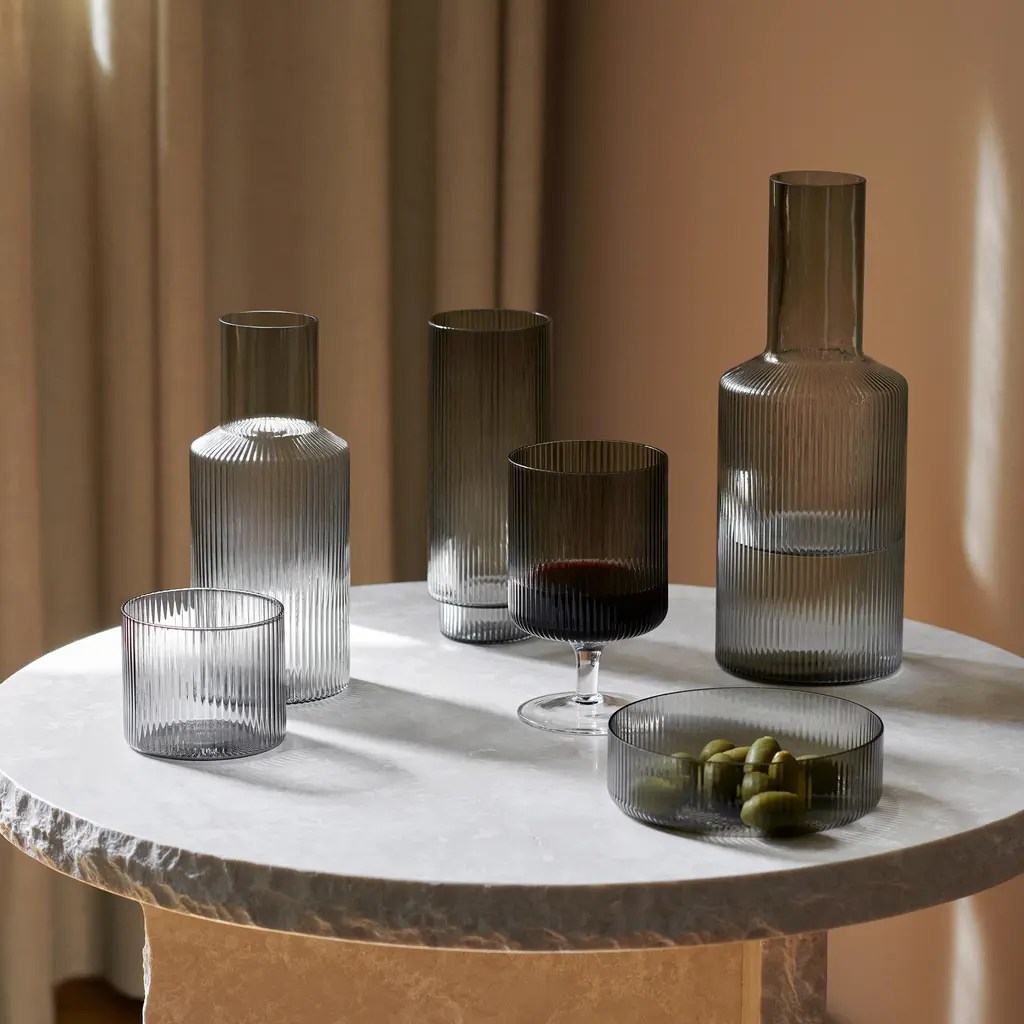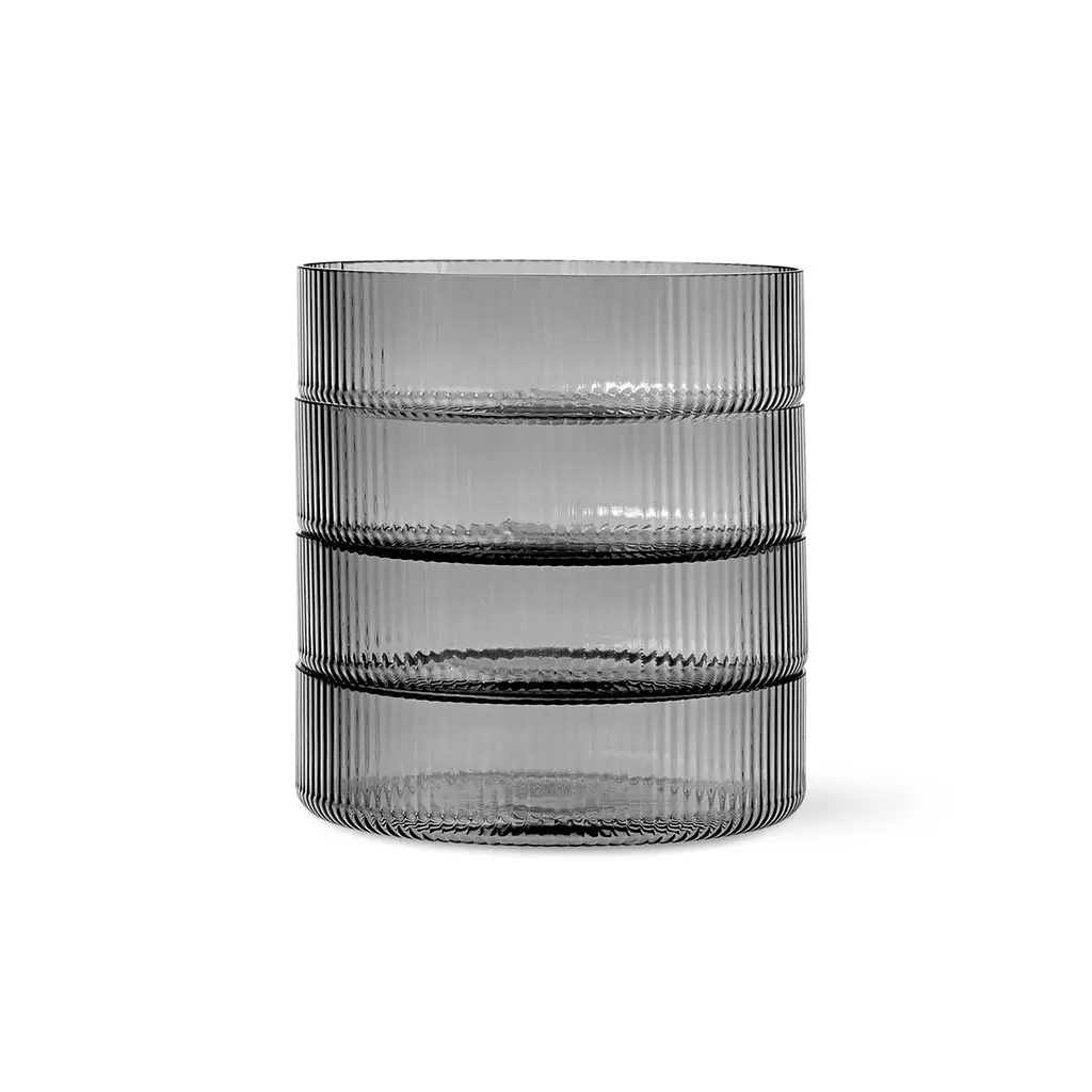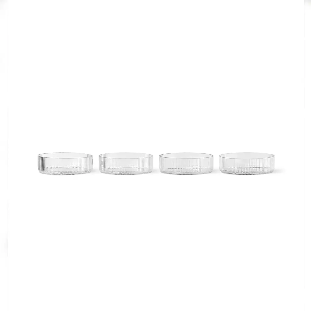 Crafted from fine, mouth-blown glass shaped in a rippled mold, the Ripple Serving Bowls comprise a set of four distinctively textured bowls, characteristic of the Ripple series. These bowls are perfect for presenting a variety of appetizing treats, from savory olives and tapenades to delightful desserts, to both guests and loved ones.
