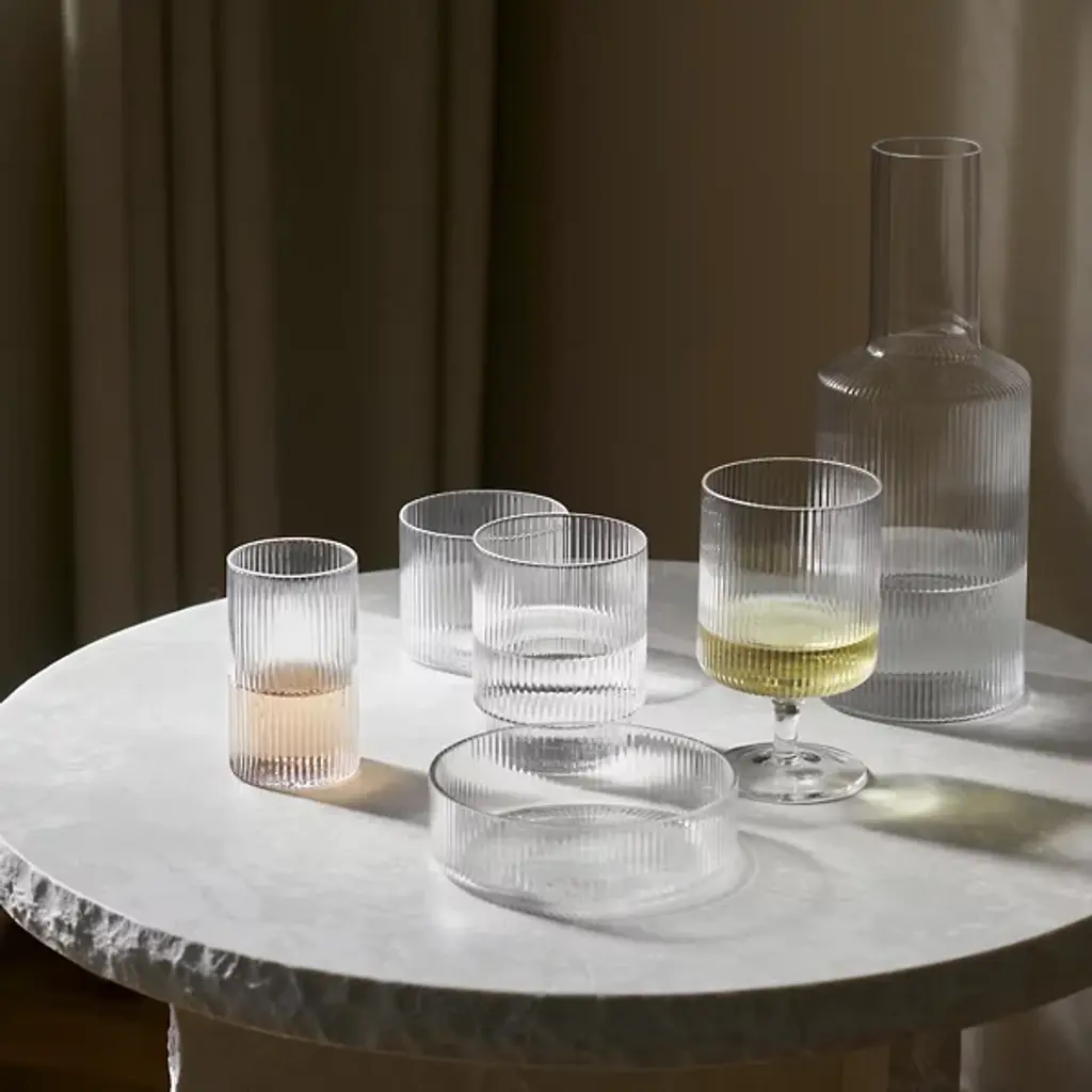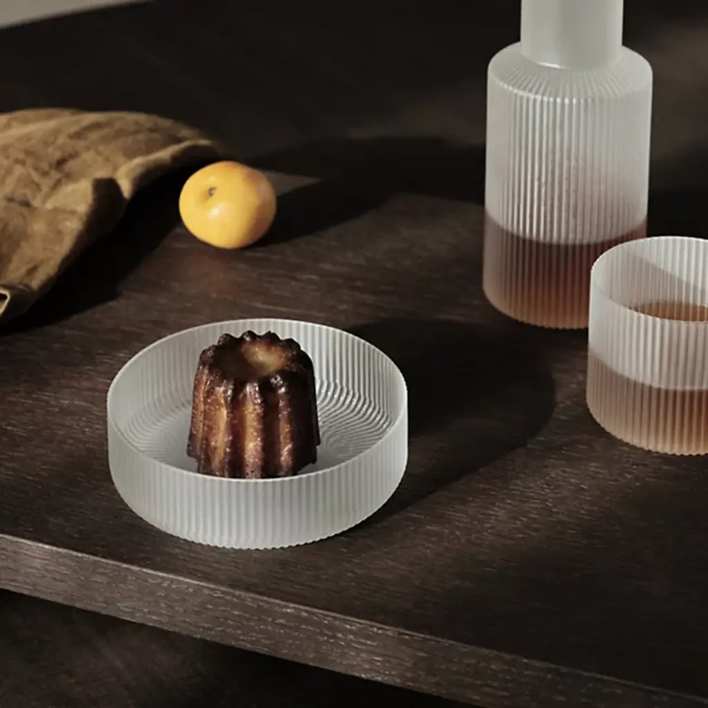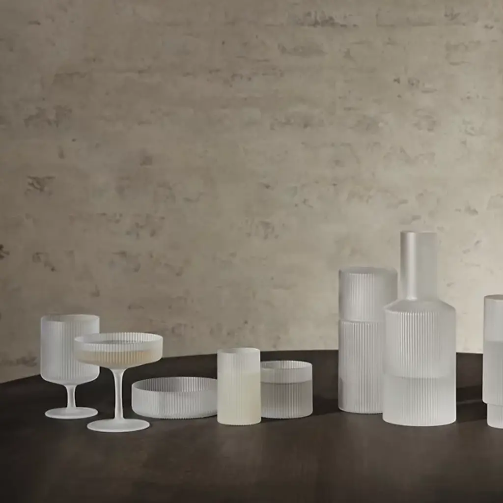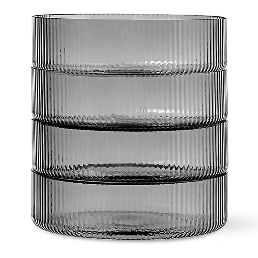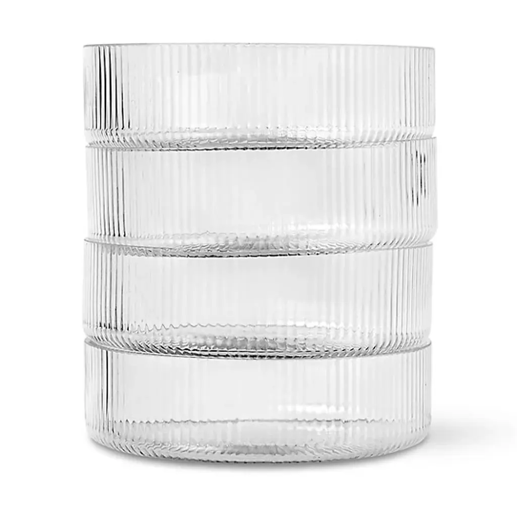 The Ripple Serving Bowls - Set of 4 from Ferm Living are ideal for presenting everything from appetizers to desserts, with their textured surfaces adding visual interest to any culinary presentation. Each bowl in this quartet emerges from a specialized mold, where mouth-blown glass captures permanent wave-like patterns. The consistency across all four pieces creates a coordinated serving experience while maintaining individual character. Their versatility extends beyond traditional serving roles, making them equally suitable for displaying decorative objects or organizing small items.