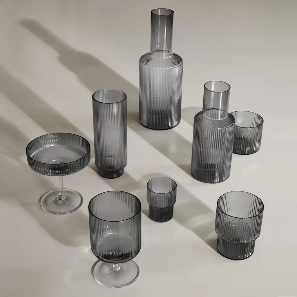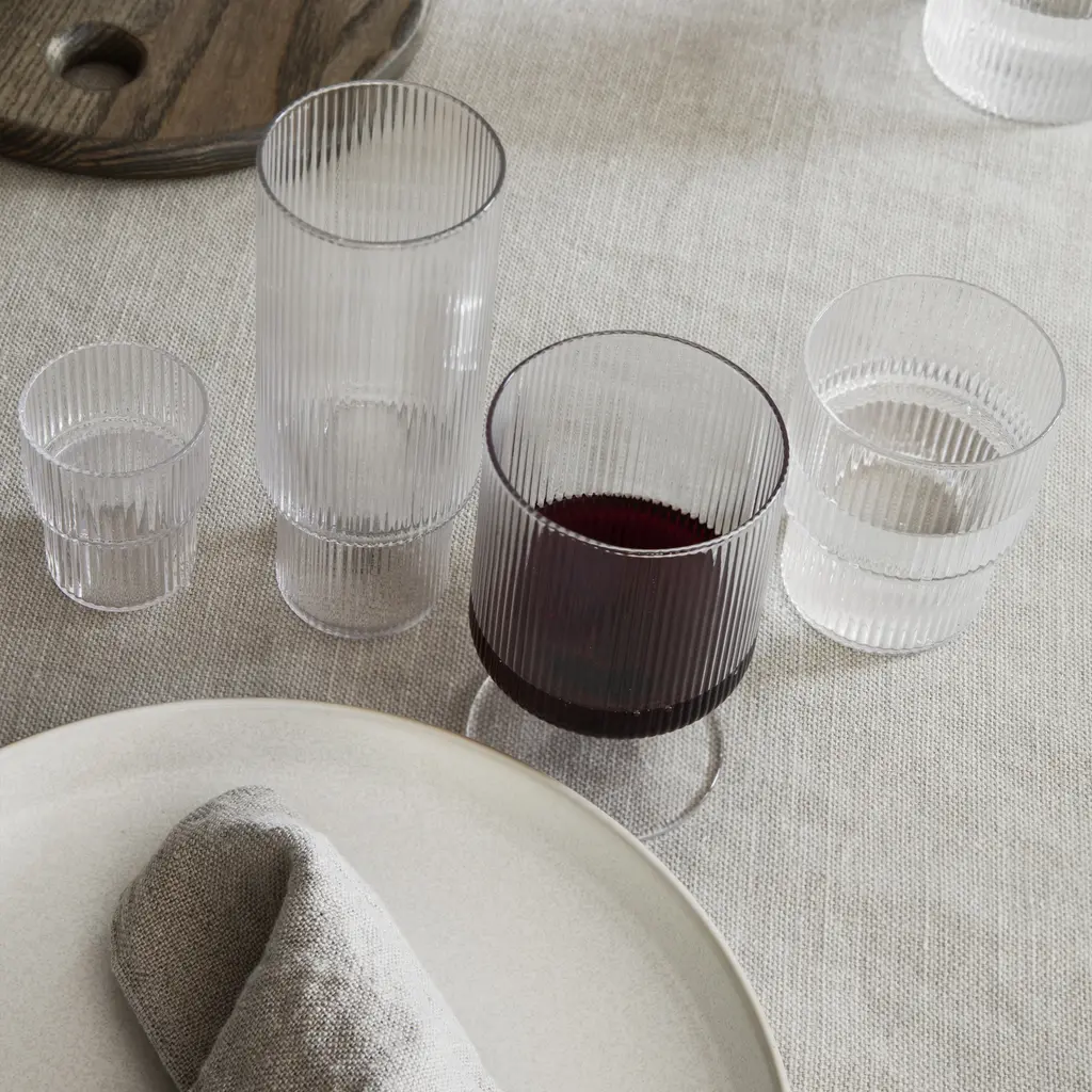 Fashioned as a petite rendition of the classic Ripple drinking glasses, this quartet of tumblers brings a touch of sophistication to your tableware collection. Mouth-blown to perfection, each glass uniquely displays the Ripple series’ signature geometric forms. These tumblers are wonderfully adaptable, ideal for enjoying a chosen liqueur, serving condiments, or even repurposing as charming egg cups.
