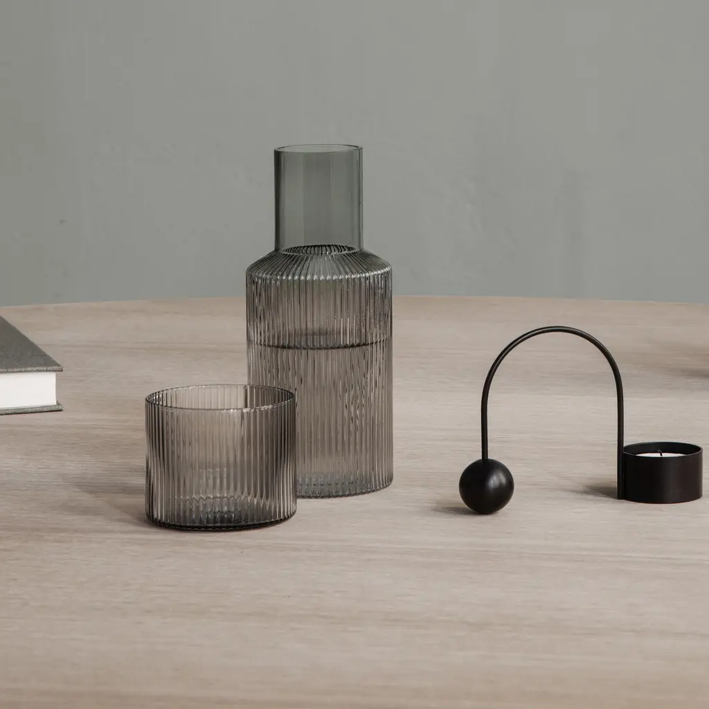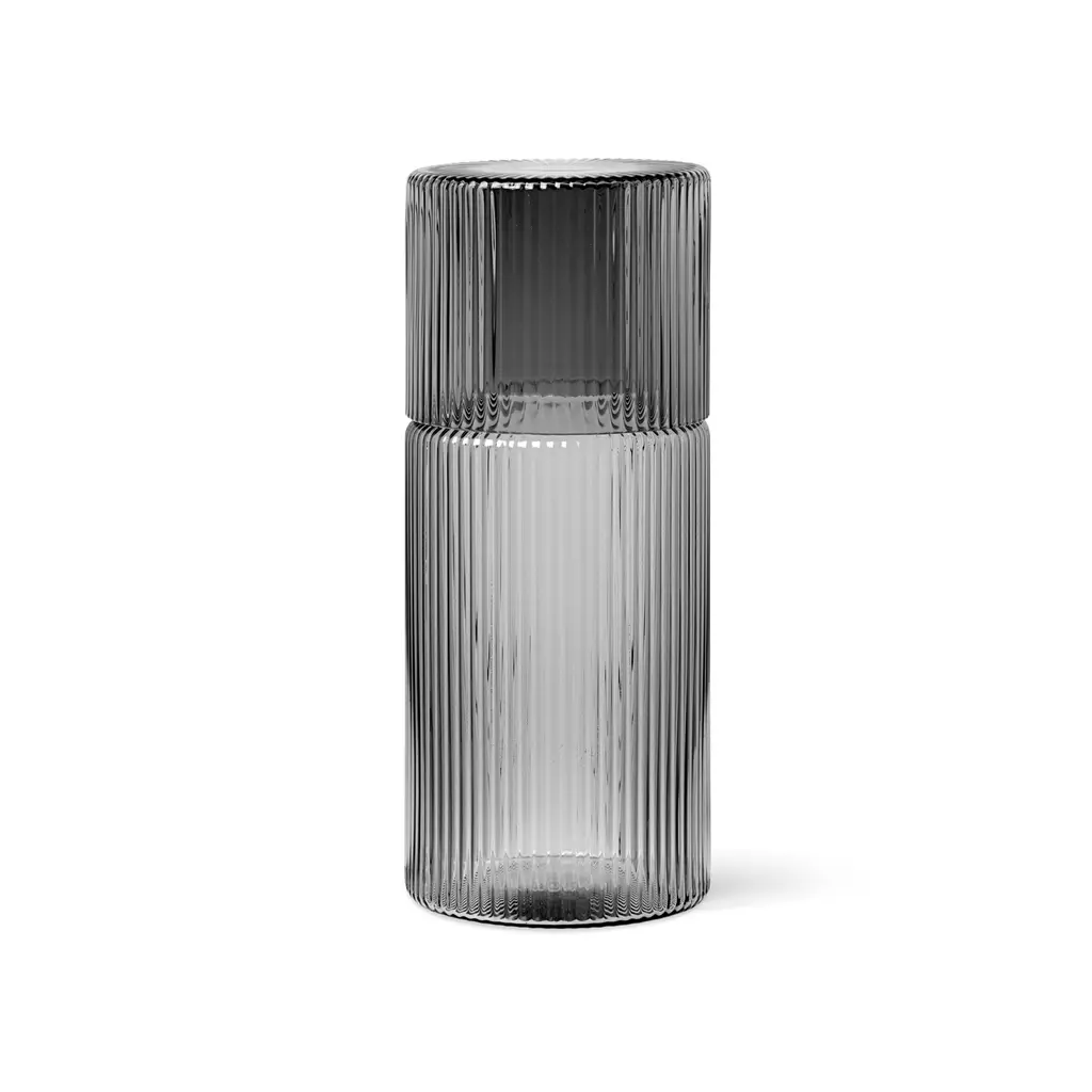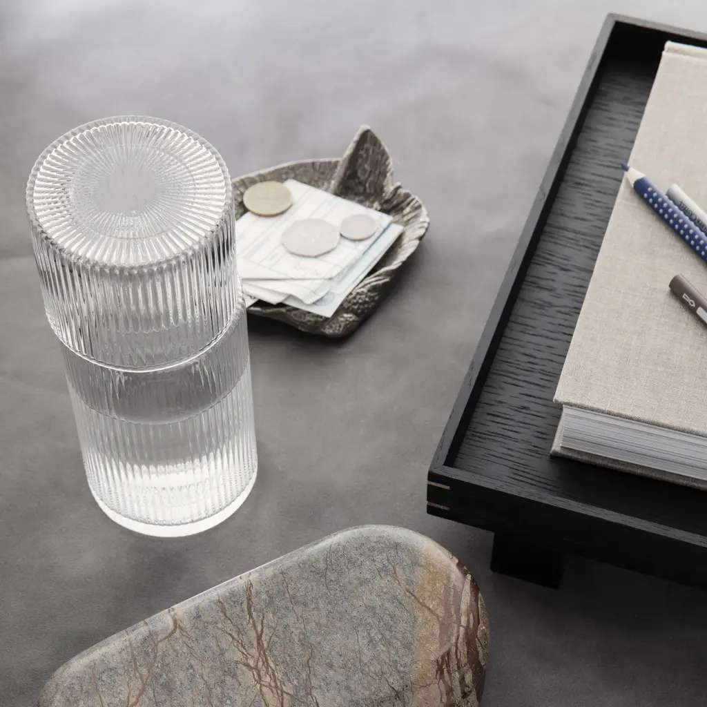 This compact and practical carafe and glass set, where the glass ingeniously doubles as a lid for the carafe, is a great hydration solution. It features the distinctive rippled design of mouth-blown glass, tinted for an elegant look. This set is perfect for maintaining hydration, whether it’s a chic addition to your office space or a convenient companion on your bedside table.