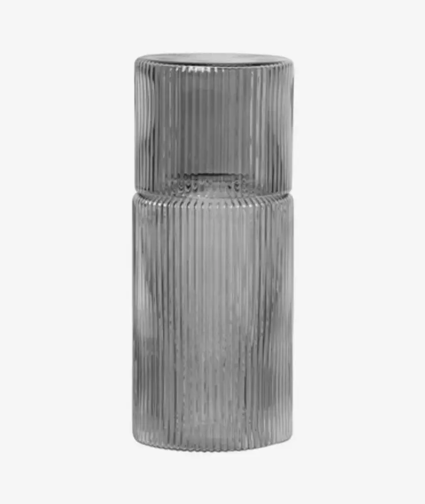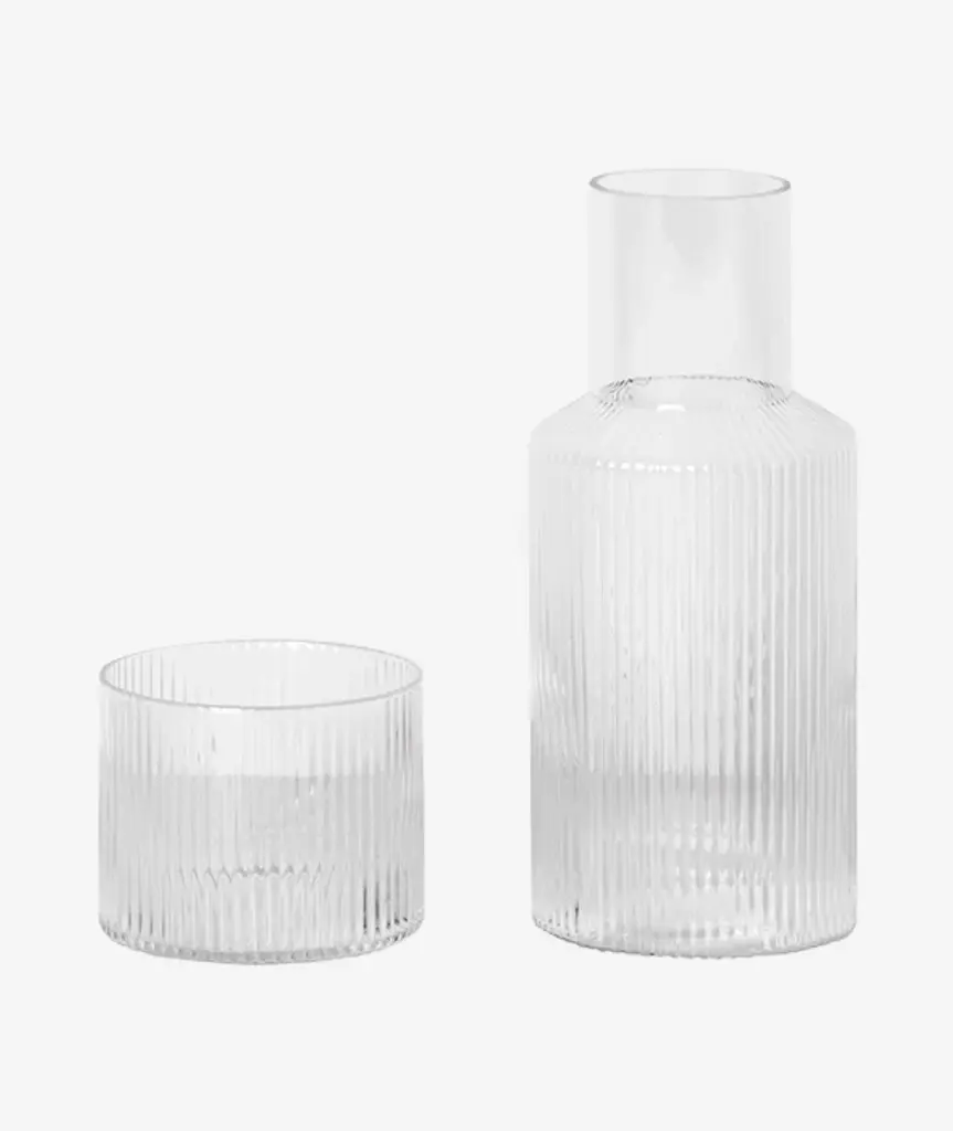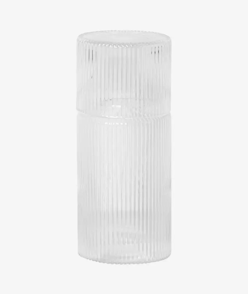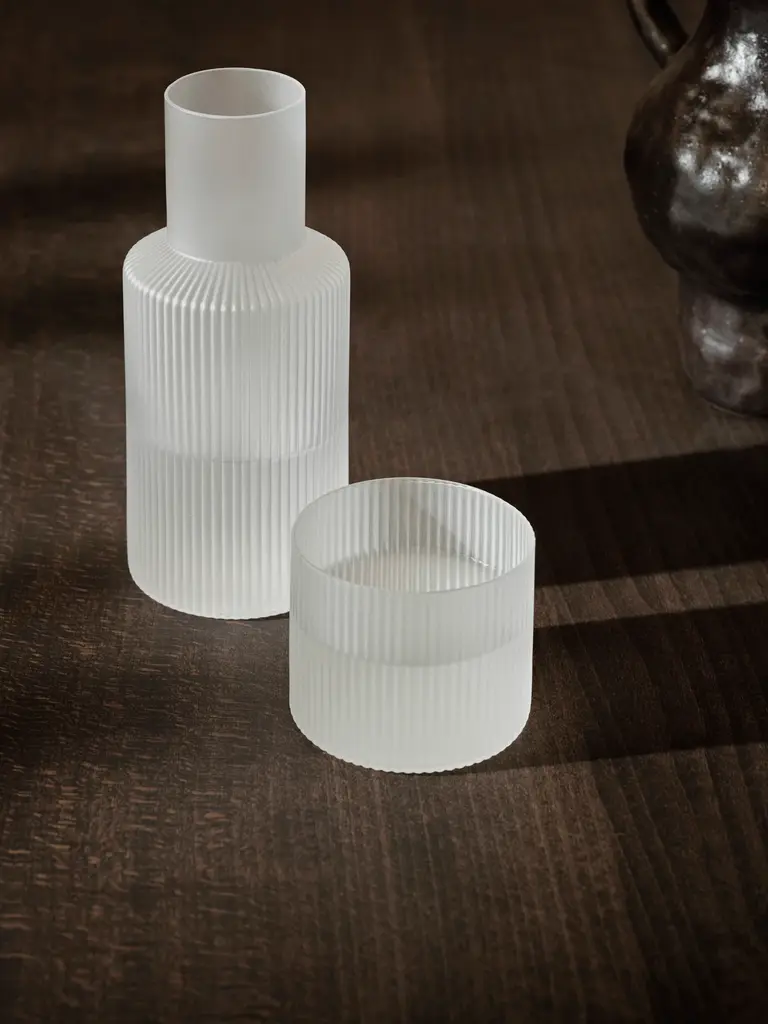 Stay hydrated all day long with this handy little set of carafe and glass, which doubles as a lid for the carafe. The set features the characteristics of the series with the rippled mouth-blown glass. It can be your healthy office accessory or a new favorite on the bedside table.