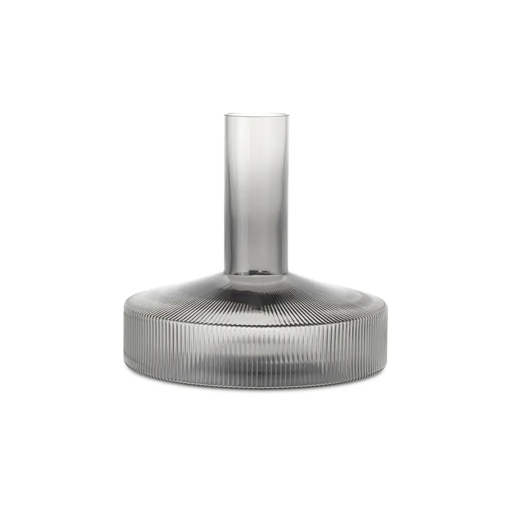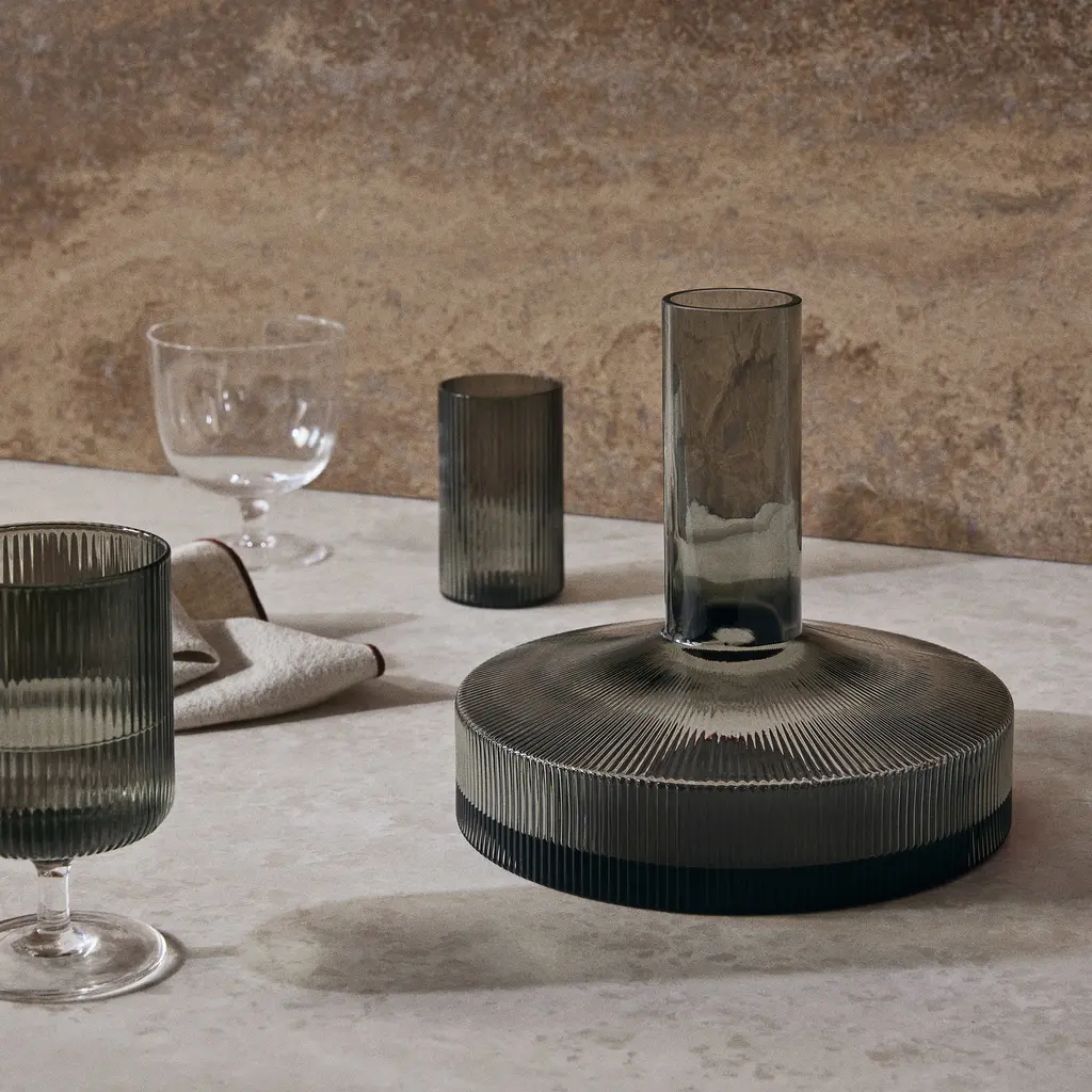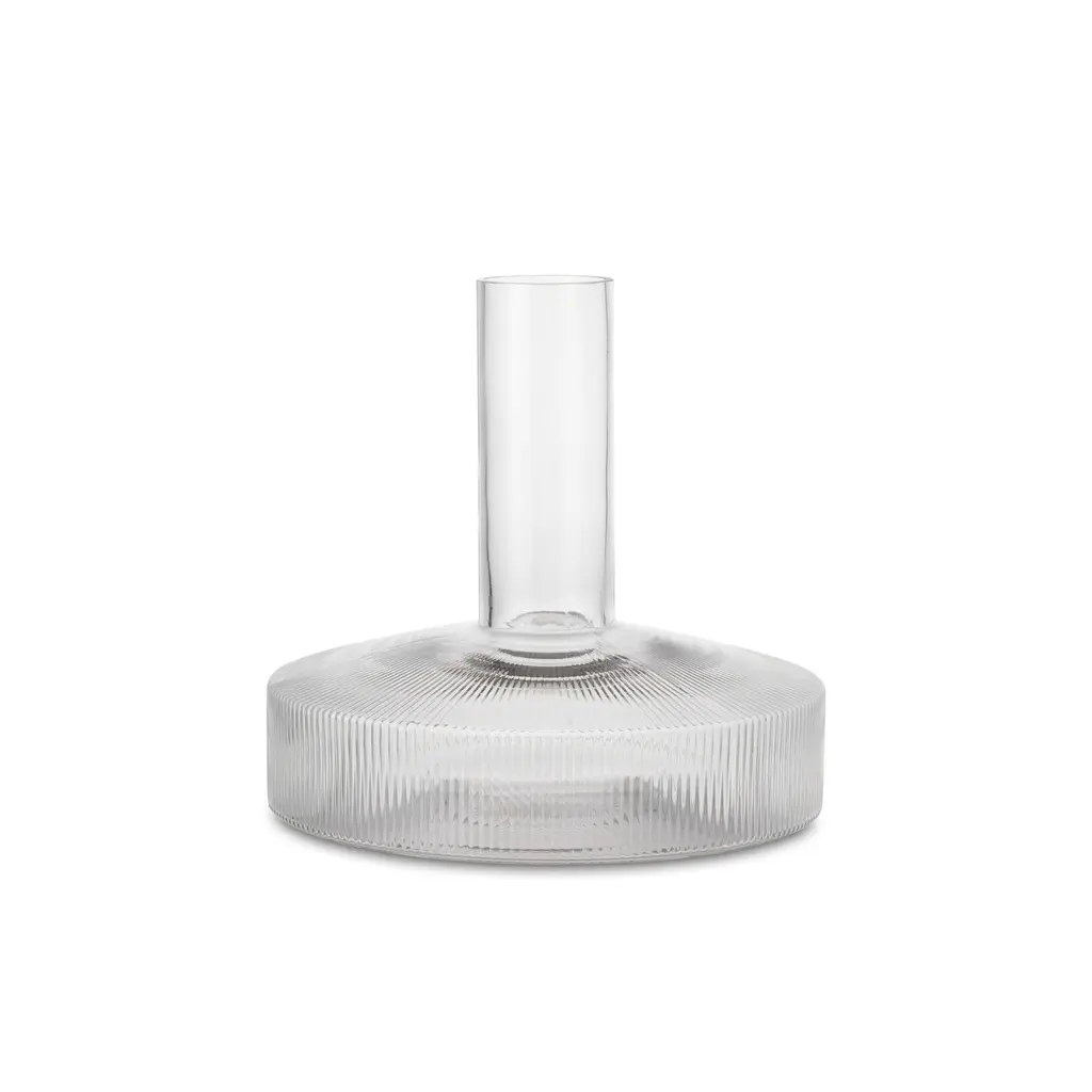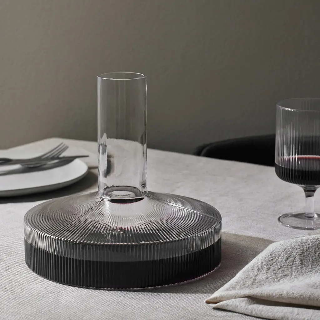 Fusing traditional craftsmanship with eye-catching style, the Ferm Living Ripple Wine Carafe brings a sophisticated accent to your dinner table setting and wine serving rituals. Manufactured with a blend of handmade techniques and laser cutting, every Ripple decanter is one-of-a-kind and crafted to last. A rippled pattern adds a beautiful texture to the clear glass while enhancing the beauty of red wine. The wide, circular body provides the perfect aeration area for wine, offering a capacity of 1.1 L or 37.02 fl oz. Likewise, the large cylindrical neck accelerates aeration and also ensures a smooth pour. Every Ferm Living Ripple Wine Carafe is carefully made and finished by hand in a process that can take up to 24 hours.