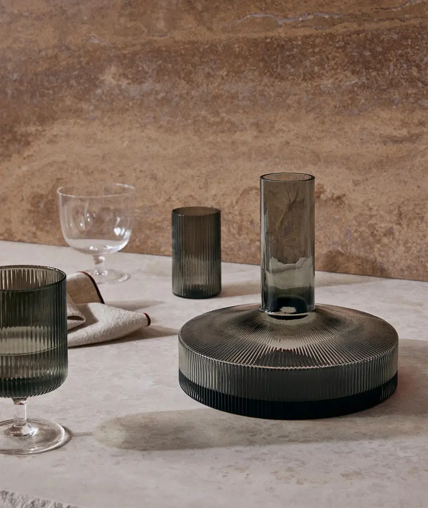 Mouth-blown into the mold, this practical and beautiful wine carafe boasts a contemporary rippled design. Meticulously crafted to elevate the natural aeration process of your wine, the carafe provides ample surface area and is designed to decant one liter of wine, while still accommodating larger volumes if desired.
