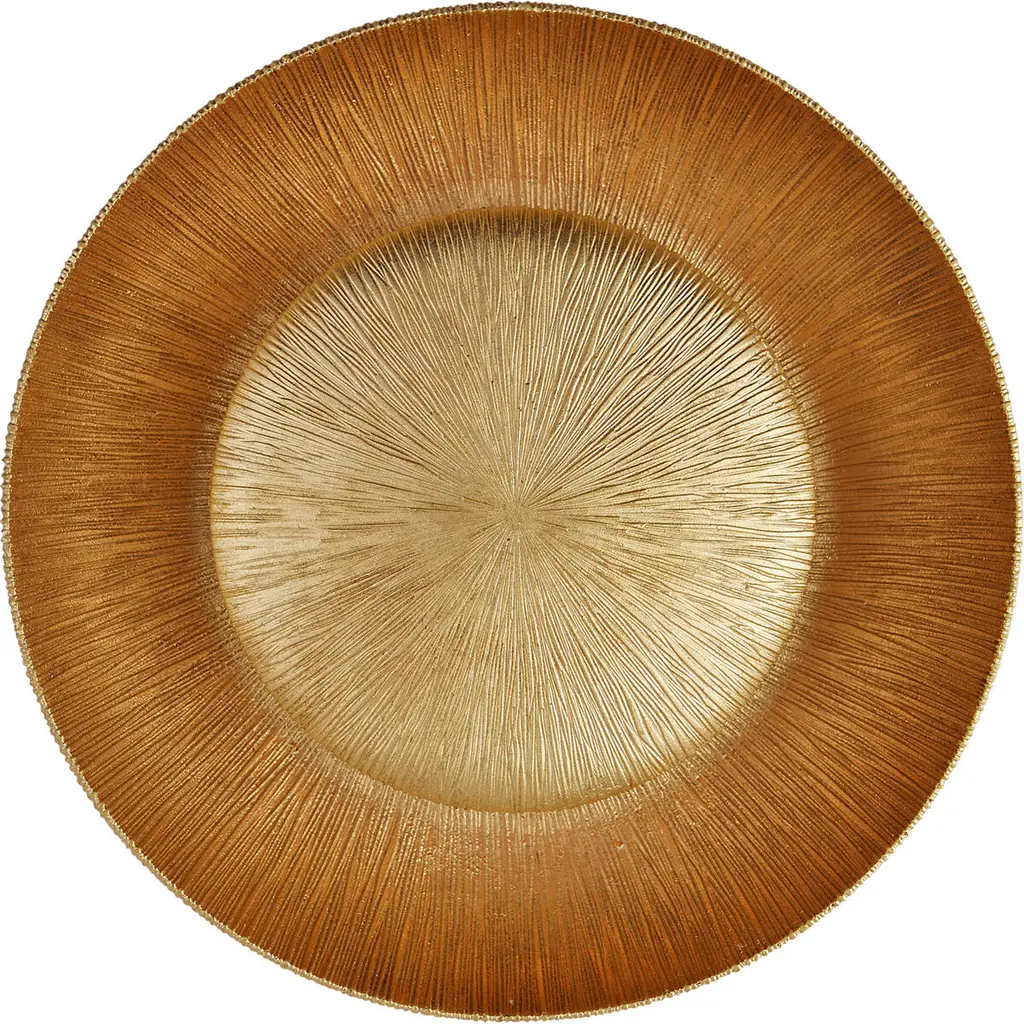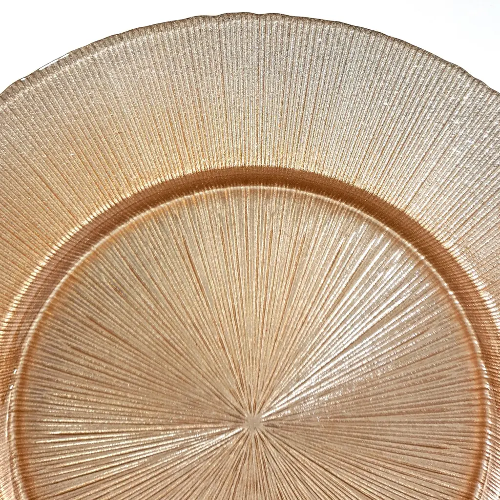 Impress your guests when you dish up on this beautiful stripe textured plate with glitter details on the rim. Crafted in glass, this 13" charger plate will complete your table setting with its sophisticated design. Perfect for adding a rich yet organic look to your dinner parties or your wedding, baby shower and party buffets