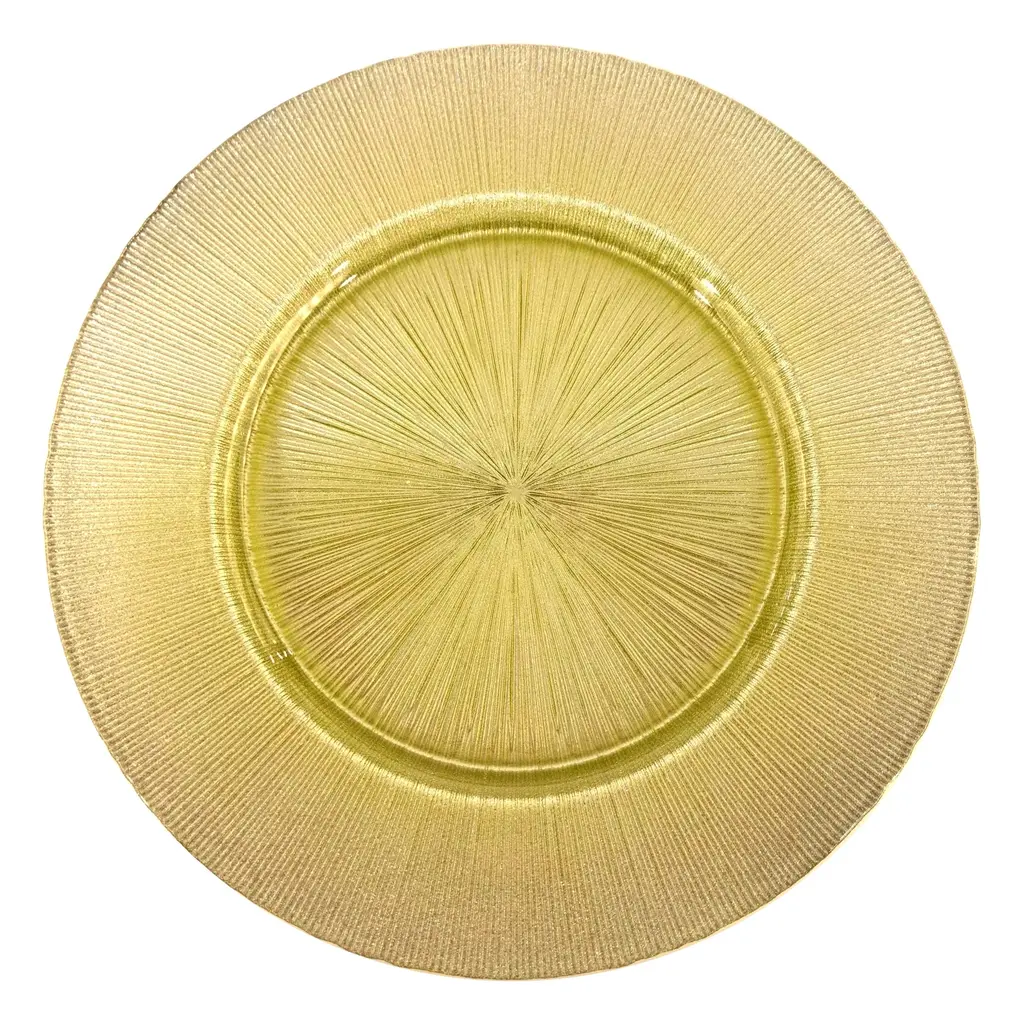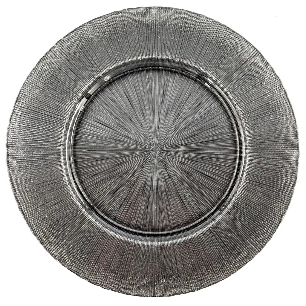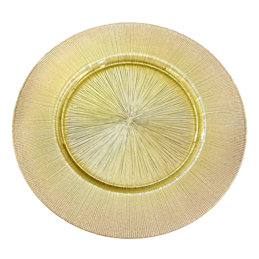 Impress your guests when you dish up on this beautiful stripe textured plate with glitter details on the rim. Crafted in glass, this 13" charger plate will complete your table setting with its sophisticated design. Perfect for adding a rich yet organic look to your dinner parties or your wedding, baby shower and party buffets