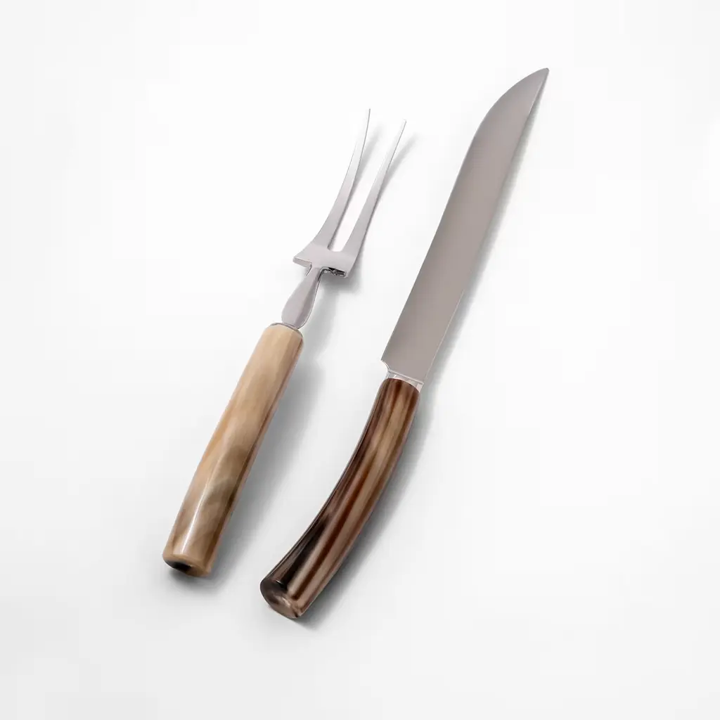 The Roast Cutlery Set in Natural Horn elevates the dining experience with its exquisite design and premium functionality. This set includes a roast knife measuring 350 mm and a roast fork at 290 mm, expertly crafted to deliver precision and elegance. The handles, made from natural horn, showcase unique patterns and shades, ensuring that each piece is distinctive. Experience culinary artistry with a blend of practicality and aesthetic appeal. Part of the Classic Collection.