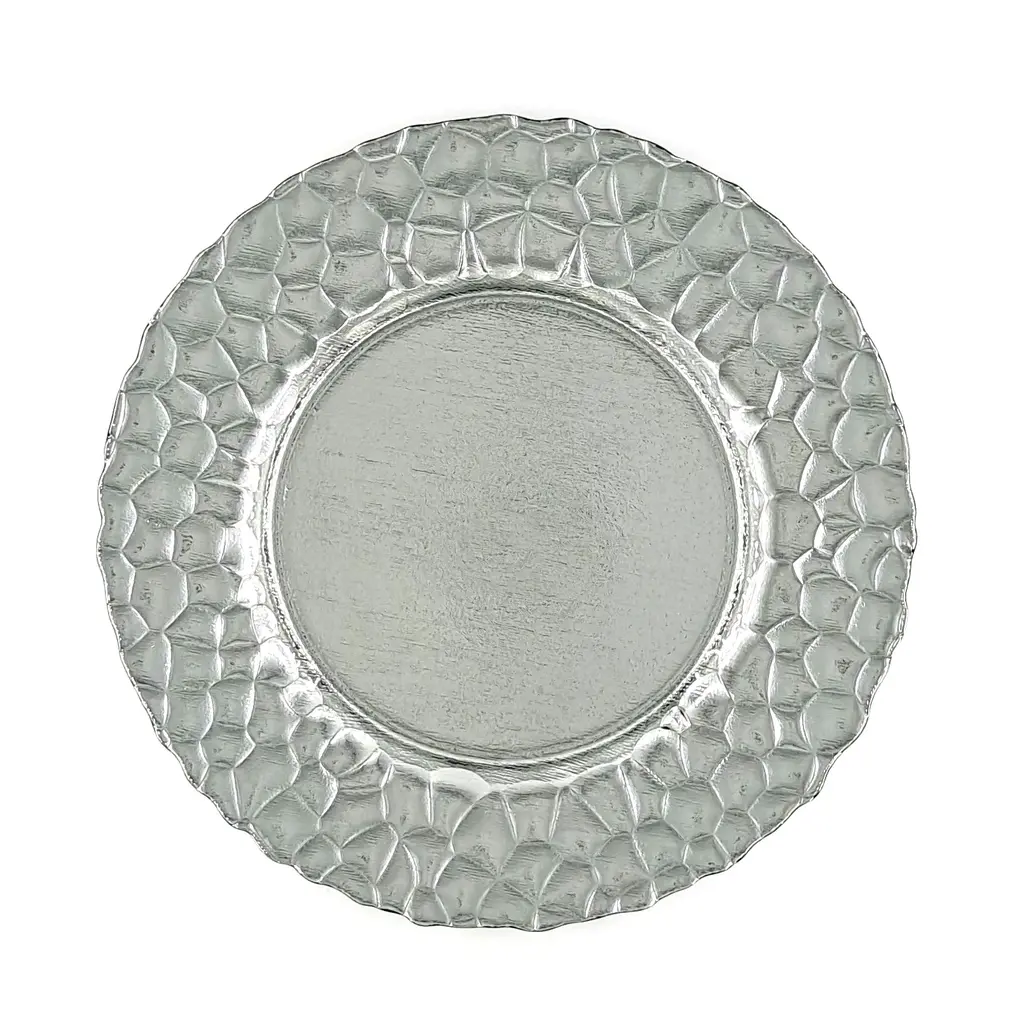 Sleek and bold design of the ROCHER 13" glass charger plate is expressed with a gold / silver metal finish to result a glamorous addition to any dinner setting. The abstract pattern on the rim and the hammered center finished in shimmering metal color combine industrial and chic looks on this plate. Perfect for adding a rich yet organic look to your dinner parties or your wedding, baby shower and party buffets