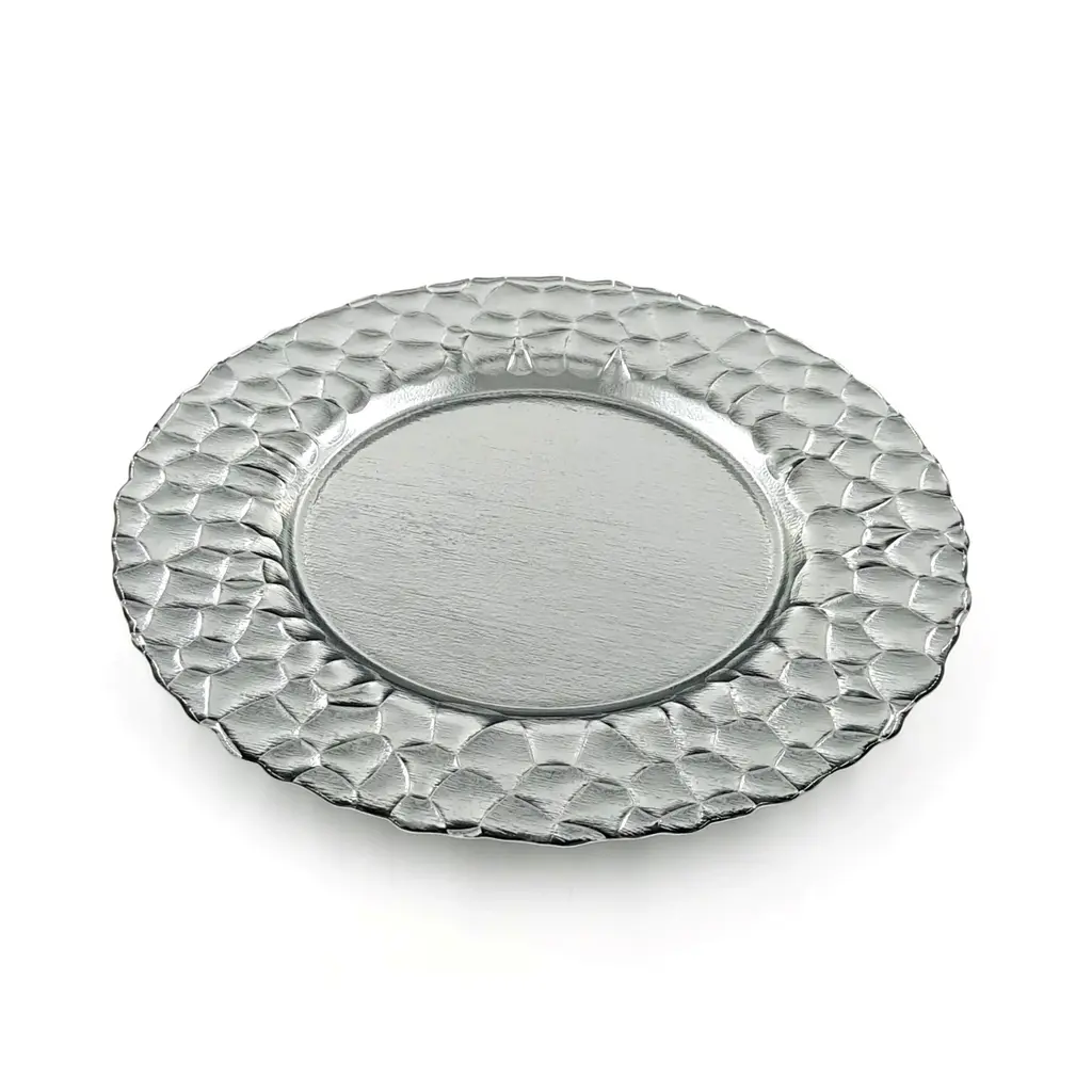 Sleek and bold design of the ROCHER 13" glass charger plate is expressed with a gold / silver metal finish to result a glamorous addition to any dinner setting. The abstract pattern on the rim and the hammered center finished in shimmering metal color combine industrial and chic looks on this plate. Perfect for adding a rich yet organic look to your dinner parties or your wedding, baby shower and party buffets