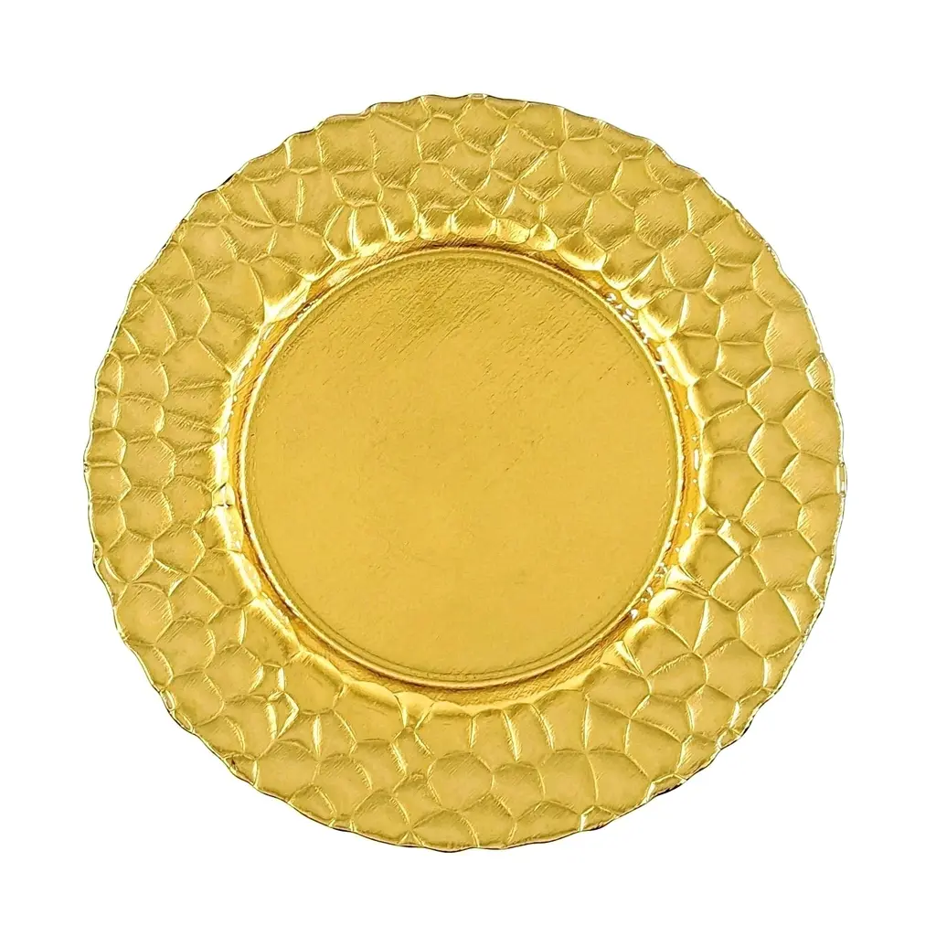 Sleek and bold design of the ROCHER 13" glass charger plate is expressed with a gold / silver metal finish to result a glamorous addition to any dinner setting. The abstract pattern on the rim and the hammered center finished in shimmering metal color combine industrial and chic looks on this plate. Perfect for adding a rich yet organic look to your dinner parties or your wedding, baby shower and party buffets