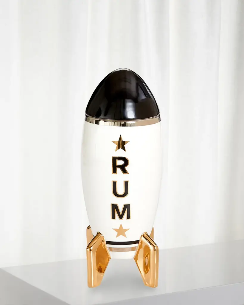 Space Race Chic. Send spirits into orbit with our retro-rad black and 16-karat gold luster porcelain decanters. Embellished with bold suggestions of what to stash in each—even bottom shelf booze becomes out-of-this-world. Equipped with hard-working gaskets for optimal spirit storage. A stylish sophisticate deserves a fully styled bar to match. Corral with our Gin, Vodka, and Whiskey Rocket Decanters and have a blast.