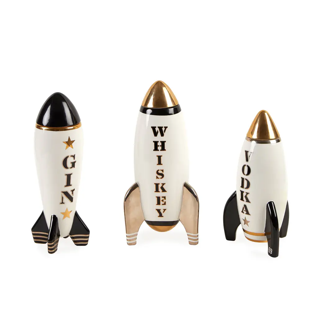 Space Race Chic. Send spirits into orbit with our Space Age porcelain Rocket decanters. Featuring real gold luster, each is embellished with Soviet era inspired typography—even bottom shelf booze feels out-of-this-world. Equipped with hardworking gaskets for optimal spirit storage. A stylish sophisticate deserves a fully styled bar to match: collect them all.