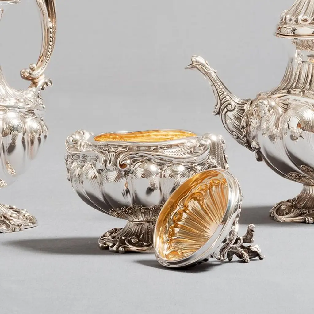 Rococo Style Tea Set, Sterling Silver 3 Pieces Set, Made In Italy