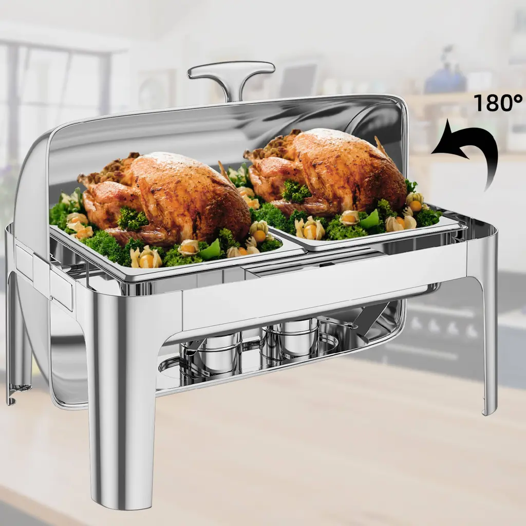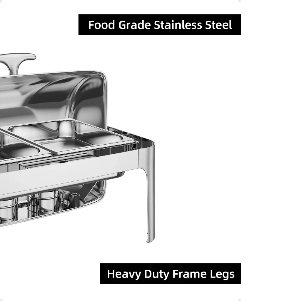 【Sleek and Sturdy Stainless Steel Construction】Crafted from high-grade stainless steel, this food warmer boasts a combination of style and durability. The robust steel material has been thickened to ensure longevity and improved heat retention, providing a reliable solution for keeping party dishes warm.【Efficient Temperature Control for Fresh Foods】Equipped with fuel holders, this chafing dish enables you to effortlessly maintain the perfect temperature for a variety of dishes, while preserving their delicious flavors. Additionally, the water tray can be utilized with ice to keep foods fresh and cool, offering versatile serving options.【Adjustable Roll-Top Lid Design for Convenient Access】The roll-top lid of this chafing dish buffet set can be locked at 90 or 180 degrees, offering easy access from all sides. This innovative feature helps to retain warmth and moisture, ensuring that your dishes stay delicious and inviting throughout your event.