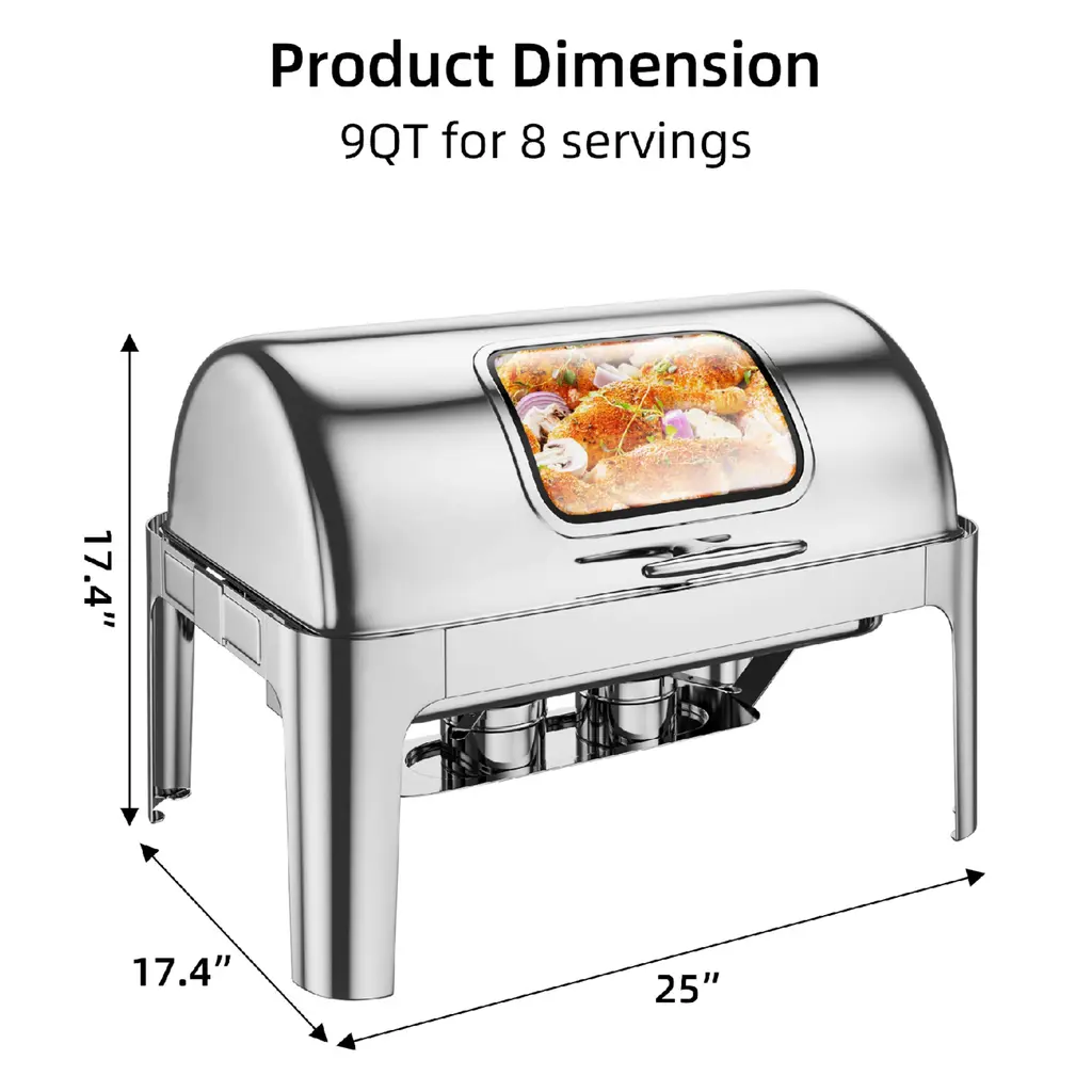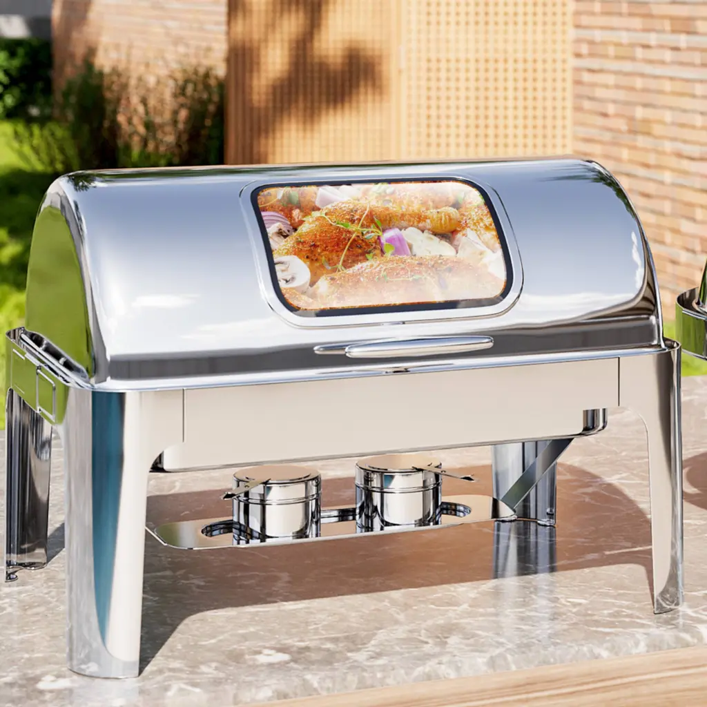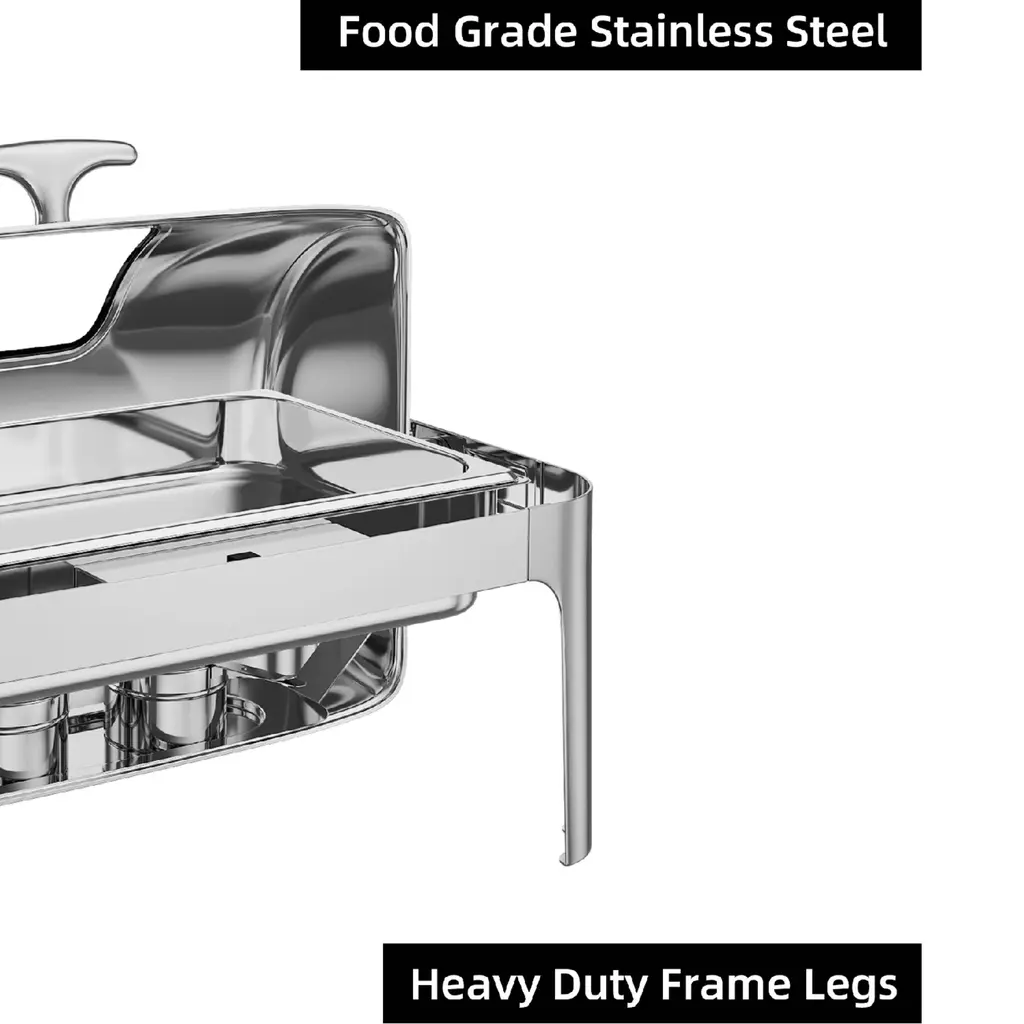 Superior Material: The roll top chafing dish buffet set is constructed entirely of high-quality stainless steel, ensuring durability and ease of cleaning.Temperature Control: Maintain the perfect temperatures of your dishes with the fuel holders, ensuring that your foods stay warm and fresh for your guests.Visual Appeal: The chafing dish buffet set features a clear window lid, allowing guests to view the dishes without lifting the cover and creating an attractive presentation.Versatile Usage: Ideal for restaurants, buffets, catering, schools, and corporate events, this chafing dish set adds a professional touch to any occasion.Effortless Cleaning: The stainless steel construction is resistant to stains and odors, making cleaning a breeze. The detachable pans can be cleaned separately for added convenience.